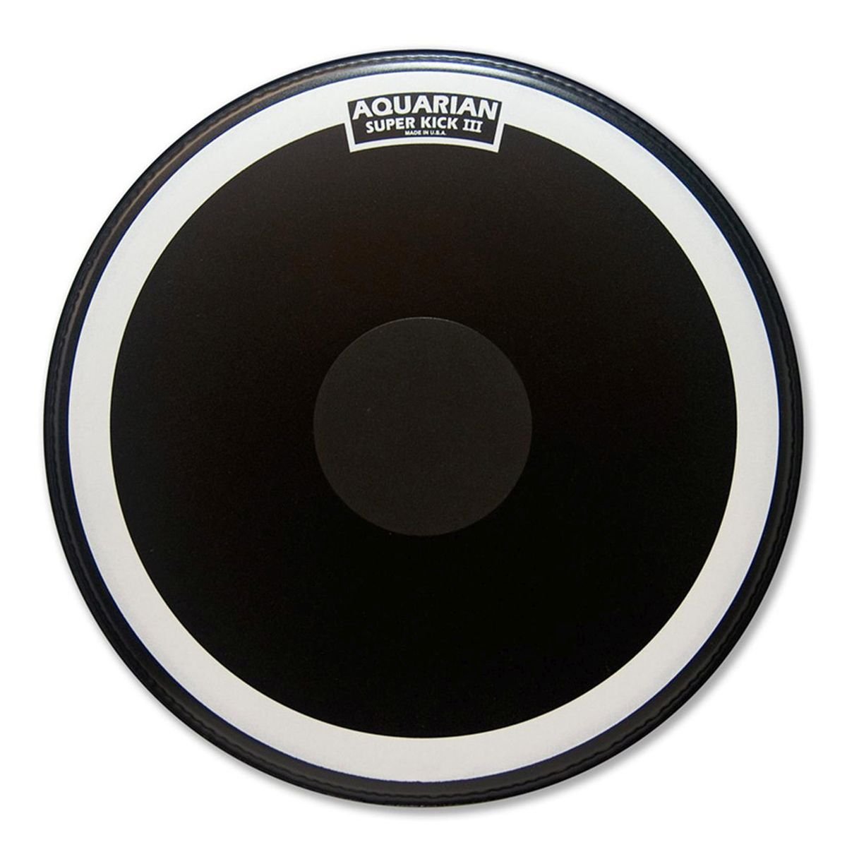 'SKIII22BK SUPER KICK III TEXTURE COATED WITH POWER DOT-BLACK 22 inch single-layer black leather with Super Kick III power dot (SKIIIBK) a 10 mil single-layer Super Kick bass drum skin with a large power dot for added durability. SKIII has the same weight as a SKI but with a power dot and a black sandblasting for greater warmth. Often imitated, never duplicated, the Superkick bass drum skin line is an industry best seller and one of the favorites of drummers, drum technicians and sound engineers who want a musical, controlled bass drum sound without the use of blankets, cushions or external muting. The patented “Floating Muffling System” uses a narrow band of acoustic felt for a pre-muffled, yet natural sound. The felt moves and “breathes” with the drum skin, eliminating unwanted high frequencies and increasing the punch of low frequencies. SKIII adds a bit of low range to any bass drum with a well-defined and focused attack. The large Powerdot adds strength and power: Floating damping ring for harmonic control: Black sandblasted coating for greater heat'