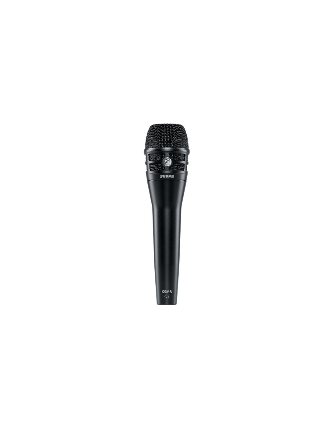 SHURE KSM8B is a dynamic dual diaphragm microphone with a moving coil in a cardioid polar pattern. Technical features include patented capsule design with 2 ultra-thin diaphragms and innovative reverse airflow technology, capsule coating in water repellent material for maximum protection against wind and moisture, diaphragm stabilization system (DSS) and integrated pneumatic shockmount. Includes microphone stand clip and case