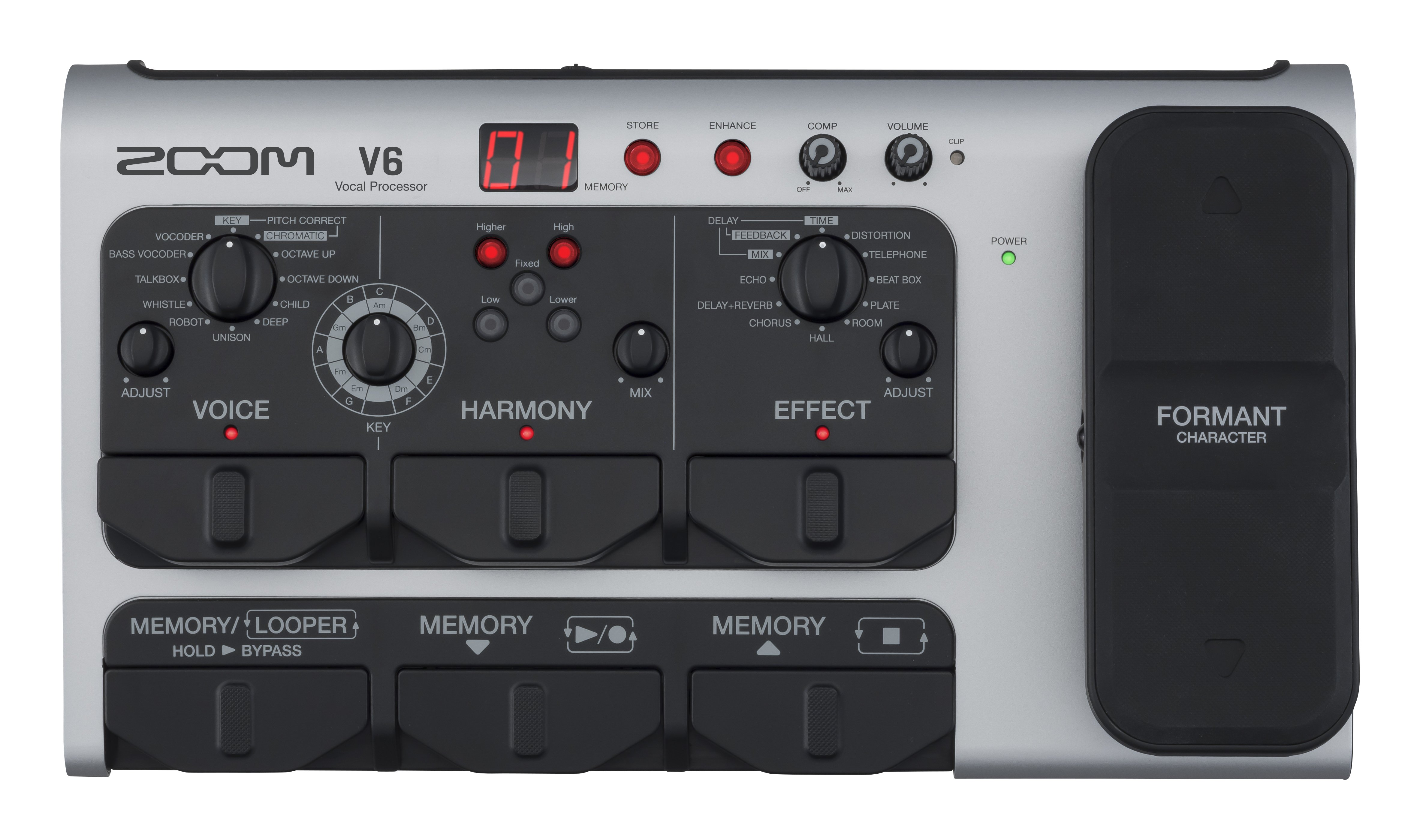 ZOOM V6-SP VOICE MULTIEFFECTS is a multi-effect voice processor in pedal board format. Technical features include, 10 studio-quality effects, 3 Voice, Harmony and Effect vocal processors, XLR microphone input, Formant Shift pedal to adjust the Voice character in real time, Looper to record up to 3:30 min, 40 pre-configured patches created by professional singers and audio engineers, 100 memory locations for storing user-created patches, built-in compressor for optimizing input signal levels, integrated enhancer for optimizing input signal frequencies through equalization and de-essing. It also has a USB 2.0 audio interface capable of recording up to 16/24/32-bit, 44.1 kHz, USB port, headphone output with dedicated volume control. It runs for 3.5 hours with four AA batteries or with the included AC adapter. The optional expression pedal offers advanced control over effect parameters