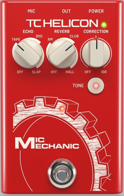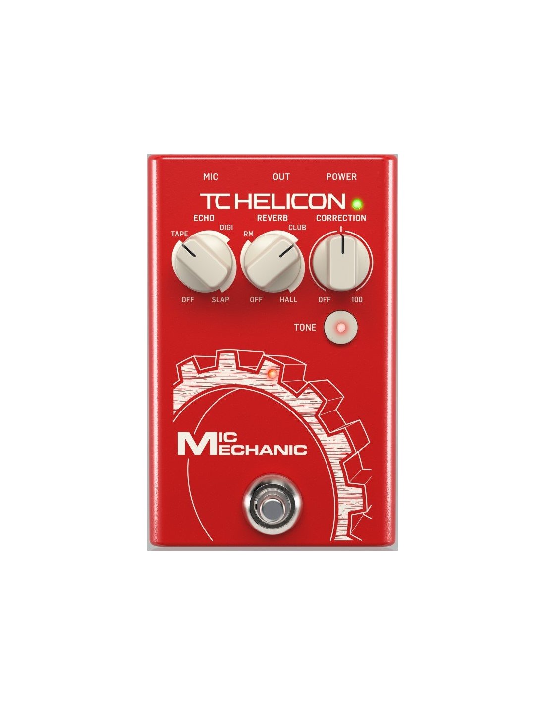 TC HELICON MIC MECHANIC 2. Voice pedal with reverb, delay and pitch correction effects. The technical features include 8 reverb presets and studio echo effects, Tone button for activating adaptive EQ, compression, De-esser and Gate, pitch correction with a range 0-100, phantom power supply +48V, input via microphone preamp on XLR, balanced XLR output, USB port for connecting to the VoiceSupport application for firmware updates, operation via a 9v power supply or with a 9v
