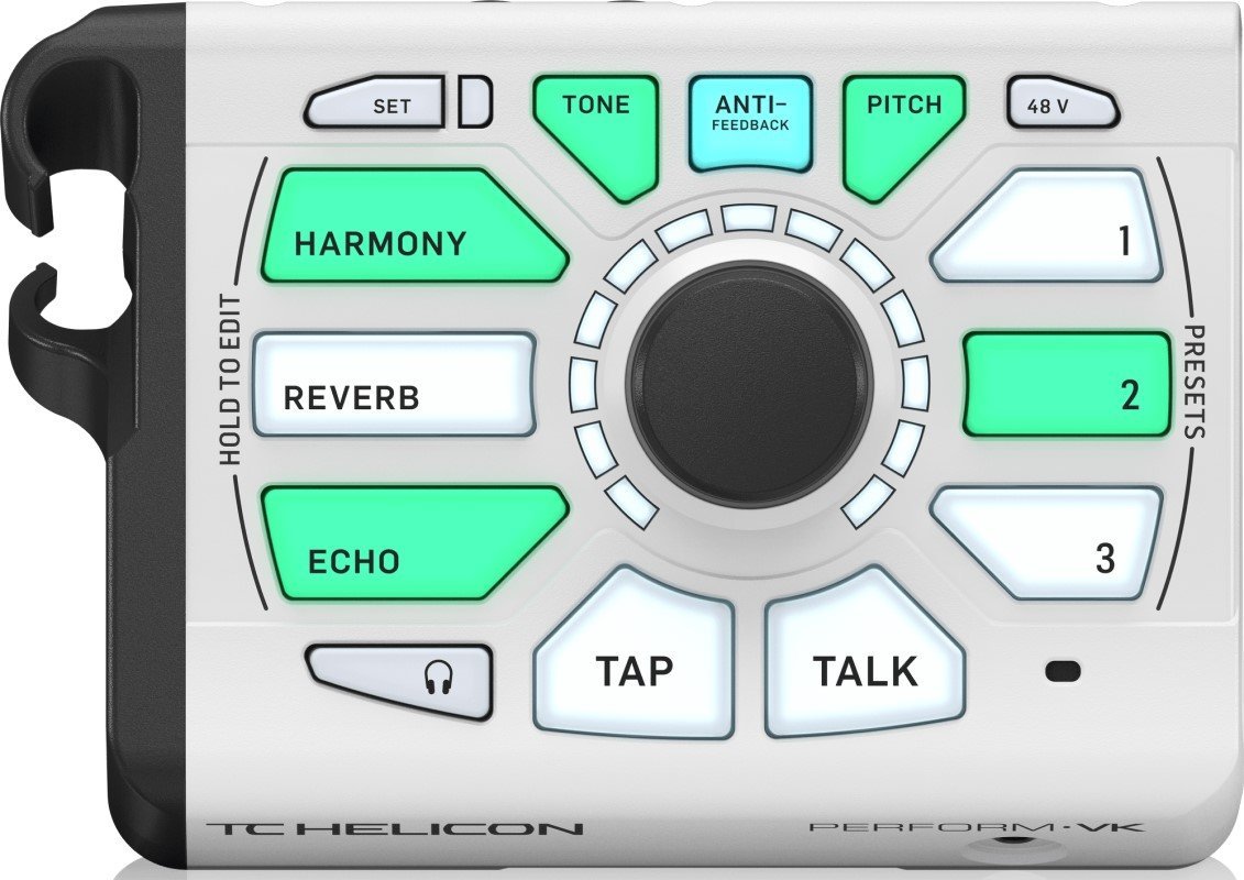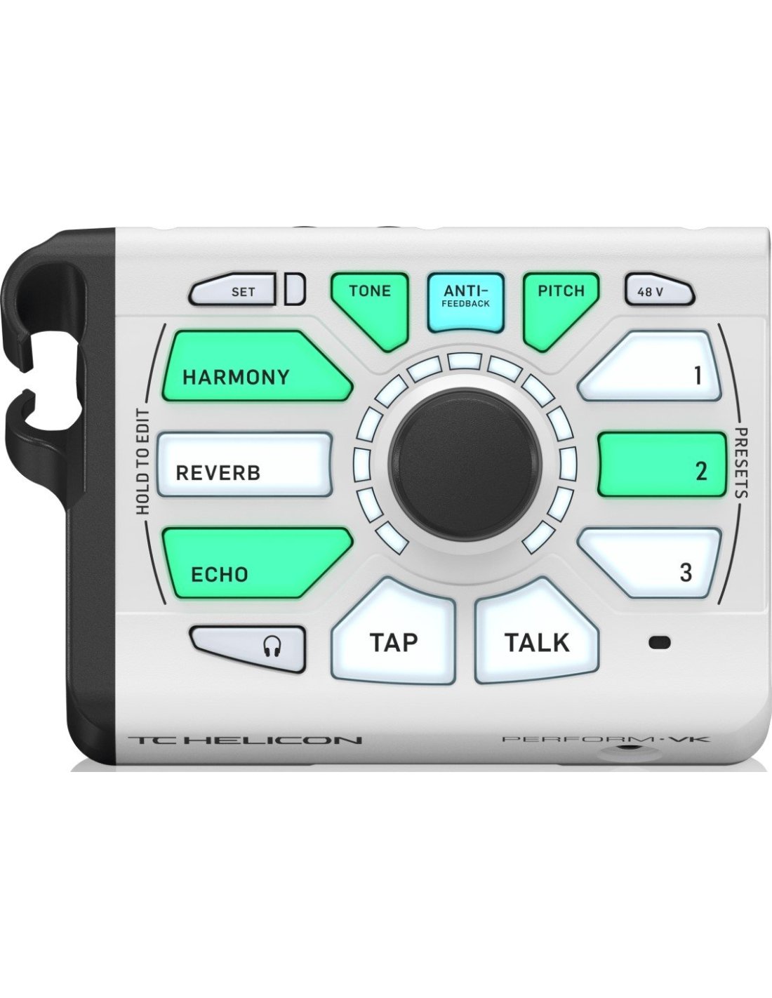 TC Helicon Perform VK is an effects processor for voice and keyboard. It allows you to add harmony voices created from the chords played on the keyboard. Echo and reverb effects simulate the addition of physical space. It is equipped with an anti-feedback button that protects against unwanted microphone noises, phantom power, automatic chromatic pitch correction, multi-track USB audio interface with 4 inputs and 8 outputs, Mic Control that provides remote access through TC Helicon MP-75 and MP-76 microphones