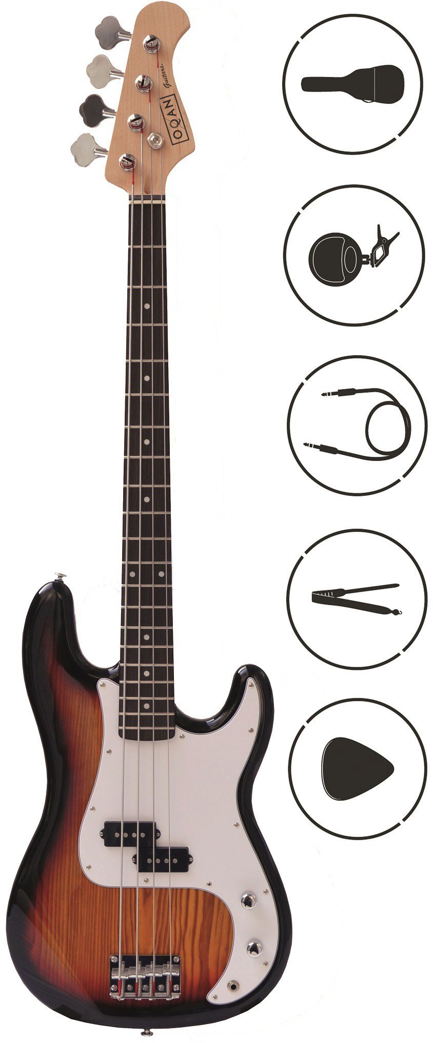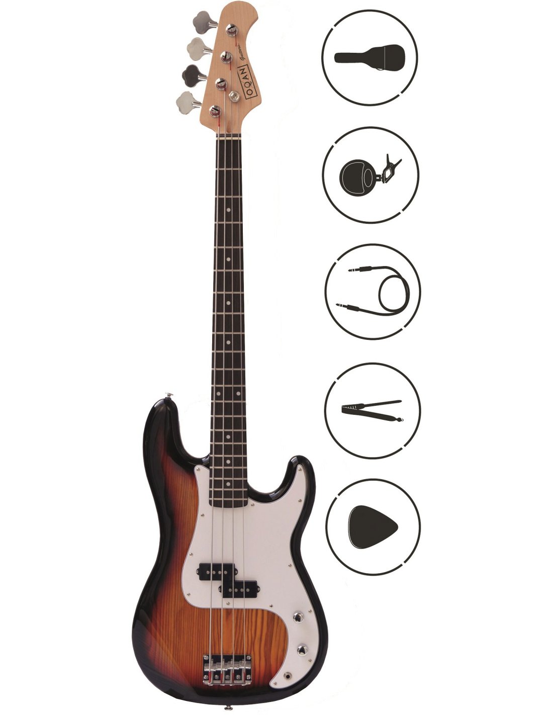 Electric bass pack. Includes Precision Bass type bass and accessories. Bass with solid linden body. 21 fret maple keyboard. 'Rosewood' compound neck. 1 PB pickup. Vintage bridge. 1 volume control, 1 tone control. Vintage style scoop Accessories included: case, digital tuner, cable, strap and 3 picks