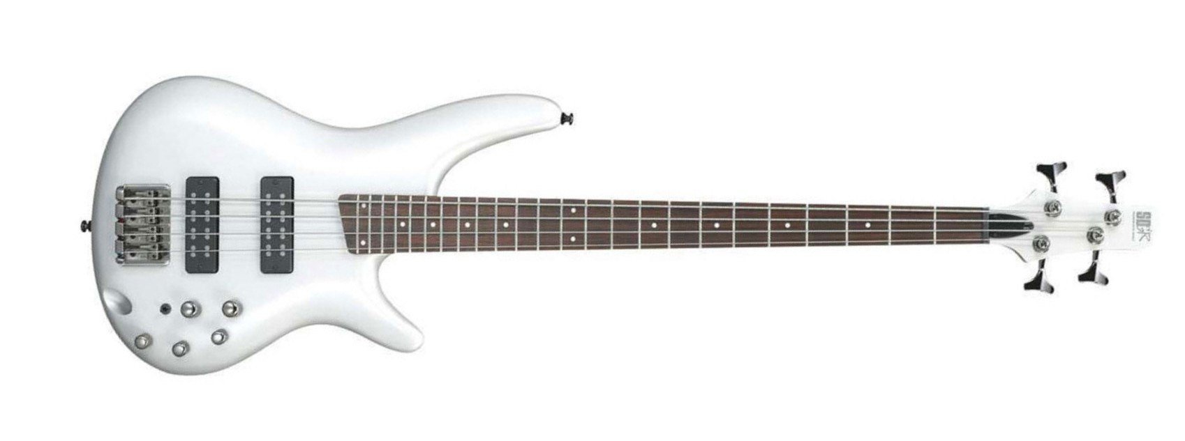 Ibanez SR300E-PW Electric Bass Guitar color PEARL WHITE. The Ibanez SR300E-PW is a 4-string electric bass guitar. Technical features include mahogany body, SR4 5pc maple and rosewood neck, rosewood fingerboard, 24 medium frets, Accu-cast B120 bridge, PowerSpan Dual Coil pickup (neck/bridge), Volume controls, Balancer, 3-band EQ w/3