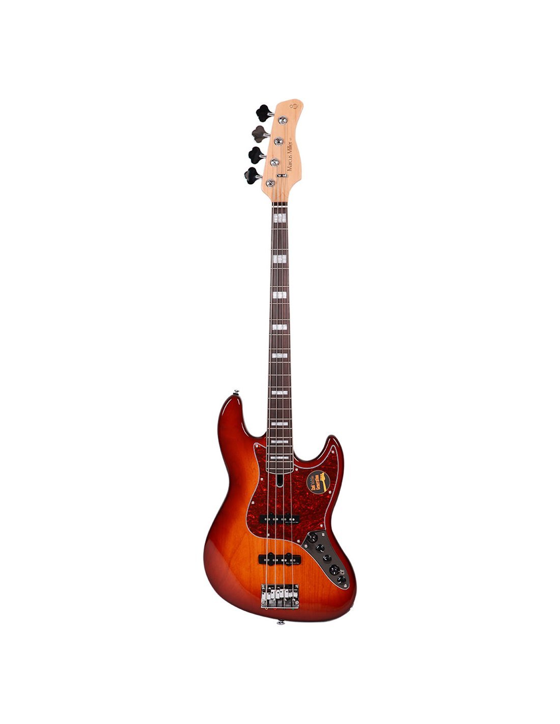 Marcus Miller V7 4 Alder TS 2nd Generation Electric Bass Guitar color TOBACCO SUNBURST. The Marcus Miller V7 4 Alder TS 2nd Generation is a 4-string electric bass designed in collaboration with bassist Marcus Miller. Technical features include alder body, maple neck with “C” Shape profile, ebony fingerboard with Block inlays, radius 9.5", 20 medium frets, Marcus Super-J Revolution Set pickup, Marcus Heritage-3 w/Middle Frequency Control electronics, Volume, Tone (Dual Pot) controls, Blender, Treble, Middle, Middle Frequency (Dual Pot), Bass, Mini Toggle (Active/Passive), Marcus Miller