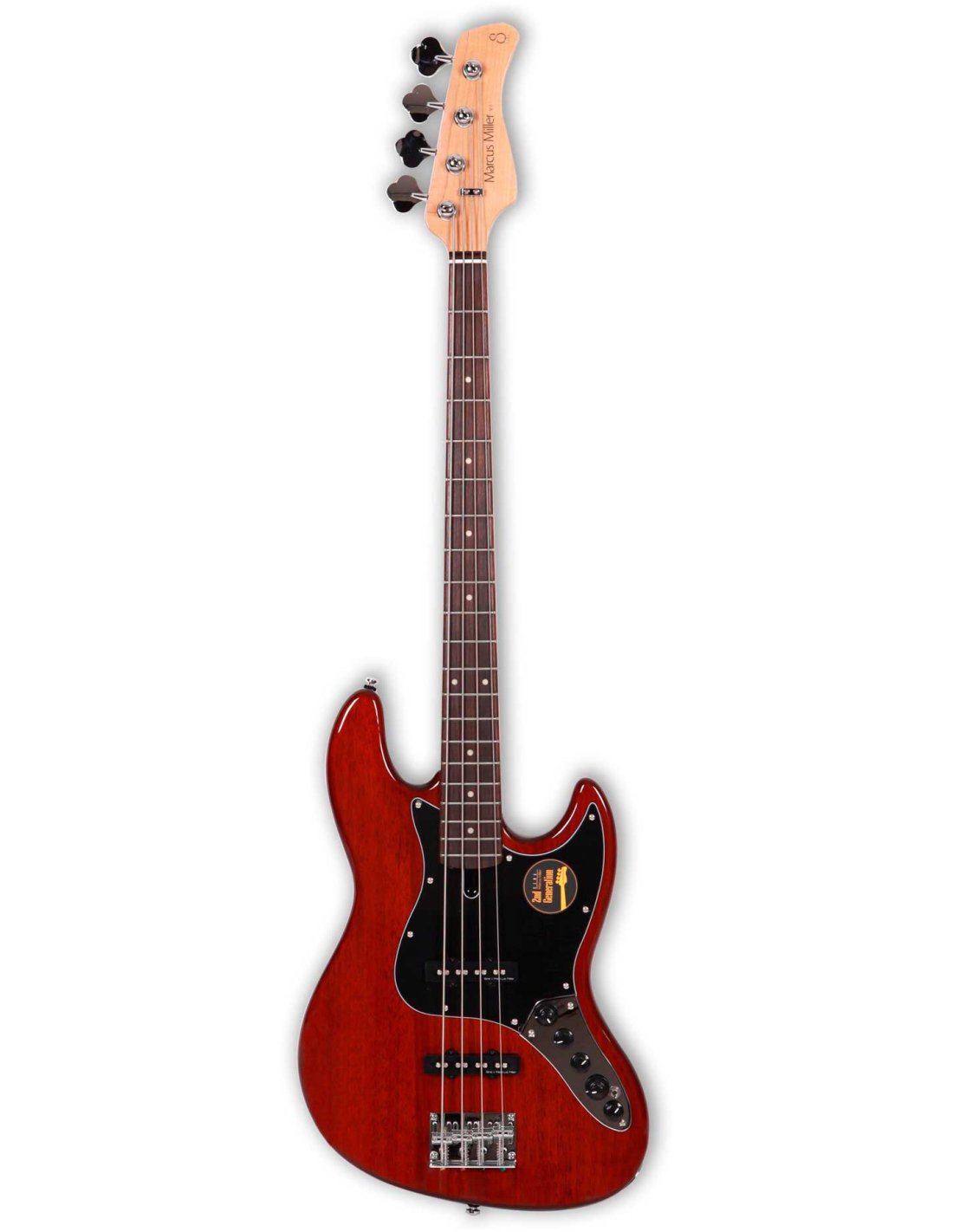 'Marcus Miller 2nd Gen. Bass. Body: Mahogany. Format: New Jazz Type Marcus Miller. Handle: Canadian Maple. Handle profile: C profile Scale: 34”. Fingerboard: Rosewood with rounded edges. Radius, 9.5”. Keys: 20, Medium Small. Nut: Bone, 38mm. Inlays: White mother-of-pearl Dot. Handle joint: Square 4-bolt steel plate. Pickup: Marcus Super-J Revolution. Electronics: Marcus Heritage-3 with mid-frequency control. Controls: Volume/Tone (Dual Pot) Blender Treble Mid/Medium Frequency Pickup (Dual Pot) Bass, Mini Toggle (Active/Passive). Knob: Jazz Type in black plastic. Bridge: Marcus Miller Standard with Thru Hole holes. Mechanics: Standard, Open. Hardware: Chrome plated. Pickguard: 3-layer black/white/black. Finish: Mahogany '