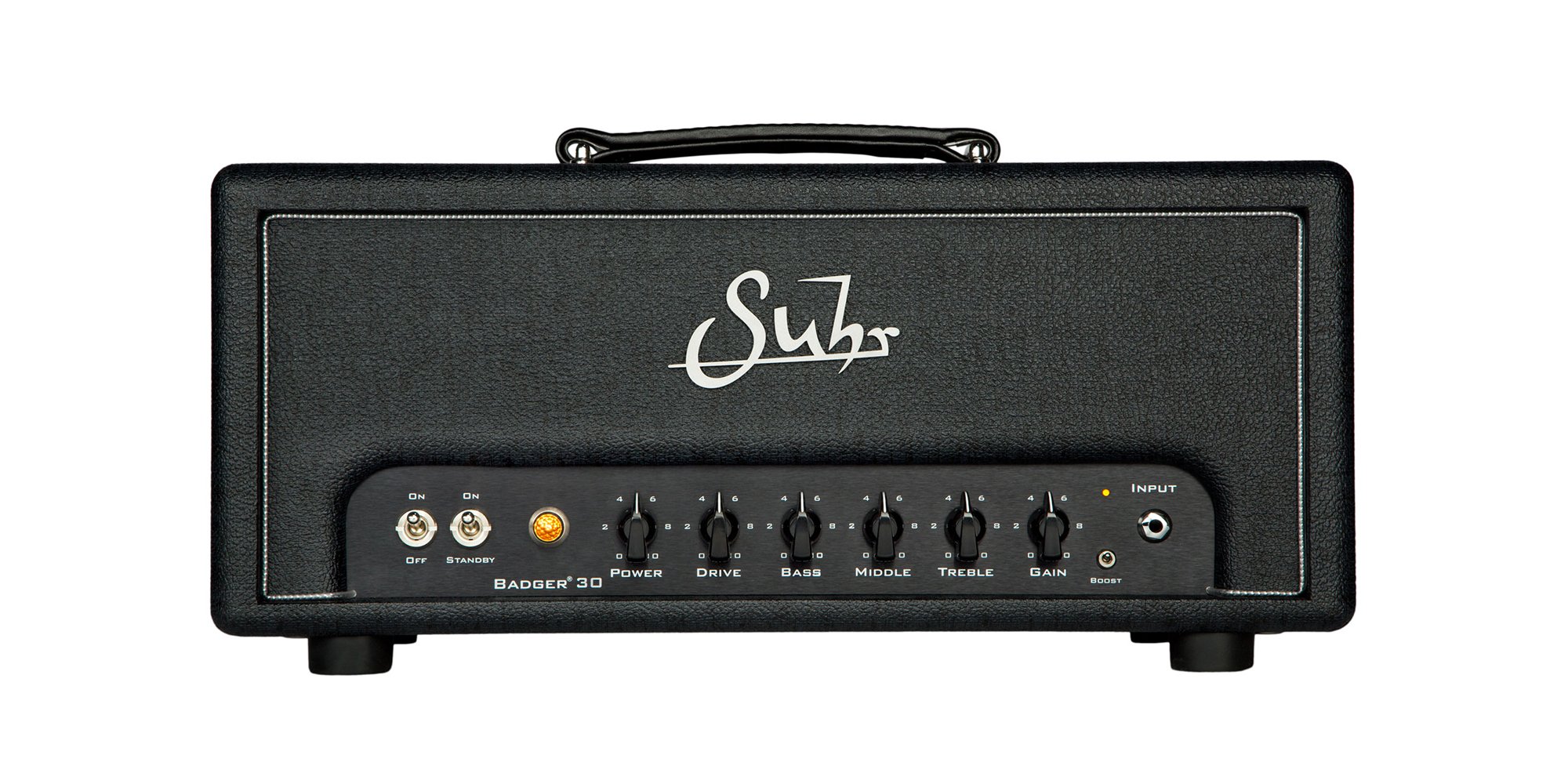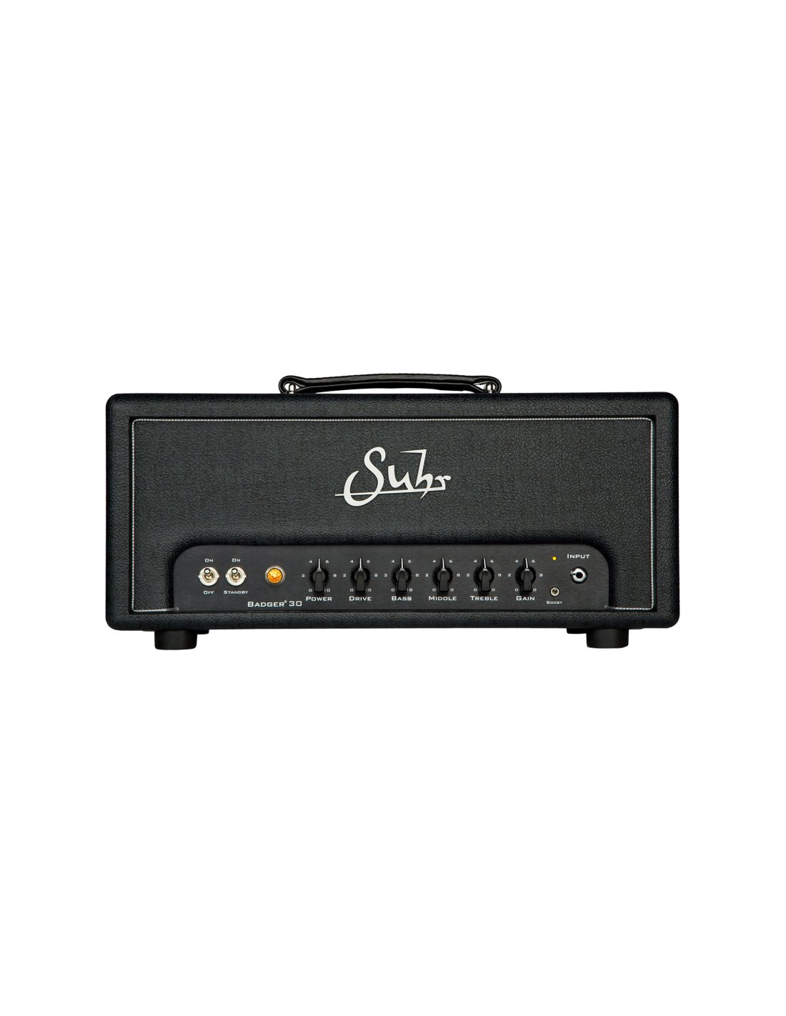 Suhr Badger 30W Head Black Electric Guitar Head. The Suhr Badger 30W Head Black is a 30 watt electric guitar tube head with 3 12AX7 tubes, 2 EL34 tubes, Power, Drive, Bass, Middle, Treble, Gain controls, effects loop