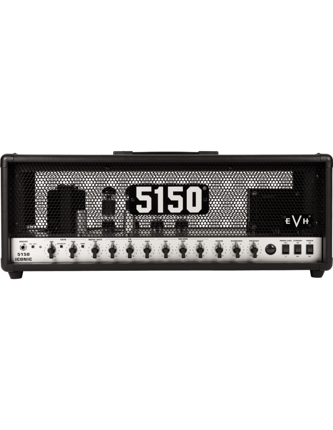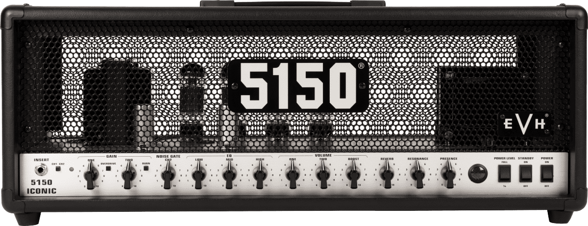 EVH 5150 ICONIC 80W HD BLACK. Guitar tube head. Technical features include 80W of power, 2 12AX7 preamp valves, 4 6L6 final valves, 2 channels with 3-band Eq (Low, Mid, High) with Resonance and Presence controls. Channel 1 has an overdrive button, while channel 2 has a Burn button for a very aggressive and present Crunch and the Noise Gate command to reduce background noise. Both channels have Gain and Volume controls with the Boost option to add another 10db