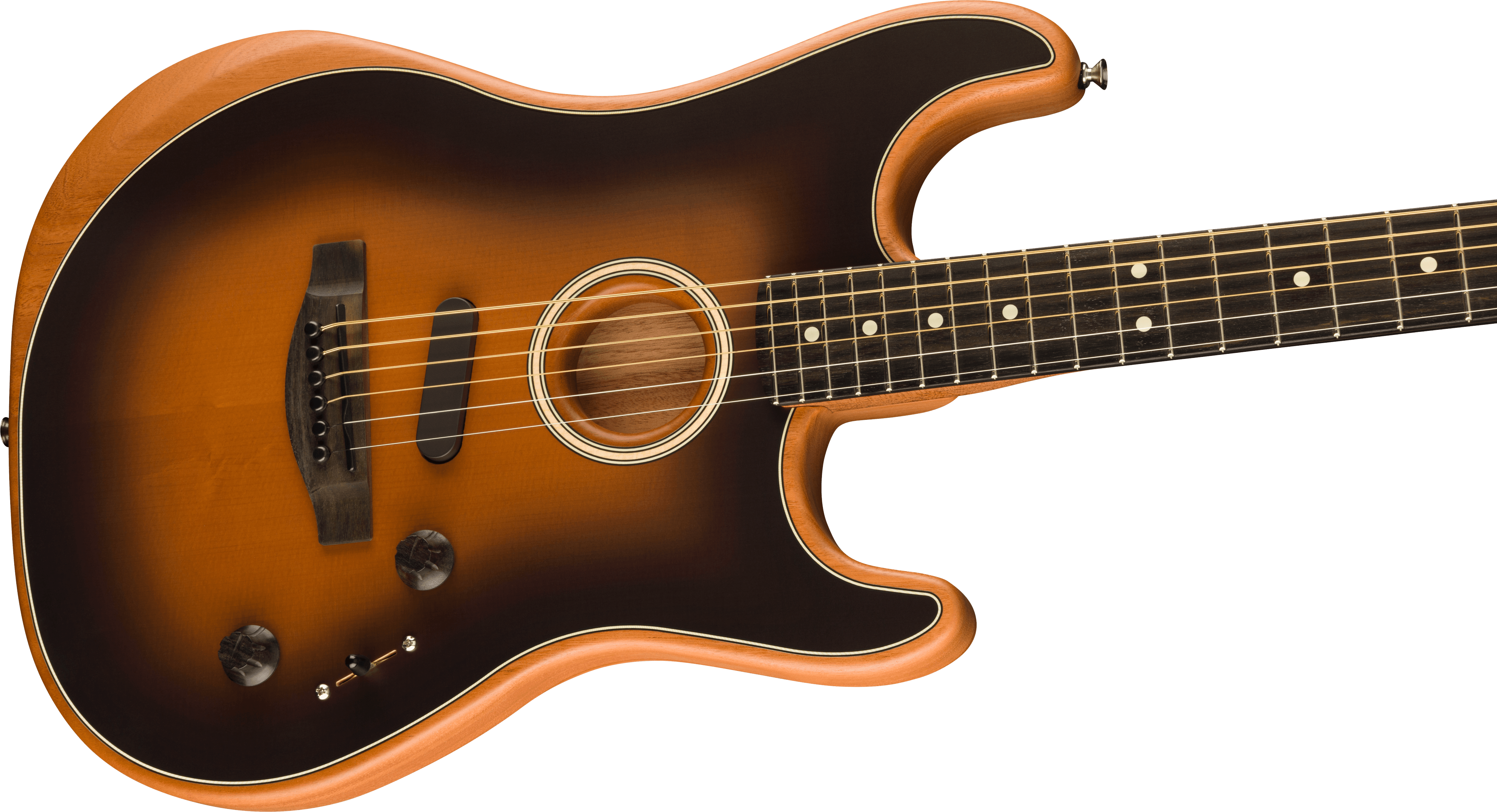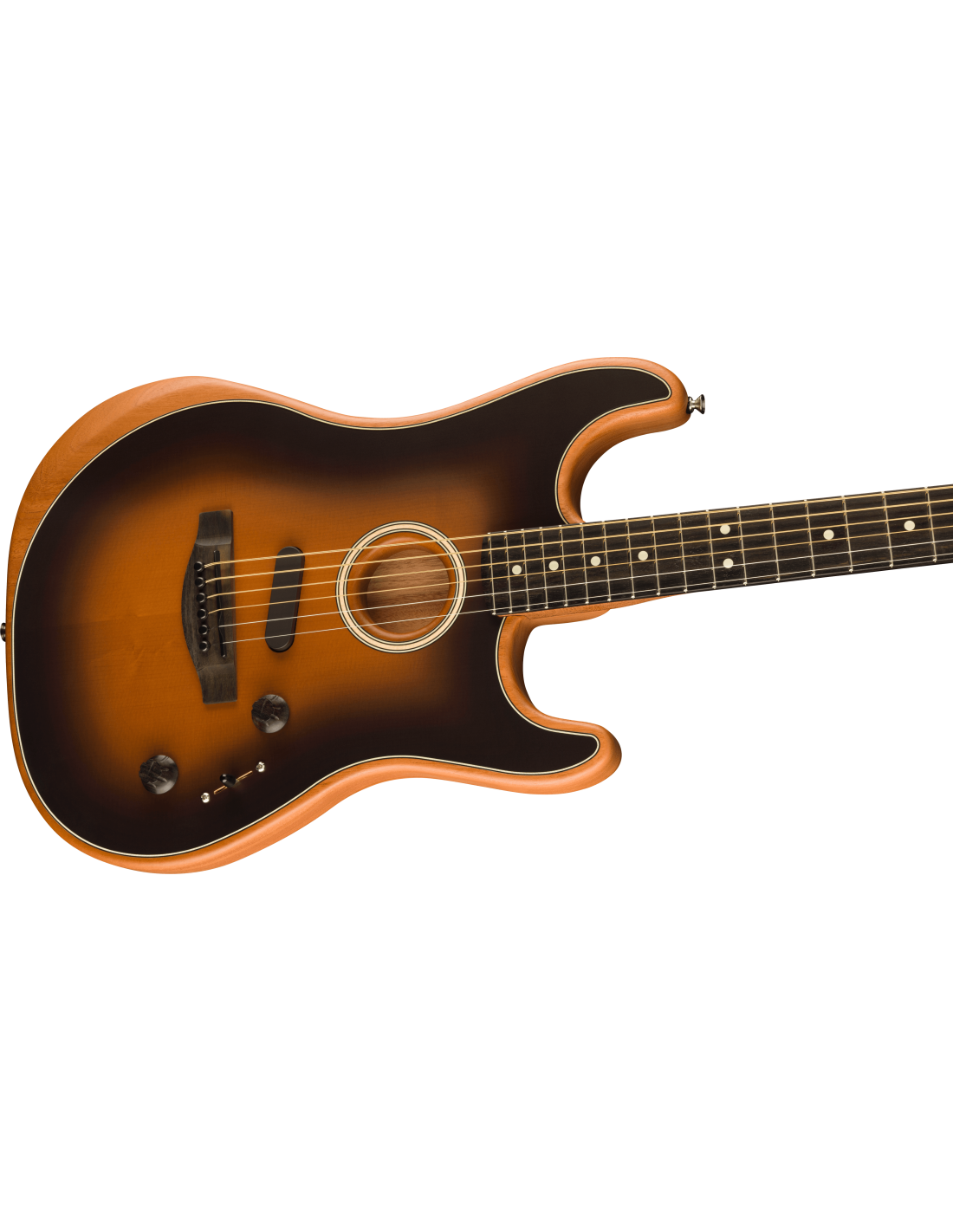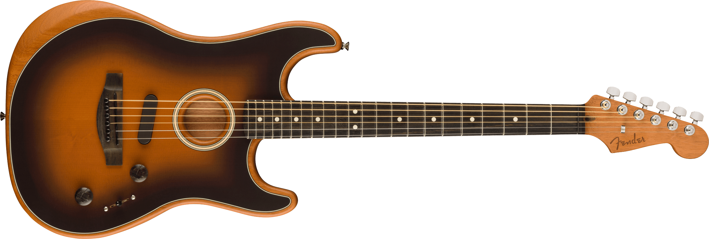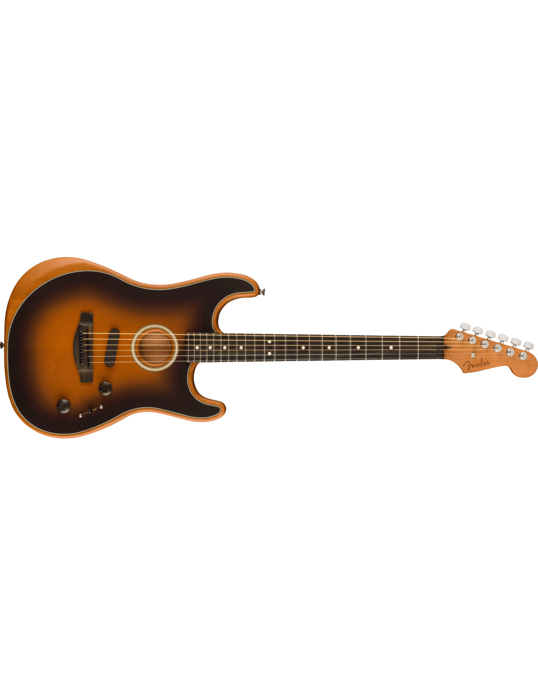 Fender LTD Acustasonic Stratocaster Electrified Acoustic Guitar, color 2 Color Sunburst. The Fender LTD Acustasonic Stratocaster is a limited-edition 6-string electrified acoustic guitar. It is equipped with a full-hollow Mahogany body with Sitka solid spruce top. Mahogany neck, Modern Deep C profile, 25 1/2” scale, with Ebony fingerboard, 12” radius, 22 Narrow Tall frets. The electronic part developed by Fender in collaboration with Fishman includes a piezoelectric pickup under the bridge, a sensor inside the body and an Acustasonic Noiseless N4 magnetic pickup. The controls are: Master Volume, Blend and 5-position selector that select different combinations between the three pickups. Die-cast, chrome-plated mechanics. Deluxe Gig-Bag included