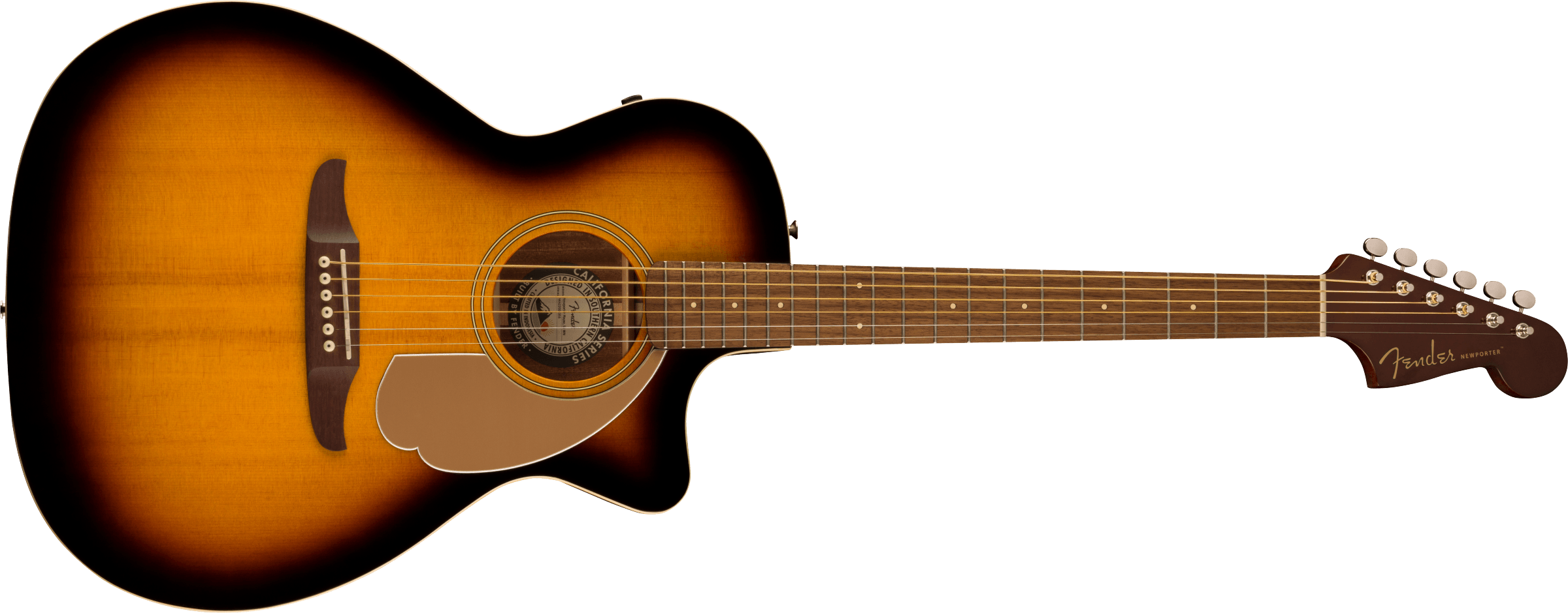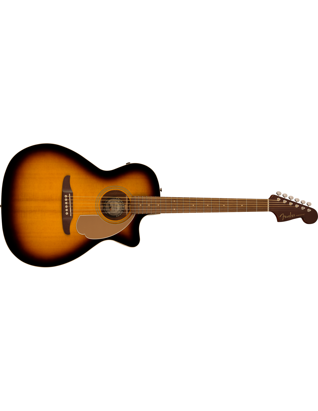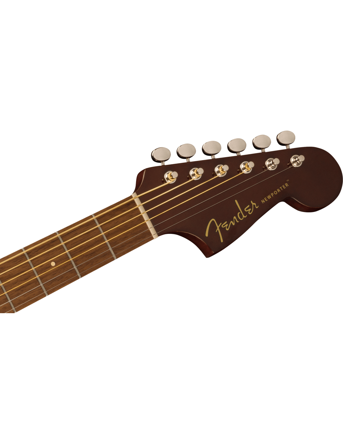 Fender Newporter Player Electrified Acoustic Guitar, Sunburst color. The Fender Newport Player is a 6-string electric missing shoulder acoustic guitar. It features a solid spruce top with X-chains, Sapele back and sides. Nato handle with Slim C profile, 25 1/2” scale, with walnut fingerboard, 20 frets. Black pickguard. Fishman Flex electronics, with Volume, Tone and Phase controls. Vintage-style mechanics