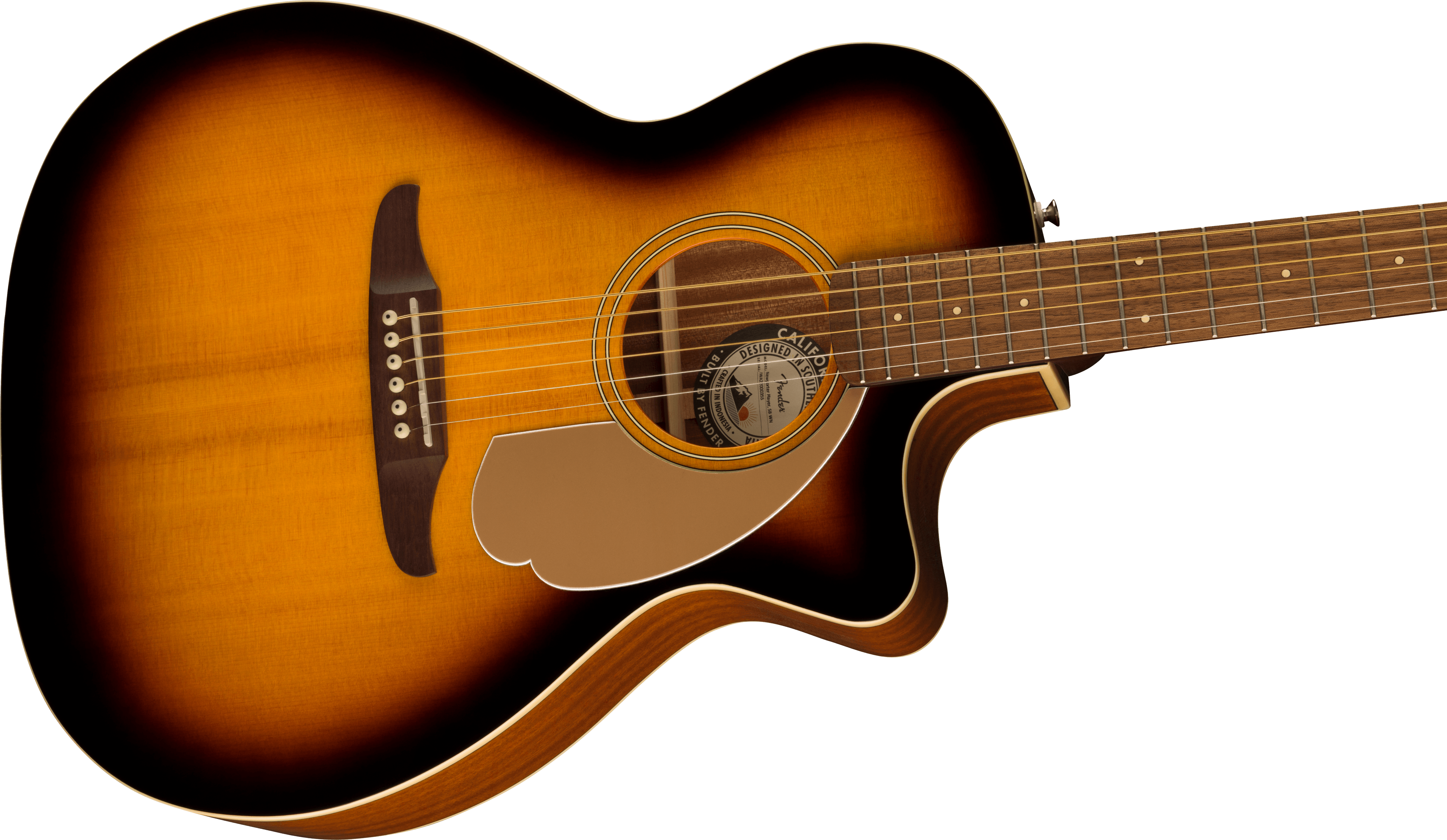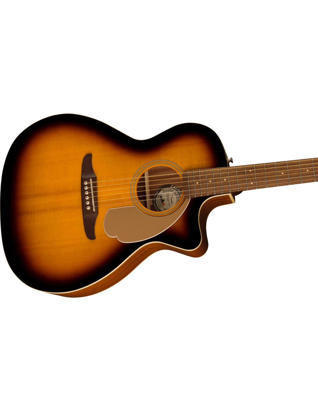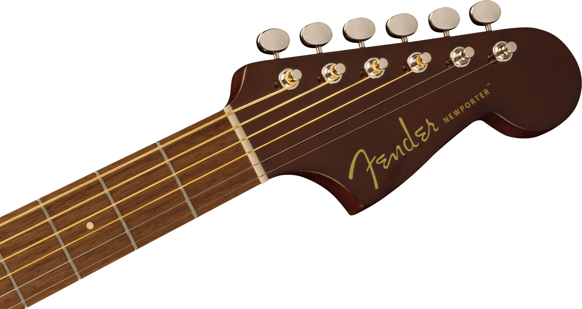 Fender Newporter Player Electrified Acoustic Guitar, Sunburst color. The Fender Newport Player is a 6-string electric missing shoulder acoustic guitar. It features a solid spruce top with X-chains, Sapele back and sides. Nato handle with Slim C profile, 25 1/2” scale, with walnut fingerboard, 20 frets. Black pickguard. Fishman Flex electronics, with Volume, Tone and Phase controls. Vintage-style mechanics