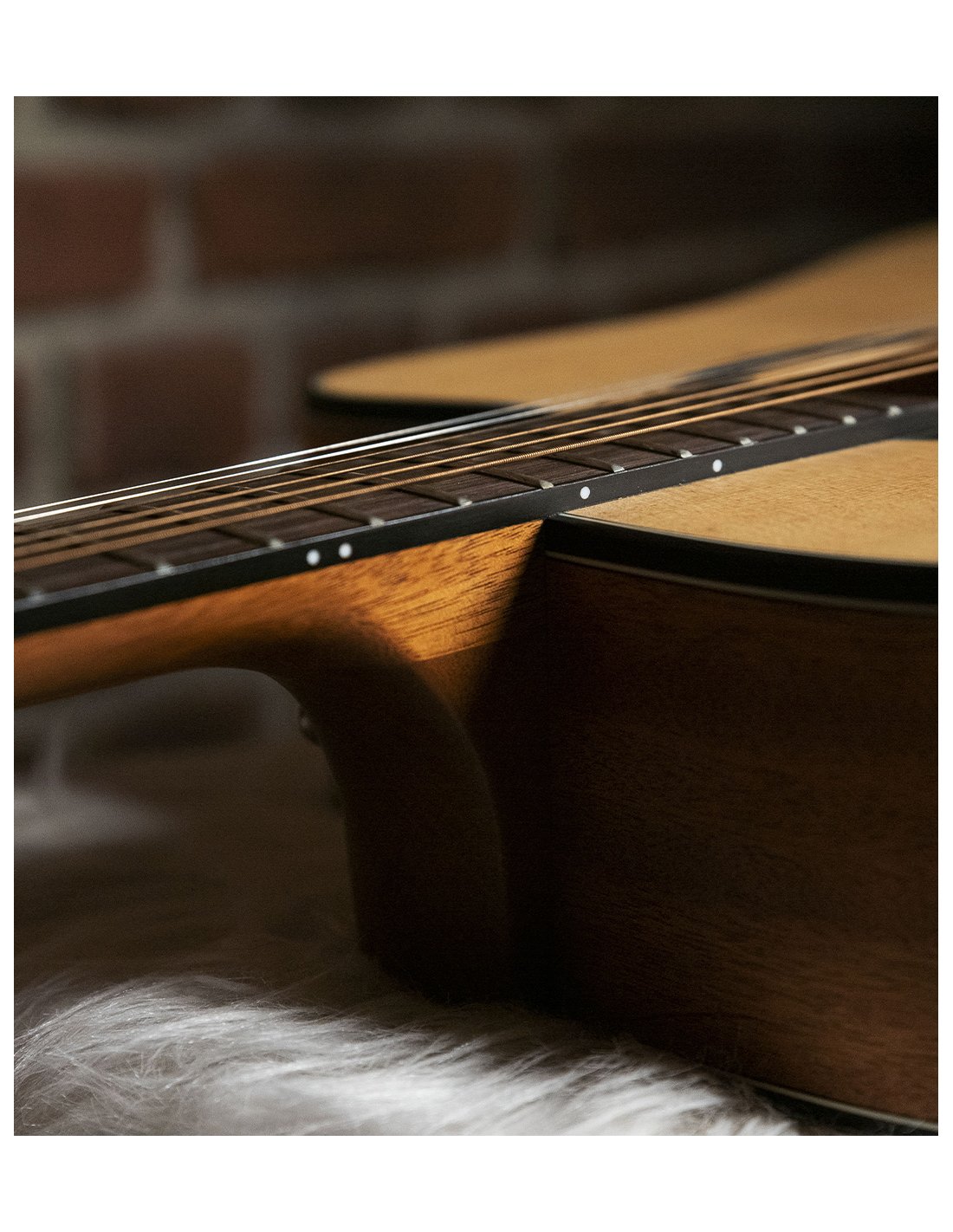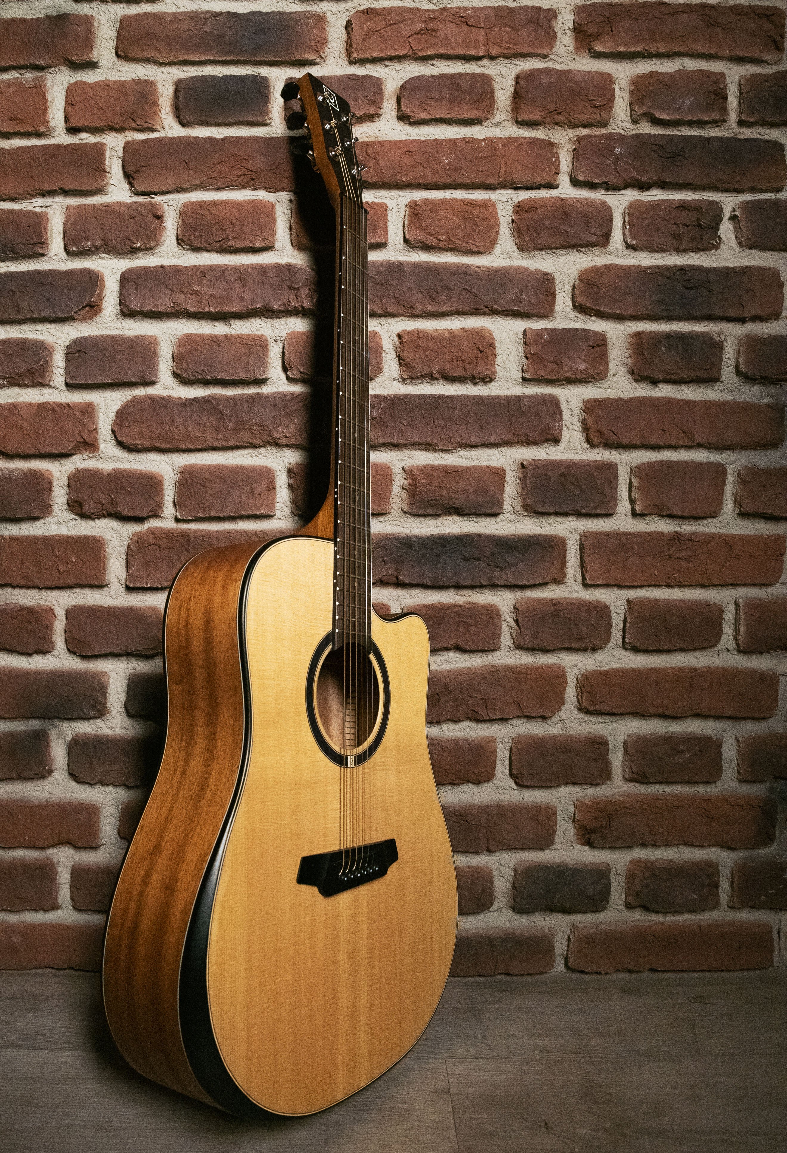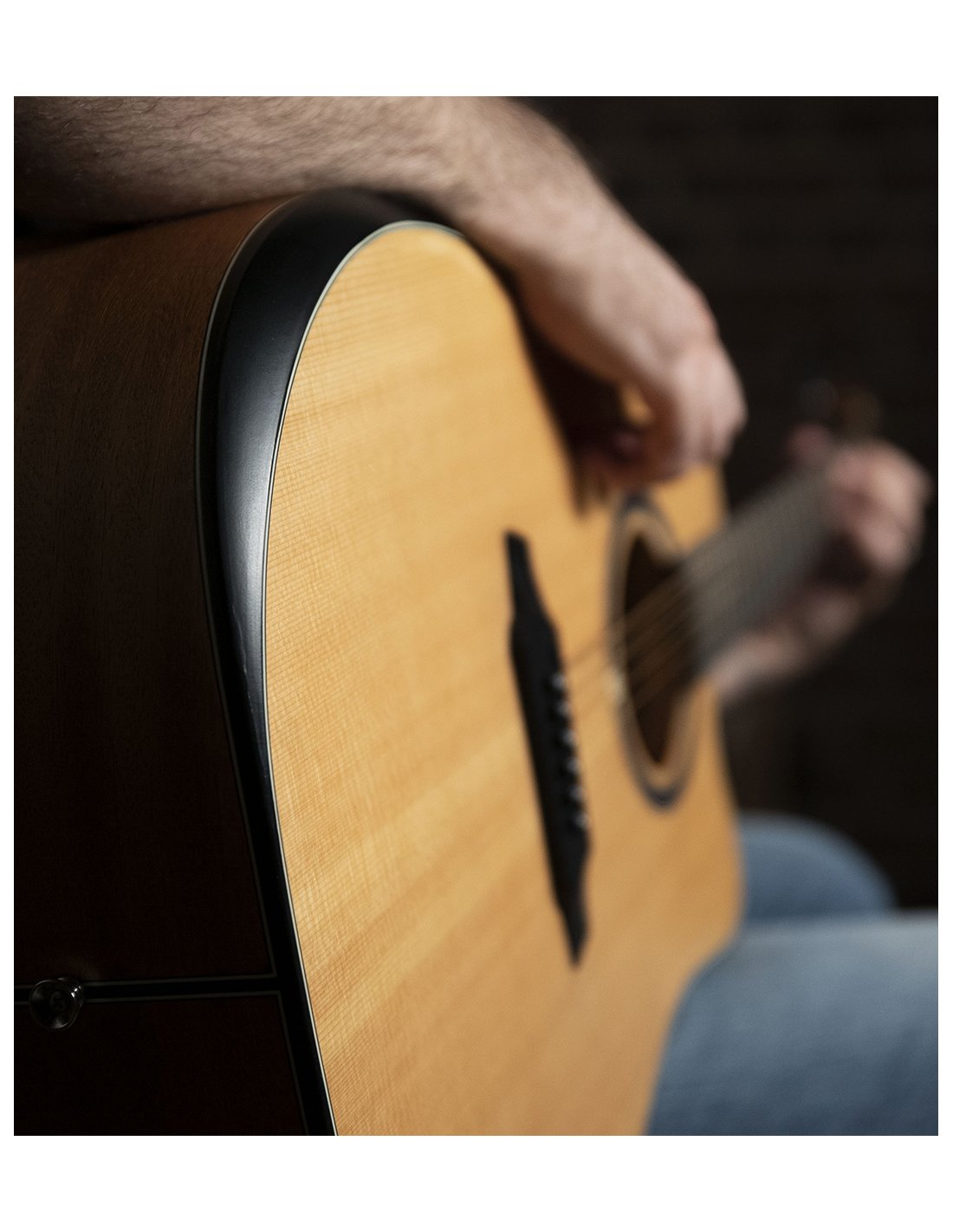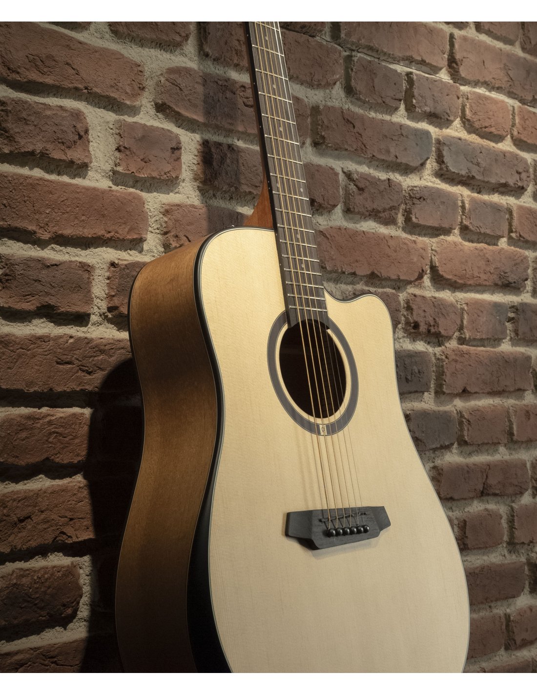 Cutaway amplified dreadnought acoustic guitar. Comfort system for greater convenience. Solid spruce top. Sapele bands and bottom. Keyboard, bridge and nut in 'compound rosewood'. Self-locking mechanics. D'Addario strings. Preamp with volume and tone control. Natural satin finish