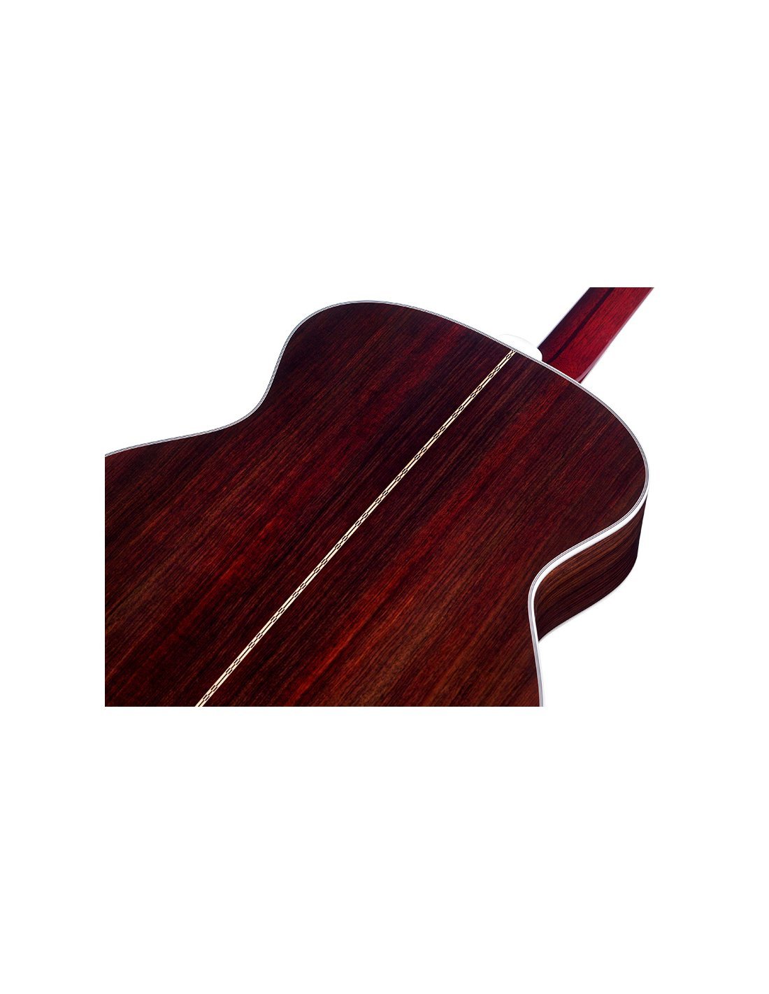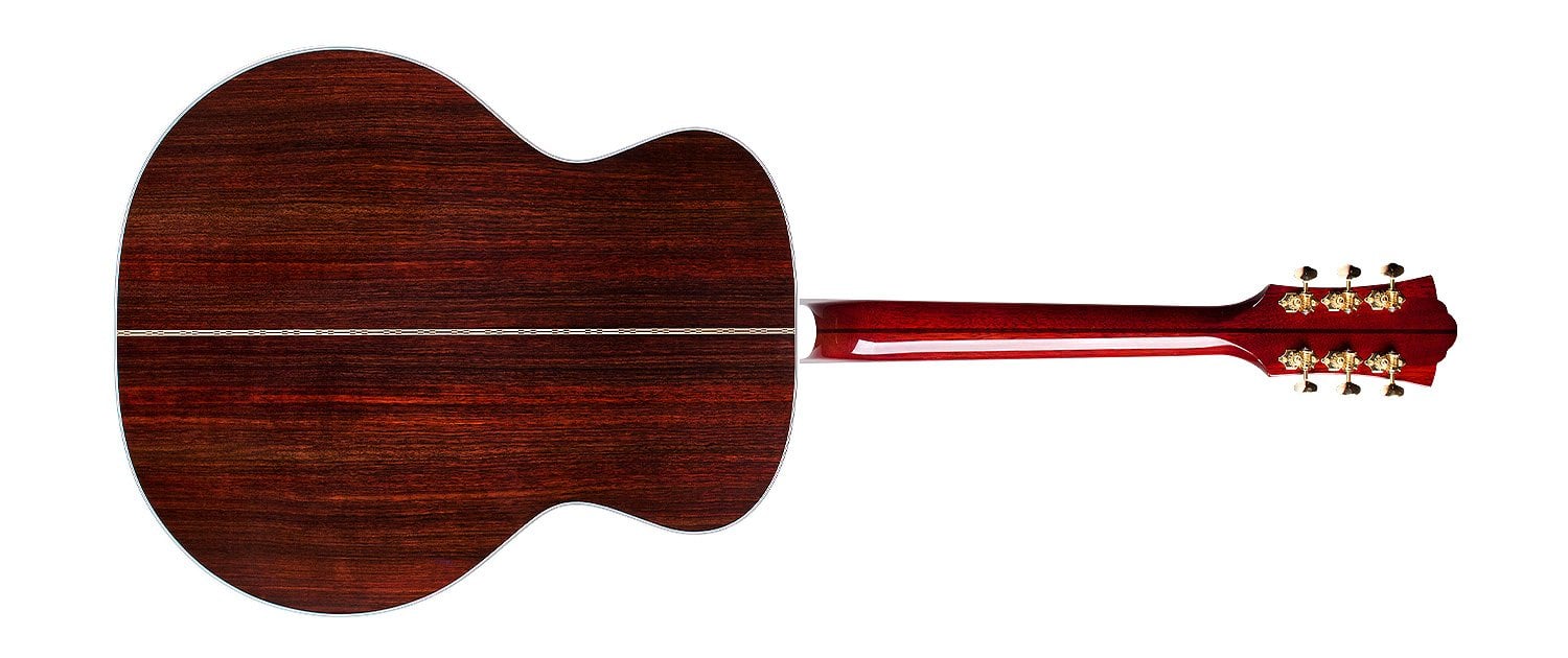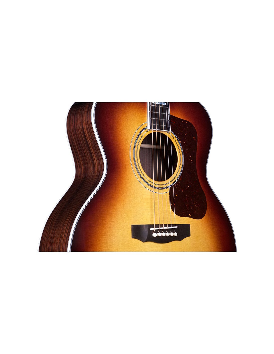 The jumbo F-55E ATB made in USA (formerly F-50R) adds another excellent instrument to the selection of Jumbo guitars, thanks to the Jumbo shape it can count on volume and full-bodied sound. Thanks to its selected solid Sitka spruce top and the solid Indian rosewood back and sides, it adds a sound rich in harmonics to the tonal spectrum. The handle is in mahogany with a C profile with a central strip of reinforcement in walnut (Walnut), the nut (43 mm) in bone as for the cross bar, the ladder is 651 mm. The bass response is clear and defined, the mids are sweet and the songs are brilliant, an alchemy that makes this instrument unique and recognizable. The elegant finishes include classic Guild “V-block” inlays, gold-plated open Gotoh SE700 hardware and mechanics, and a beautiful Antique Sunburst nitrocellulose lacquer finish complete the instrument's excellent overall build quality. The F-55E ATB is one of Guild's most interesting jumbos. The amplification system is L.R. Baggs Anthem. The guitar comes with a Guild hardwood case with a Humicase® humidification system