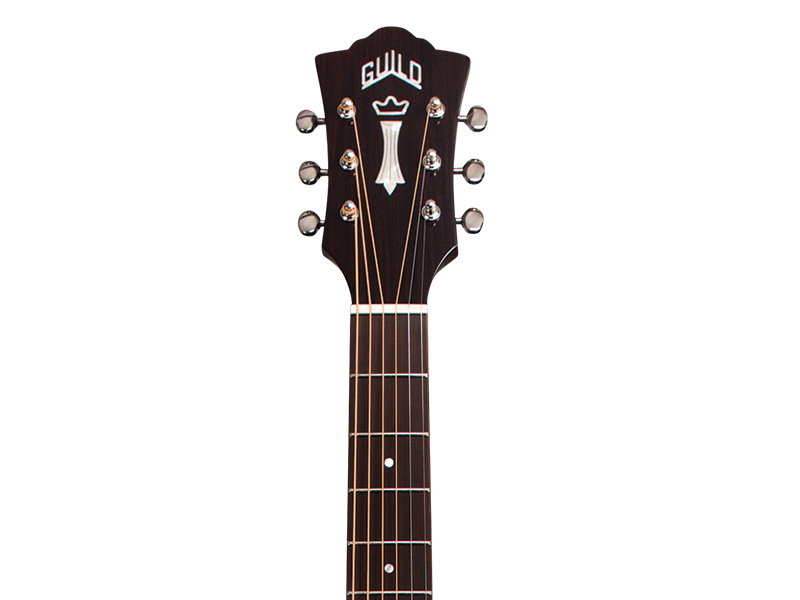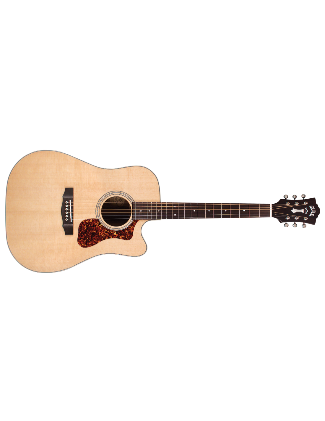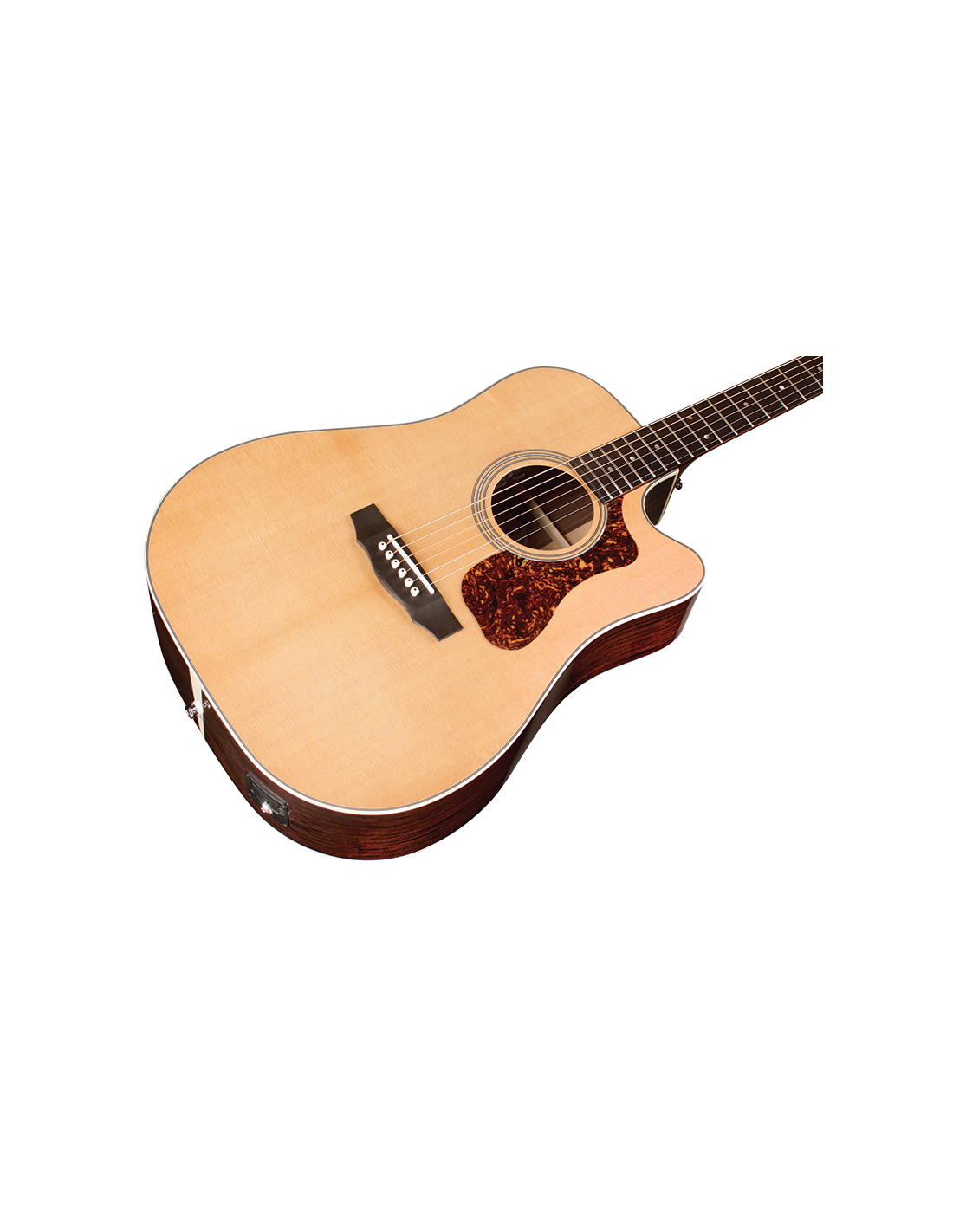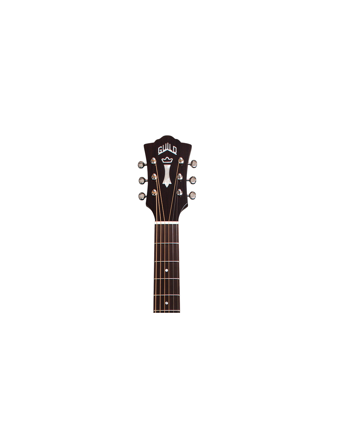 The D-150CE has the classic Dreadnought shape with a missing shoulder, offers excellent sound balance with a dynamic tone rich in harmonics. Built with solid Sitka spruce top, solid Indian rosewood back and sides, the D-150 has a scale of 24 ¾” (648 mm) and a nut width of 1 ¾” (44.5 mm). The C-profile handle in mahogany is in vintage style, the fingerboard is a rosewood bridge, the nut (nut) and the cross are in bone, the mother-of-pearl rosette, the pickguard in tarturous cellulose inspired by Vintage instruments. This model also features the iconic Guild Chesterfield headstock with mother-of-pearl logo reminiscent of Guilds from the 60s. It includes the new lightweight polyfoam case. The glossy polyurethane finish (Gloss) natural. The amplification is Fishman Sonitone GT-1