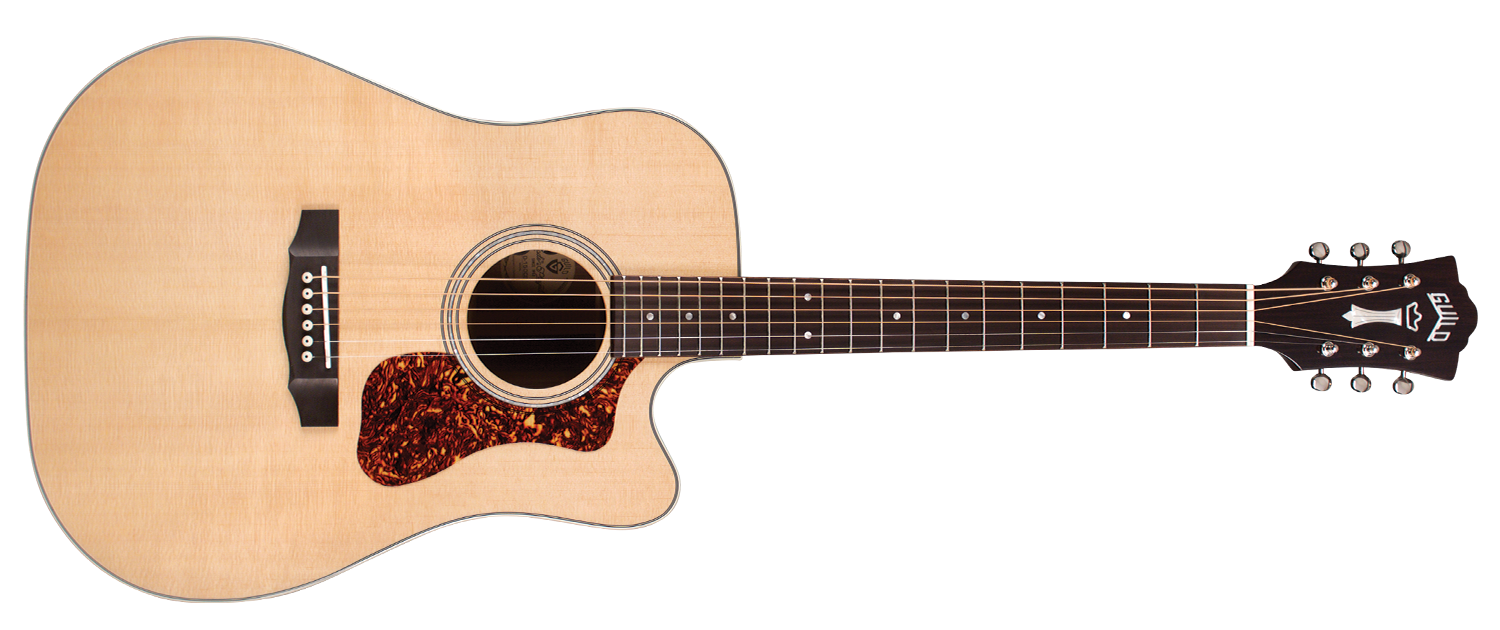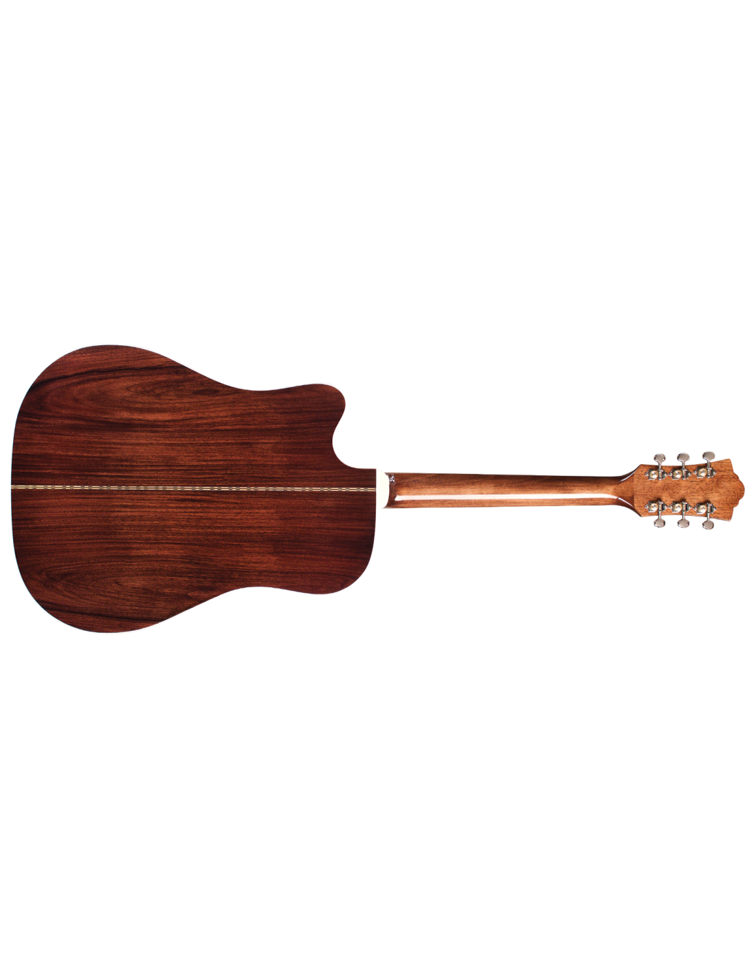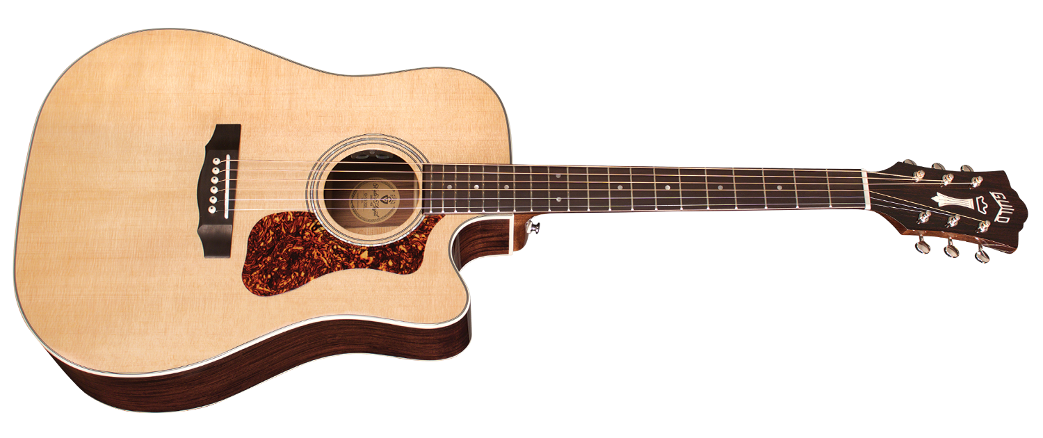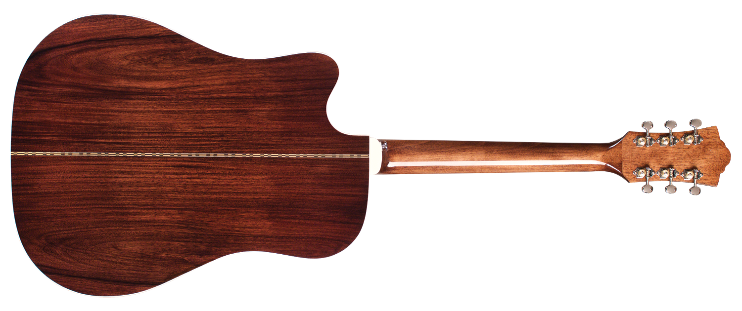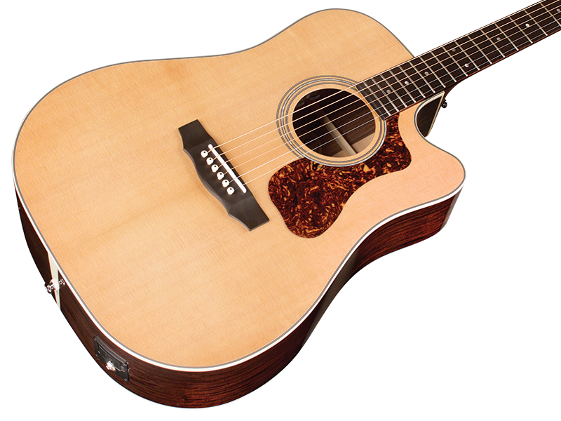 The D-150CE has the classic Dreadnought shape with a missing shoulder, offers excellent sound balance with a dynamic tone rich in harmonics. Built with solid Sitka spruce top, solid Indian rosewood back and sides, the D-150 has a scale of 24 ¾” (648 mm) and a nut width of 1 ¾” (44.5 mm). The C-profile handle in mahogany is in vintage style, the fingerboard is a rosewood bridge, the nut (nut) and the cross are in bone, the mother-of-pearl rosette, the pickguard in tarturous cellulose inspired by Vintage instruments. This model also features the iconic Guild Chesterfield headstock with mother-of-pearl logo reminiscent of Guilds from the 60s. It includes the new lightweight polyfoam case. The glossy polyurethane finish (Gloss) natural. The amplification is Fishman Sonitone GT-1