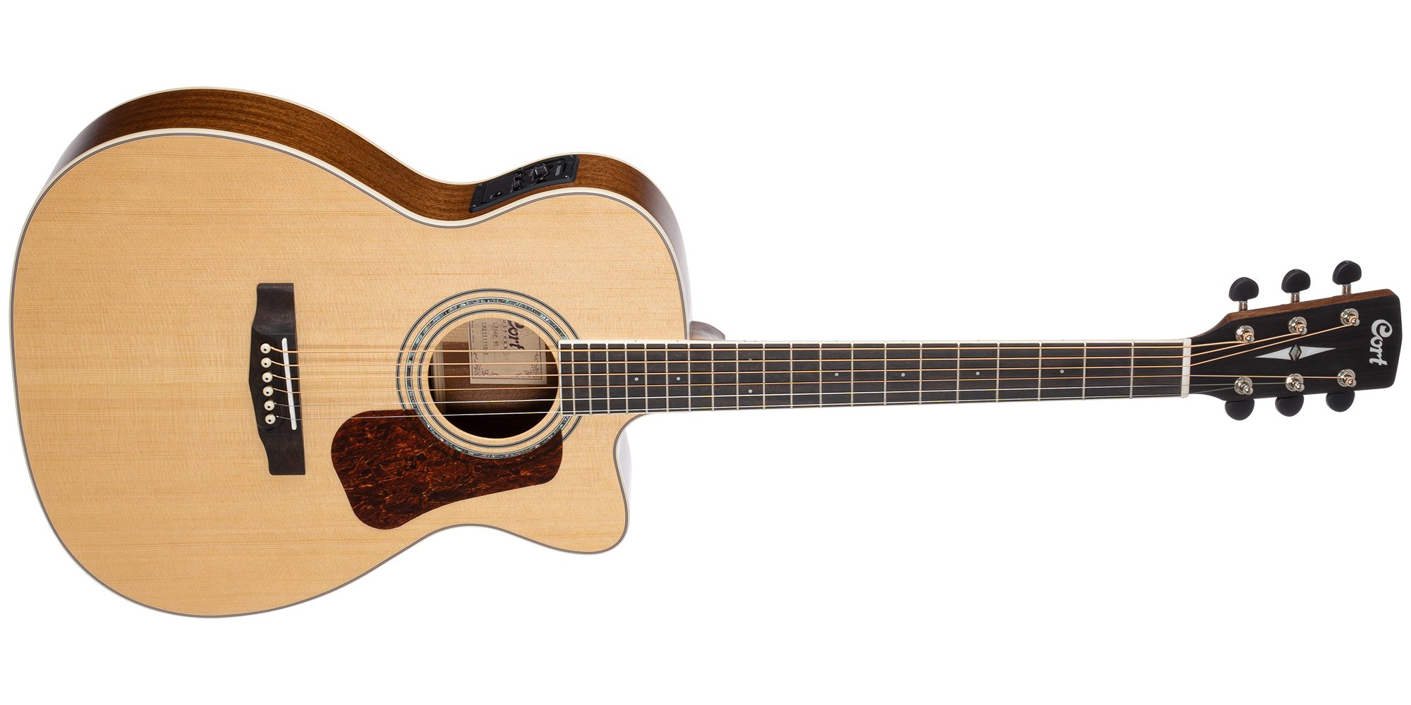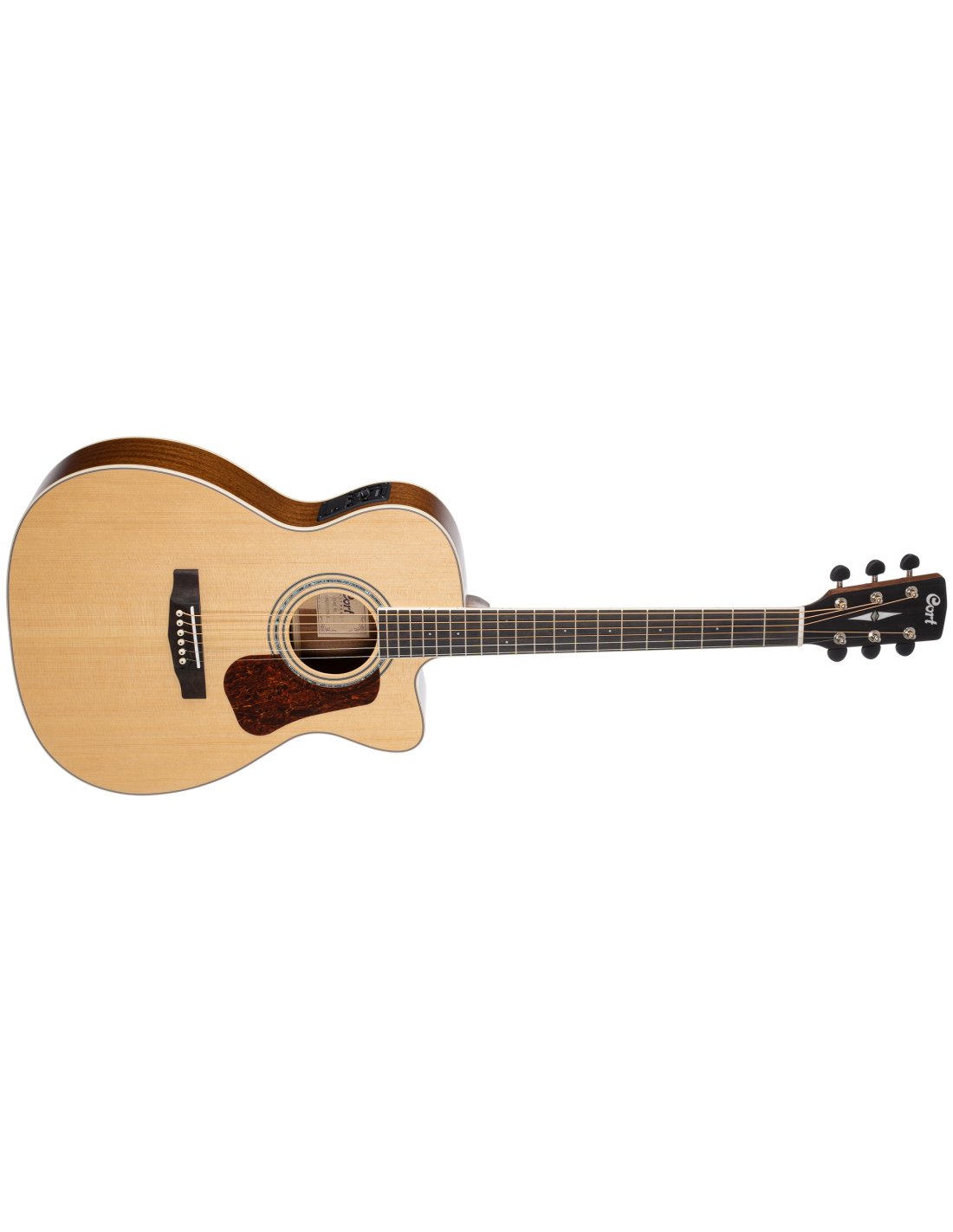 Electrified Missing Shoulder Acoustic Guitar. Series: Cort Luce. Construction: Dovetail Neck Joint, 14th fret. Scale: 25.3 (643 mm). Sound Box: OM - Orchestra Model Missing Shoulder (Venetian). Chain: Advanced Scalloped X-Bracing. Back and Sides: Laminated mahogany. Binding: Ivory. Top: solid Sitka spruce. Handle: Mahogany Keyboard: Ovangkol. Nut: Bone - 44.45 mm (1 3/4"). Keyboard inlay: White Dot. Keys: 20. Mechanics: Chromed corts with black blade. Rosette: Multiple Abalone. Bridge: Ovangkol, with bone saddle. Electronics: Fishman Presys - Sonicore pickup. Strings: D'Addario EXP16 Light. Color: NS Natural Satin Series: Cort Luce.