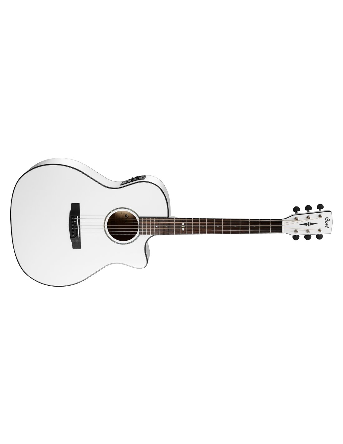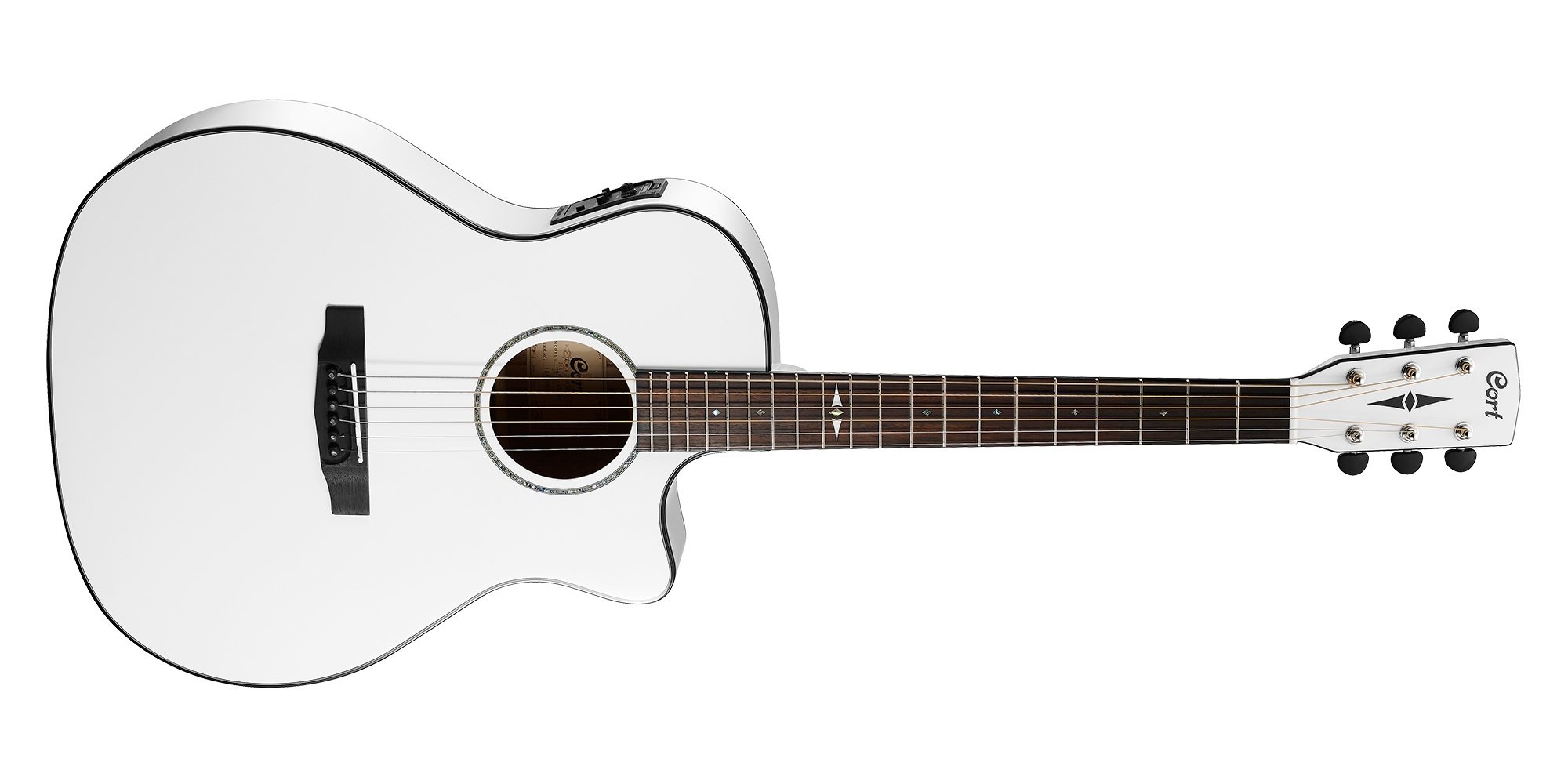 Cort GA5F-WH Grand Auditorium Acoustic Guitar color WHITE. The Cort GA5F-WH Grand Auditorium is a 6-string electrified acoustic guitar. Technical features include mahogany back and sides, solid spruce top, mahogany neck, rosewood fingerboard, missing shoulder, Fishman Presys