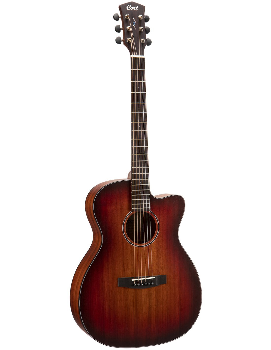 Electrified Missing Shoulder Acoustic Guitar. Construction: Dovetail Neck Joint. Scale: 25.3 (643 mm). Sound Box: OM Missing Shoulder. Chain: Advanced X-Bracing. Back and Sides: Solid Blackwood. Binding: Black - White Purfling. Top: Solid Blackwood. Handle: Mahogany Keyboard: Ovangkol. Nut: Bone - 43 mm (1 11/16"). Keyboard inlay: Dot. Mechanics: Cort chrome - black shovel. Bridge: Ovangkol with bone saddle. Electronics: Fishman Sonitone - Sonicore Pickup. Strings: D'Addario EXP16. Color: OPLB - Open Pore Light Burst. Deluxe Soft-Side Case Included