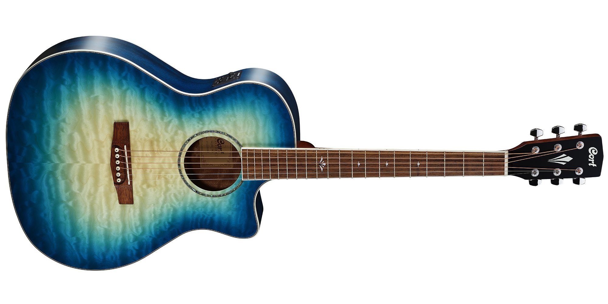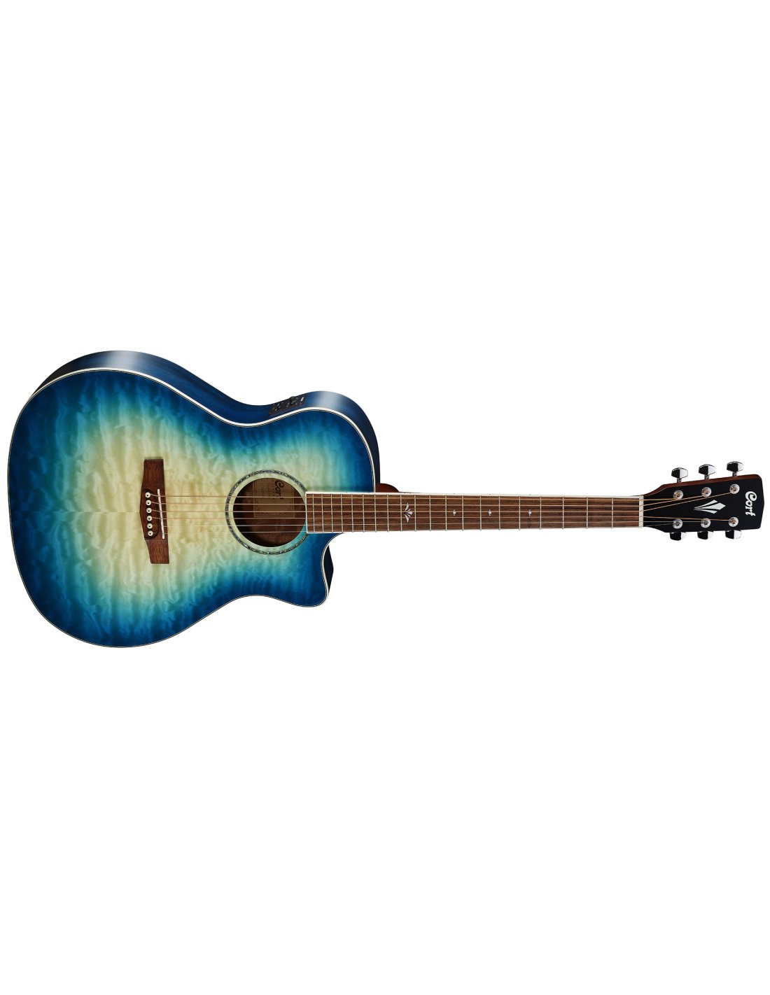 Cort GA-QF W/BAG CBB Acoustic Guitar color CORAL BLUE BURST. The Cort GA-QF W/BAG CBB is a 6-string electrified acoustic guitar. Technical features include mahogany back and sides, figured maple top, mahogany neck, merbau fingerboard, missing shoulder, Fishman Isys T. Bag amplification