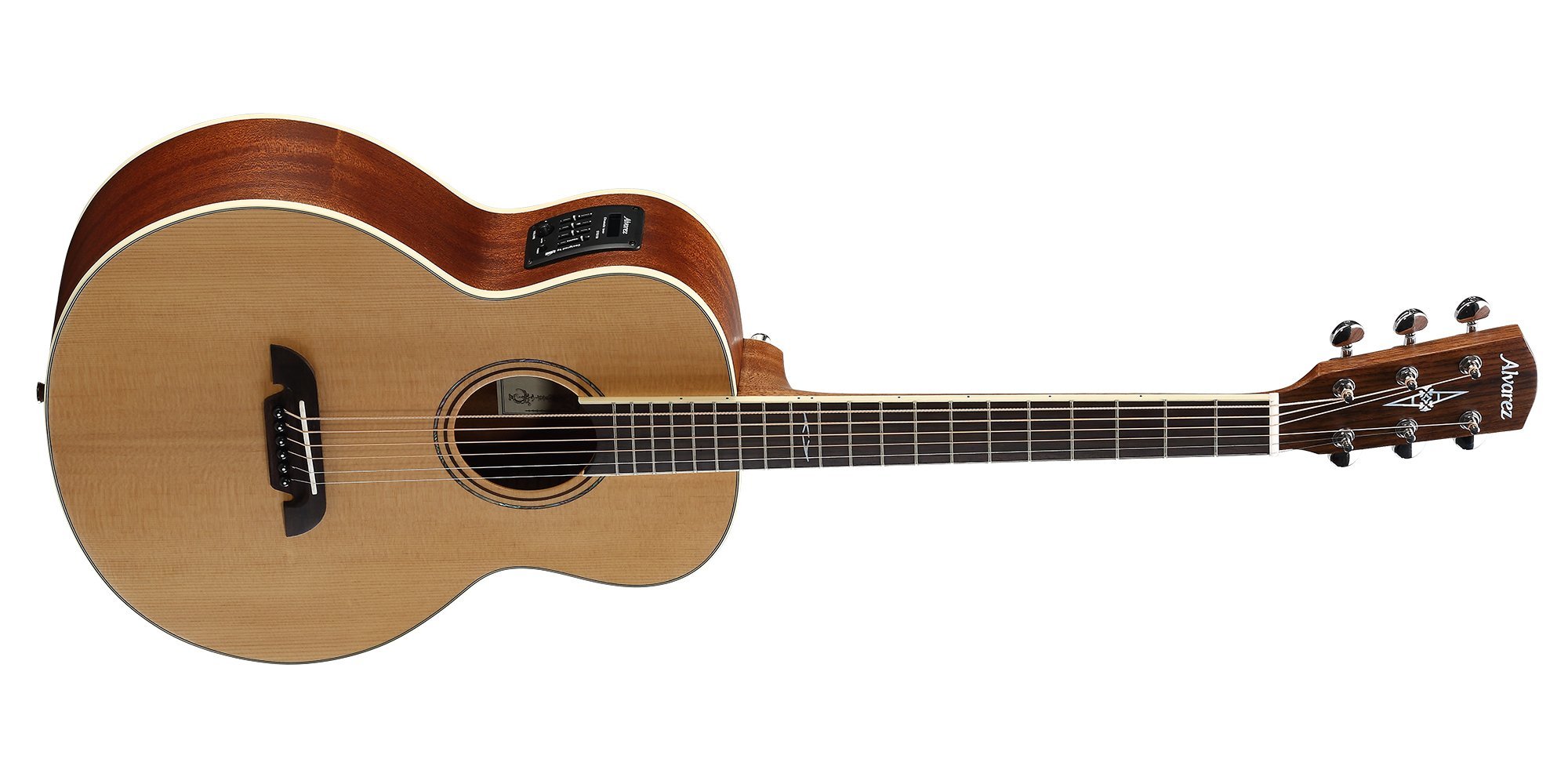Alvarez LJ2E Travel Little Jumbo Acoustic Guitar NATURAL color. The Alvarez LJ2E Travel Little Jumbo is a 6-string electrified acoustic guitar. Technical features include mahogany back and sides, solid sitka spruce top, mahogany neck, rosewood fingerboard, 22 5/8” scale, B-Band SYS250 EQ amplification. Bag included.