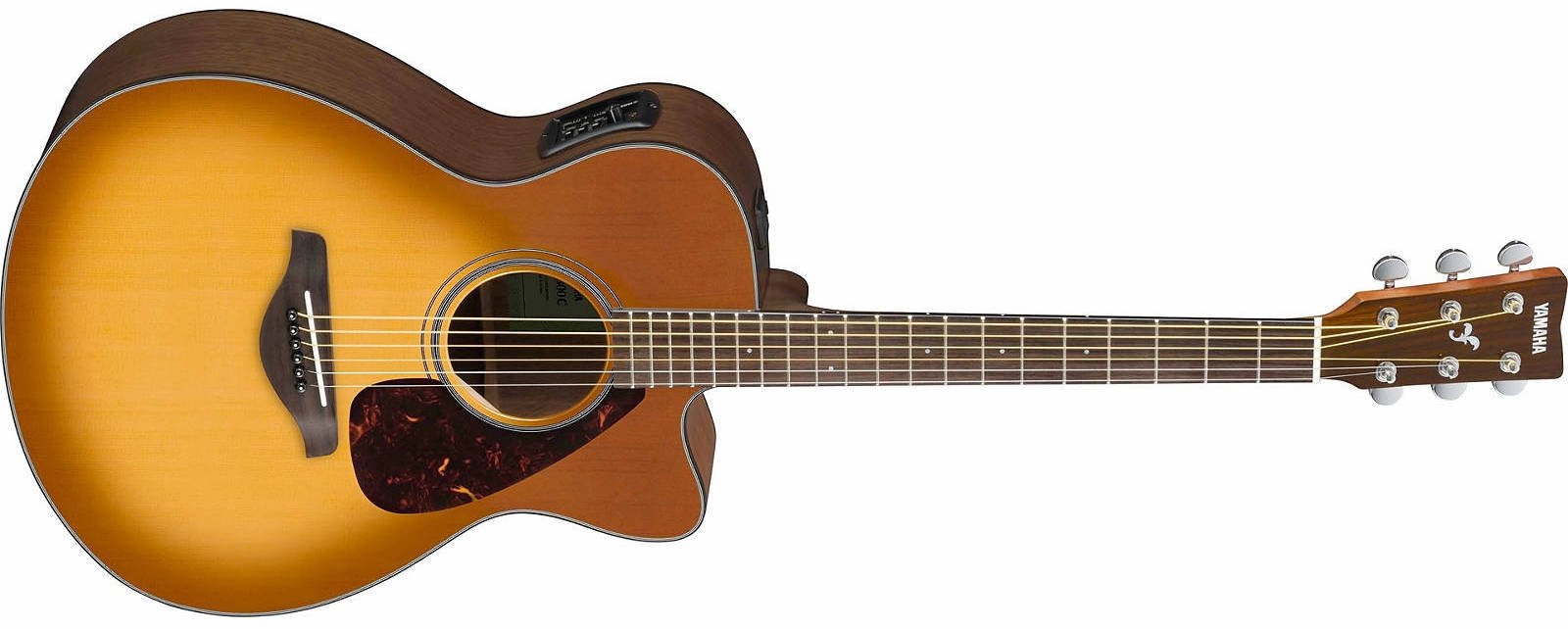 Yamaha FSX800C Electrified Acoustic Guitar color Sand Burst. The Yamaha FSX800C is a 6-string electrified acoustic guitar, Concert-type body, with a missing shoulder. Soundboard in solid spruce, back and sides in Nato/Okume. Rosewood fingerboard, 20 frets, 15 3/4" radius. Amplification with Piezoelectric pickup and System 66 preamplifier with Volume controls, 3-band EQ with semiparametric mids