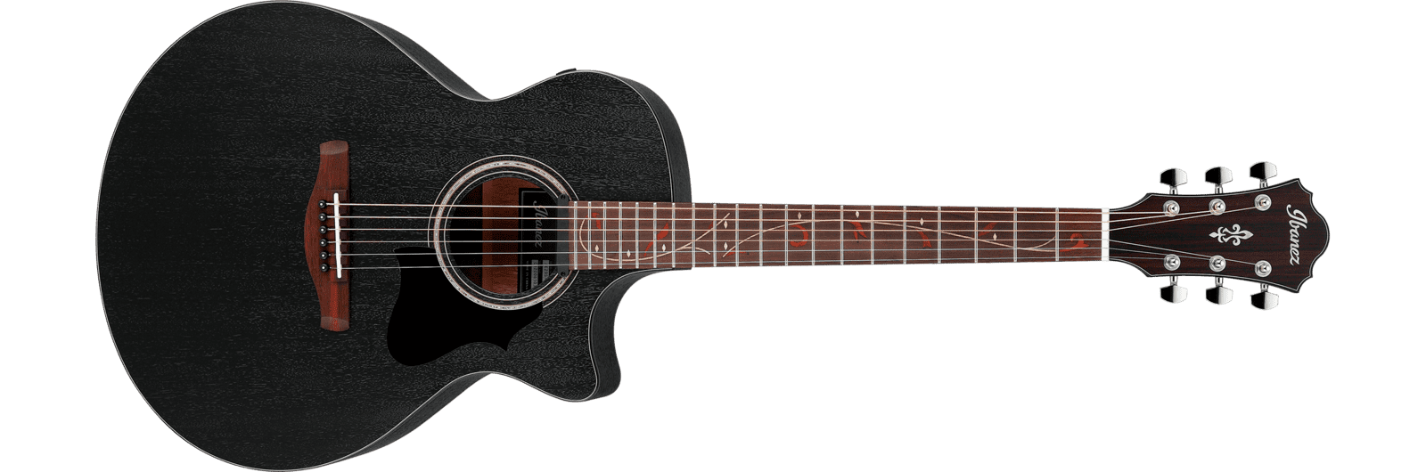 IBANEZ AE295-WK is an electric acoustic guitar model AE Body, with solid Okoumè Top, Okoumè back and sides, Nyato Comfort Grip neck with rounded profile, Katalox scalloped keyboard with 12” radius and 20 Jumbo frets, neck-body joint with Original Scalloped X reinforcement, bone cap, white dot inlays with abalone “branch of vine” patterns, Chrome Open Gear mechanics with nickel-plated hardware, Ibanez Advantage Katalox Scalloped bridge. The electronics consist of an Ibanez AP11 magnetic undersaddle pickup and Ibanez Custom Electronics AHA-1 preamplifier