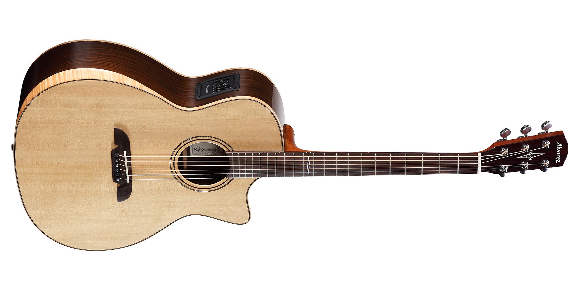 Electrified Missing Shoulder Acoustic Guitar.Construction: Dovetail Neck Joint. Scale: 25 1/2 (648 mm). Harmonica Speaker: Grand Auditorium missing shoulder with armrest. Chain: MST1 - Scalloped X, Asymmetric Tones Bars. Back and Sides: Laminated Black Walnut. Binding/Armrest: Flamed Maple. Top: Solid Sitka Spruce A+. Top finish: Natural/Gloss. Handle: Mahogany, 50/50 Semi Gloss finish. Keyboard: Lauro Indiano/Rosewood. Nut: Bone - 44.45 mm (1 3/4"). Keyboard inlay: Special inlay on the 12th fret in abalone and mother of pearl. Mechanics: Alvarez Premium. Bridge: Lauro Indiano/Rosewood Bi-Level, with bone saddle. Electronics: LR Baggs StagePro EQ/Element Pick Up Series: Alvarez Artist