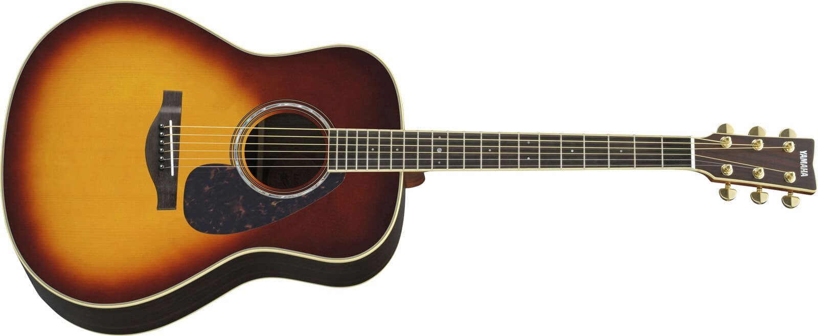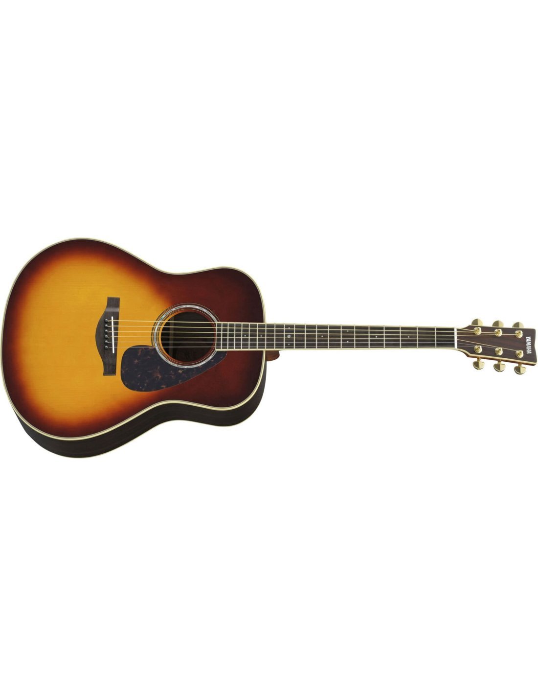 YAMAHA LL6BSARE BROWN SUNBURST is an electrified Dreadnought acoustic guitar with rosewood back and sides, A.R.E. solid Sitka spruce top, 5-piece mahogany/rosewood neck, rosewood fingerboard with 2 standard frets and abalone dot inlays, Urea nut, chrome hardware, Die-cast Gold mechanics and rosewood bridge. The electronics consist of SRT Zero-Impact Piezo undersaddle pickups. Includes rigid Gig Bag