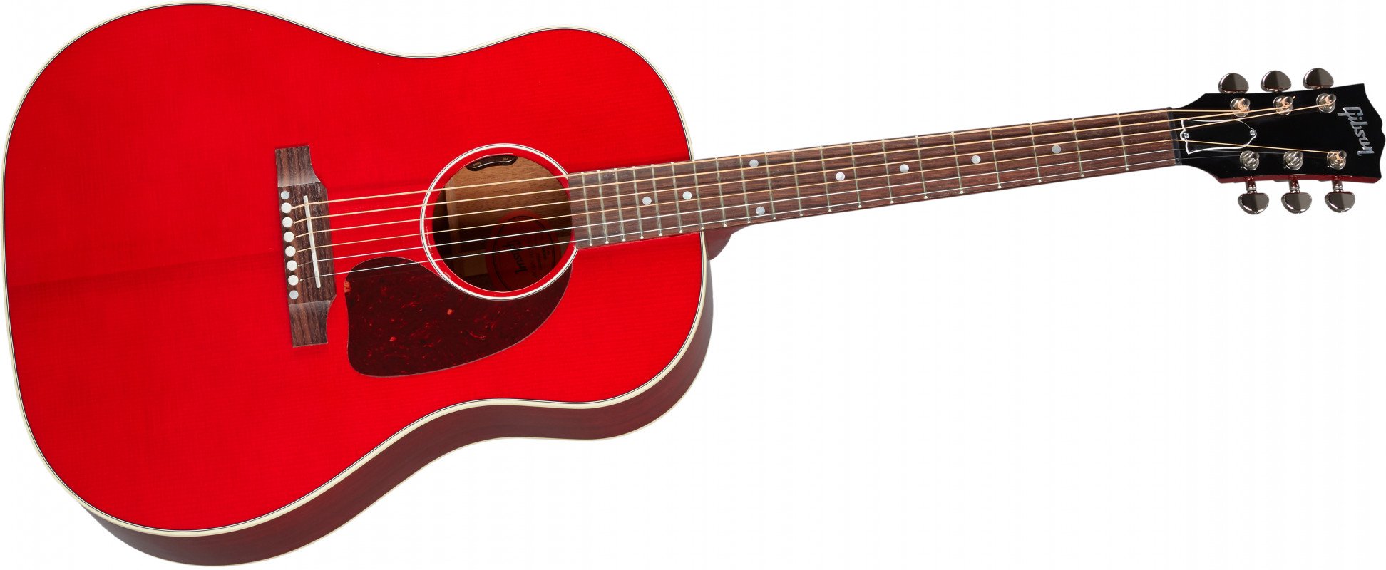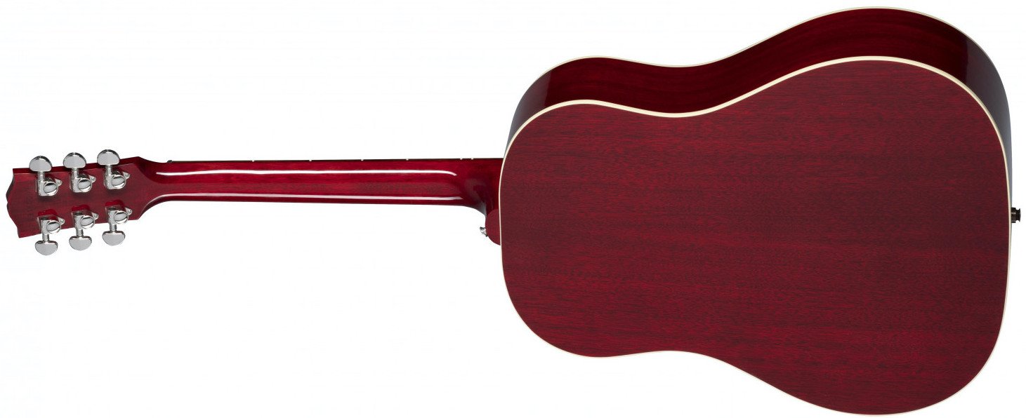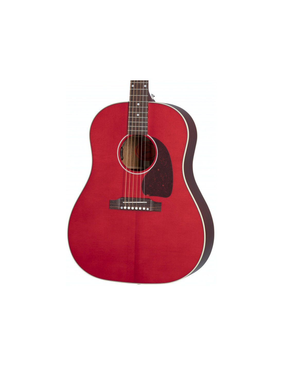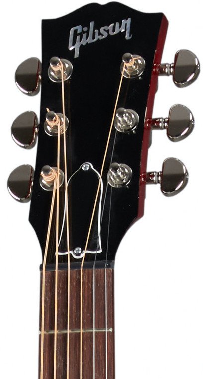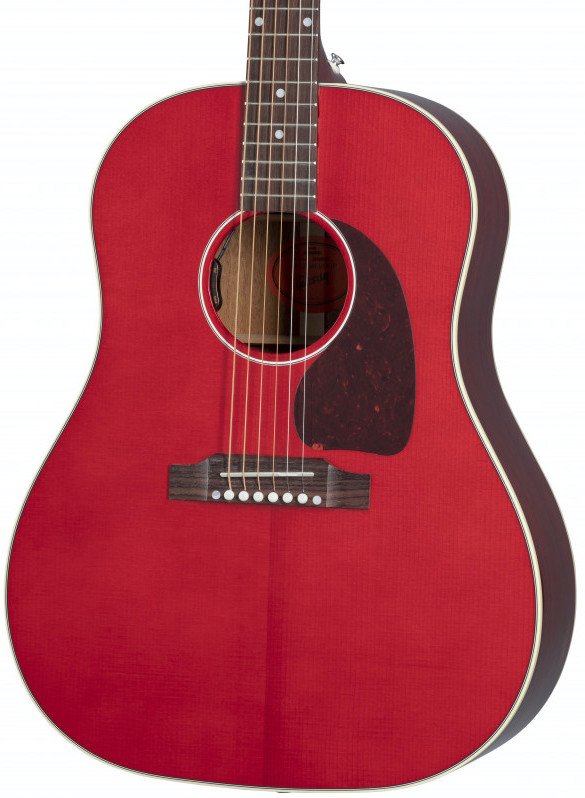 GIBSON J-45 STANDARD CHERRY. Gibson J-45 Standard round shoulder Dreadnought profile electrified acoustic guitar with Cherry lacquer finish. Technical features include Sitka spruce body with mahogany back and sides, solid mahogany neck with Slim Taper profile, 12" radius Indian rosewood fingerboard with 20 standard frets, mother-of-pearl dot inlays, adjustable trussrod and Tusq nut. The electronics are equipped with LR Baggs Element VTC pickup positioned under the saddle with volume and tone controls. It also features Rosewood Reverse Belly bridge, Grover Rotomatics mechanics. Gibson hard case included.