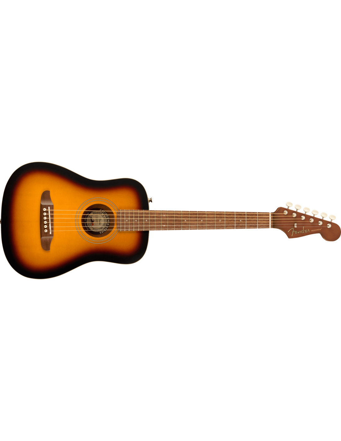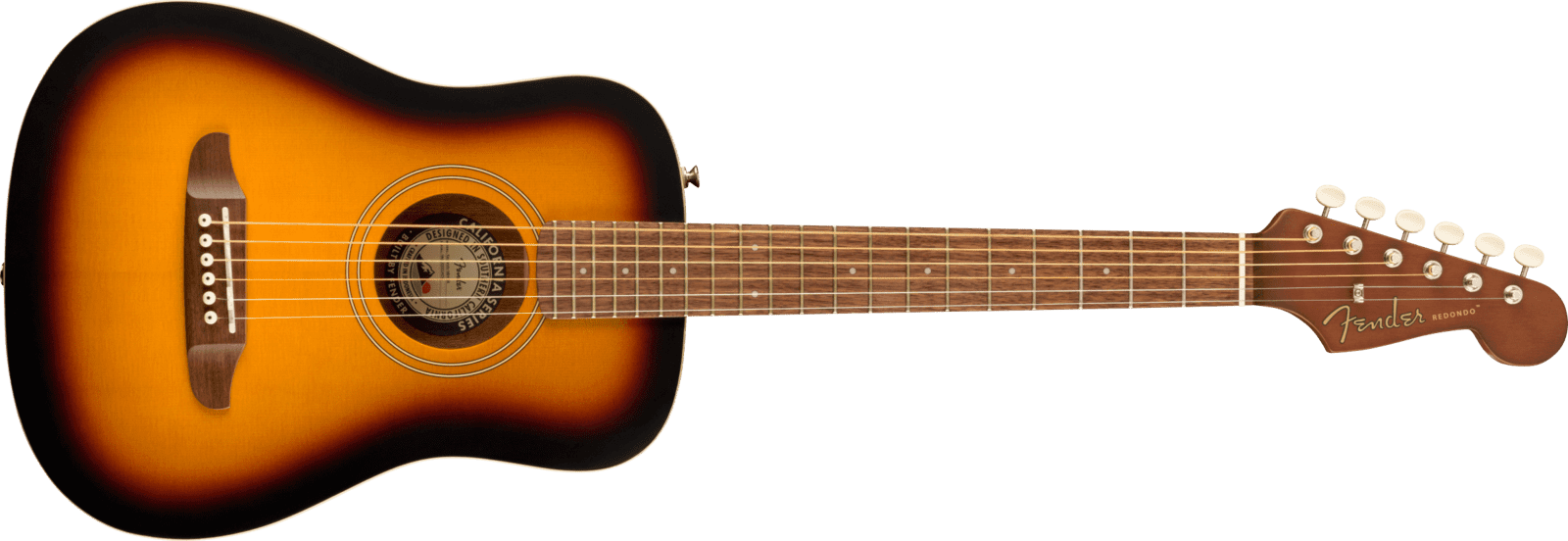 FENDER REDONDO MINI W/BAG SB is a short scale acoustic guitar with Redondo Mini Fender California series shape, with spruce top with scalloped “X” chain, mahogany back and sides, Nyatoh neck, Slim Taper C Shape profile, walnut fingerboard with 18 2mm frets and Clay Dots inlays, Nubone nut and saddle, relic chrome hardware, Fender Vintage-Style mechanics on a Fender Stratocaster headstock and walnut bridge with Graph Tech jumper. Includes Fender Gig Bag