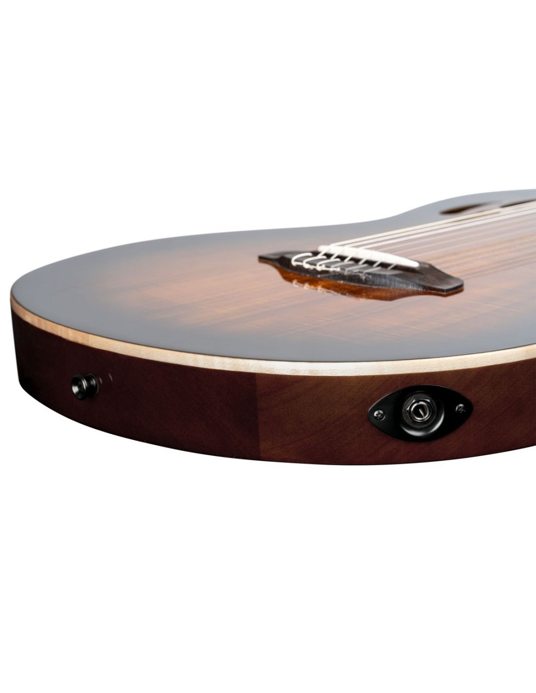 The revolutionary TourPlayer nylon string electric guitar designed for live performances, offering the authentic warmth and resonance of a nylon guitar by eliminating feedback issues. Explore a world of sonic possibilities that you never thought possible on a nylon guitar. The TourPlayer combines the beauty of nylon strings with the power and emotion of an electric guitar, offering innovation at its best. Features: Solid Okoume body with cutout, polished finish Acacia top, glossy burst finish Okoumž handle, matte finish Laurel fingerboard and bridge Scale: 650mm Head width: 48mm Keys: 19 Strings: NYP44H Deluxe Classical 12-hole Ortega bridge mechanics Junction at 14 ¡button Side binding in flamed maple Nut in bone TourPlayer concert bag included.