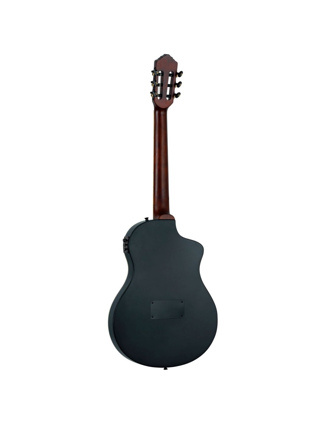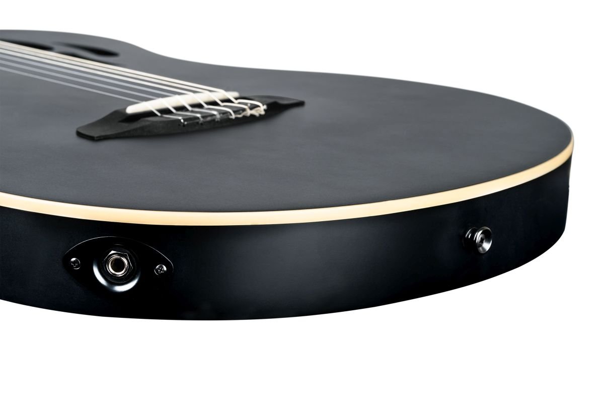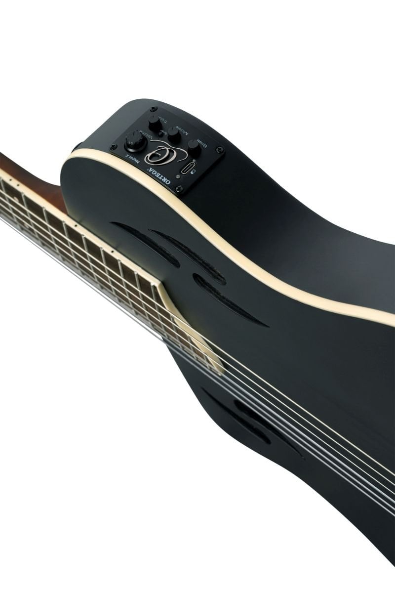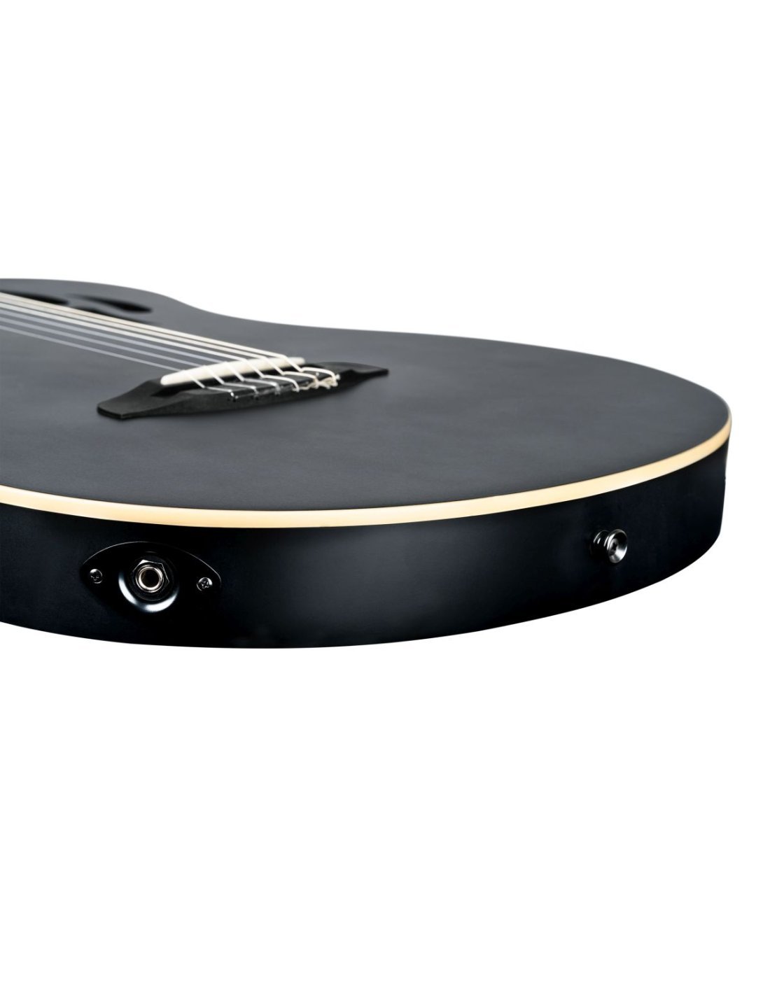 The revolutionary TourPlayer nylon string electric guitar designed for live performances, offering the authentic warmth and resonance of a nylon guitar by eliminating feedback issues. Explore a world of sonic possibilities that you never thought possible on a nylon guitar. The TourPlayer combines the beauty of nylon strings with the power and emotion of an electric guitar, offering innovation at its best. Features: Left-handed guitar Solid Okoume body with cutout, glossy finish Top in satin black finish Okoumž neck, matte finish Laurel fingerboard and bridge Scale: 650mm Head width: 48mm Keys: 19 Strings: NYP44H Deluxe Classical 12-hole Ortega bridge mechanics Junction at 14 ¡button Side binding in flamed maple Nut in bone TourPlayer concert bag included.
