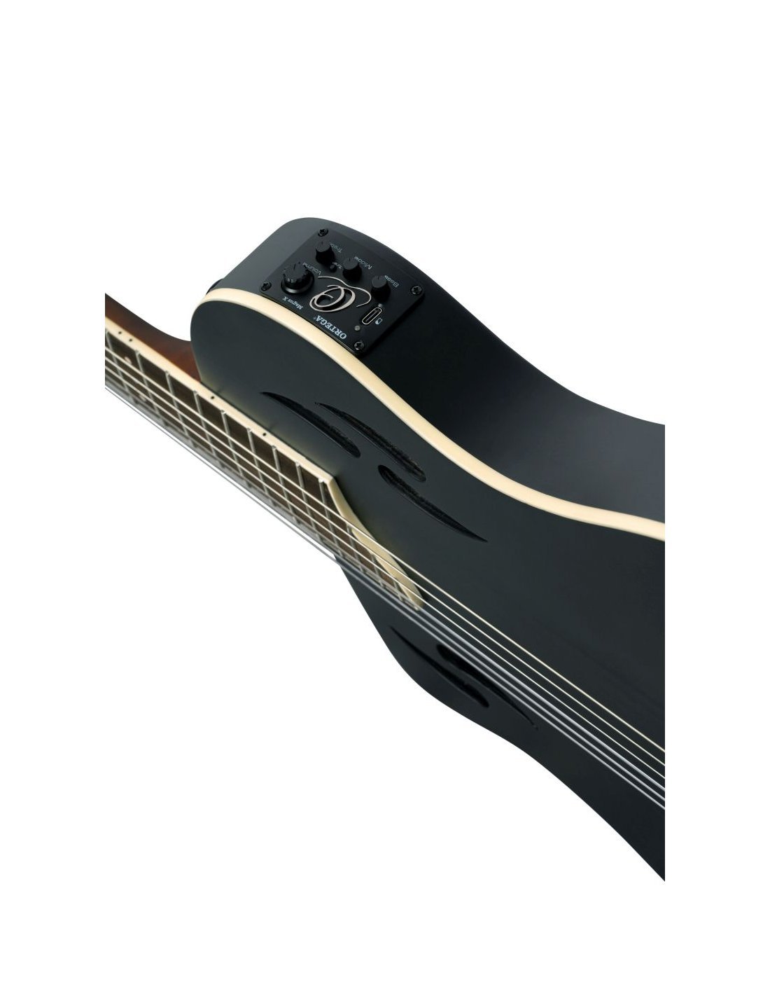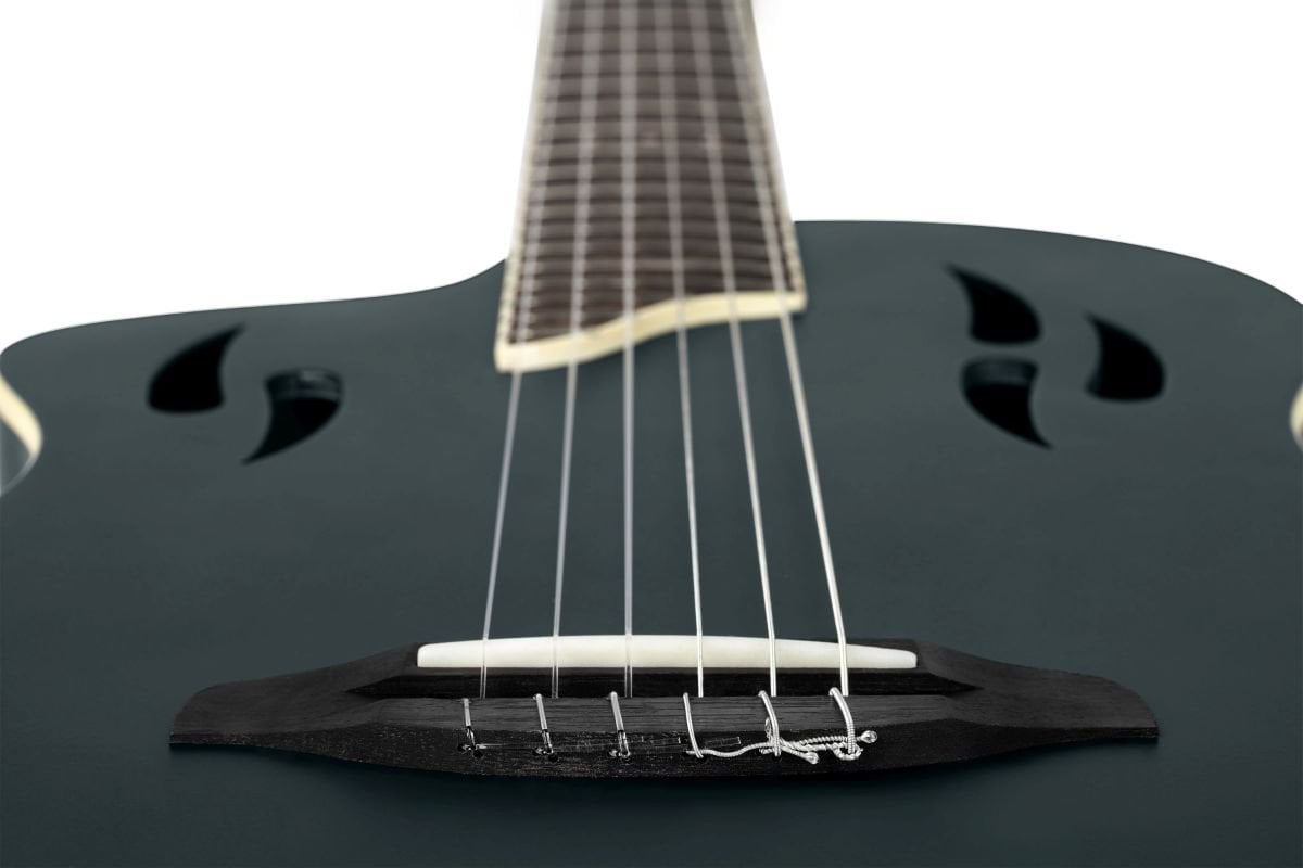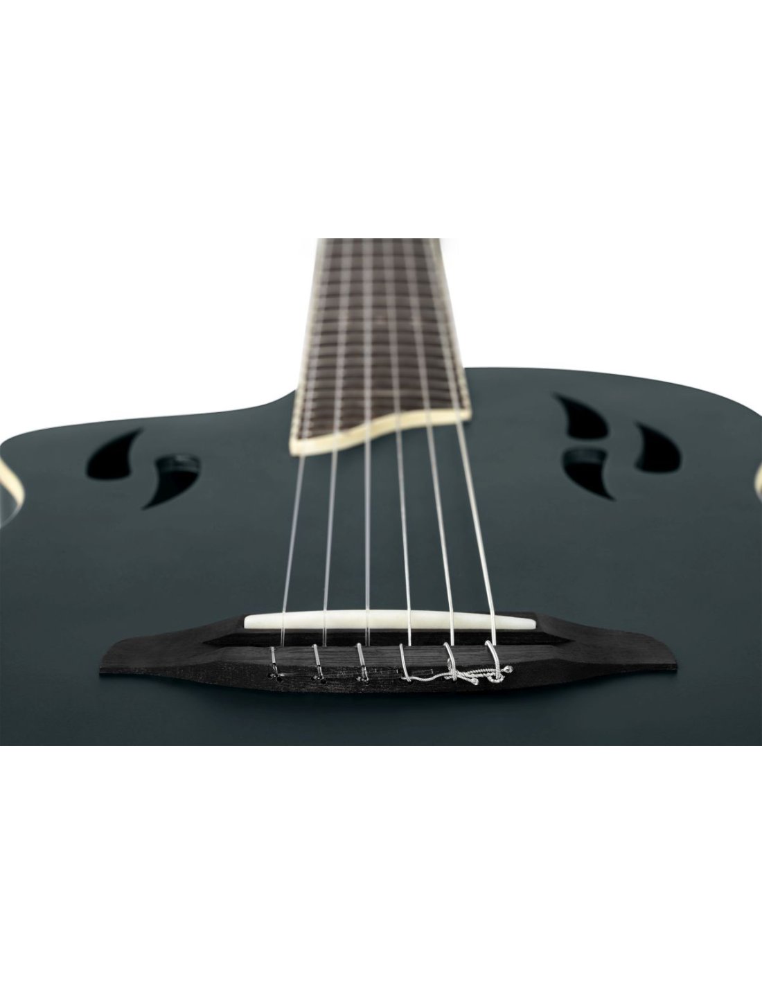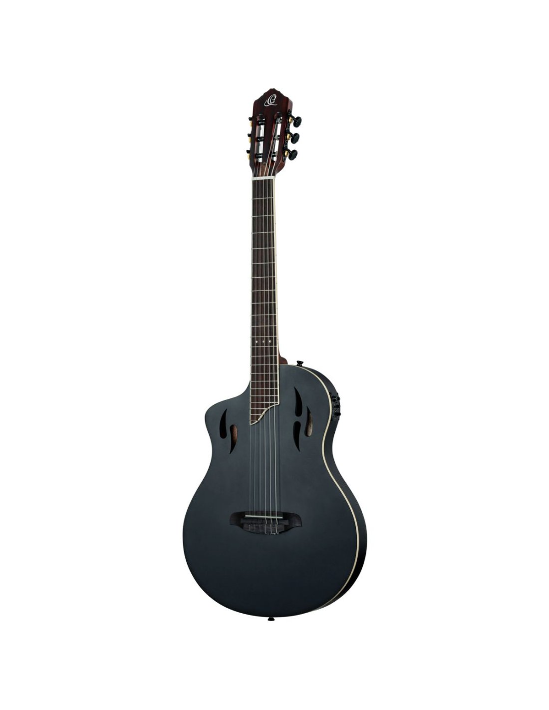 The revolutionary TourPlayer nylon string electric guitar designed for live performances, offering the authentic warmth and resonance of a nylon guitar by eliminating feedback issues. Explore a world of sonic possibilities that you never thought possible on a nylon guitar. The TourPlayer combines the beauty of nylon strings with the power and emotion of an electric guitar, offering innovation at its best. Features: Left-handed guitar Solid Okoume body with cutout, glossy finish Top in satin black finish Okoumž neck, matte finish Laurel fingerboard and bridge Scale: 650mm Head width: 48mm Keys: 19 Strings: NYP44H Deluxe Classical 12-hole Ortega bridge mechanics Junction at 14 ¡button Side binding in flamed maple Nut in bone TourPlayer concert bag included.