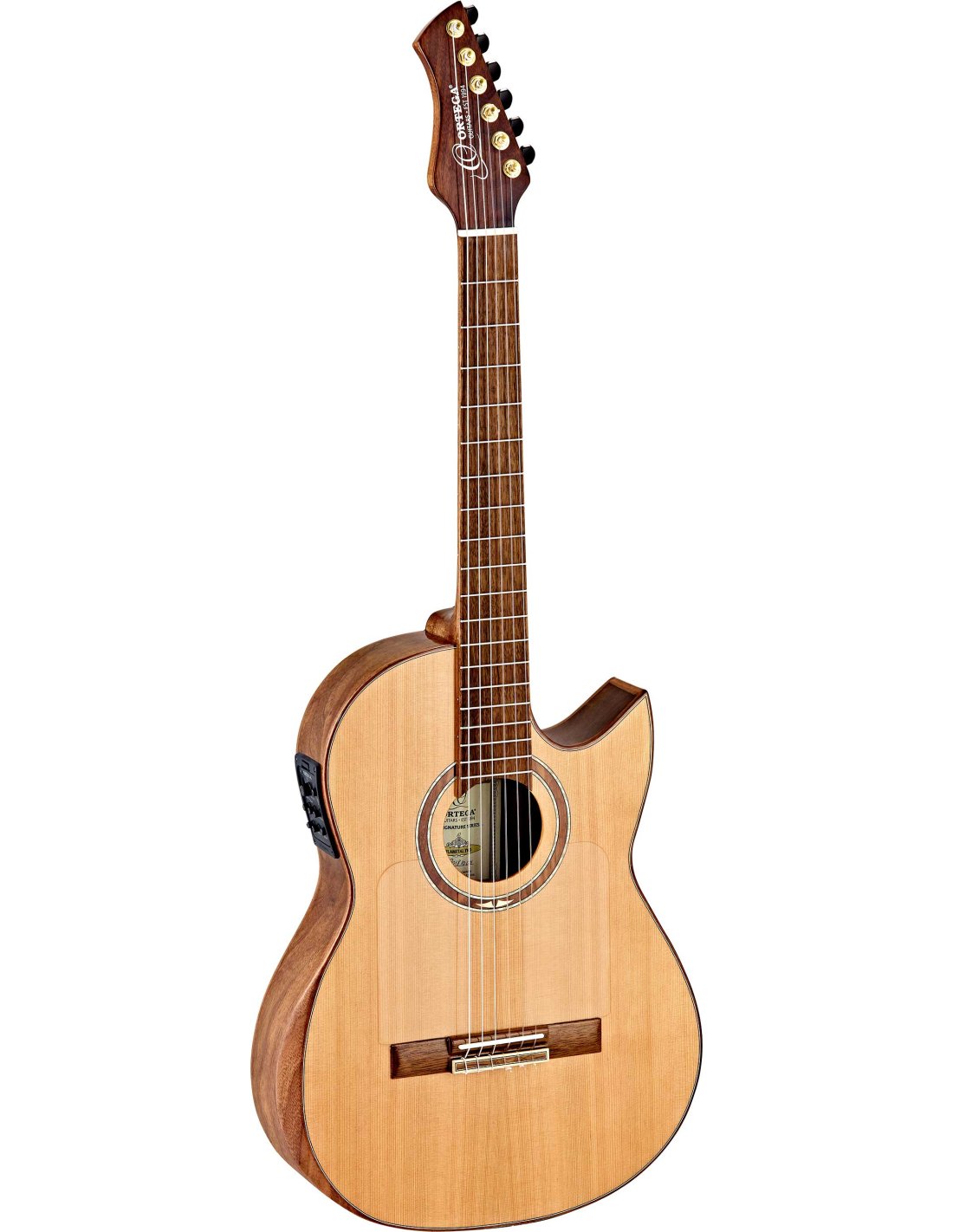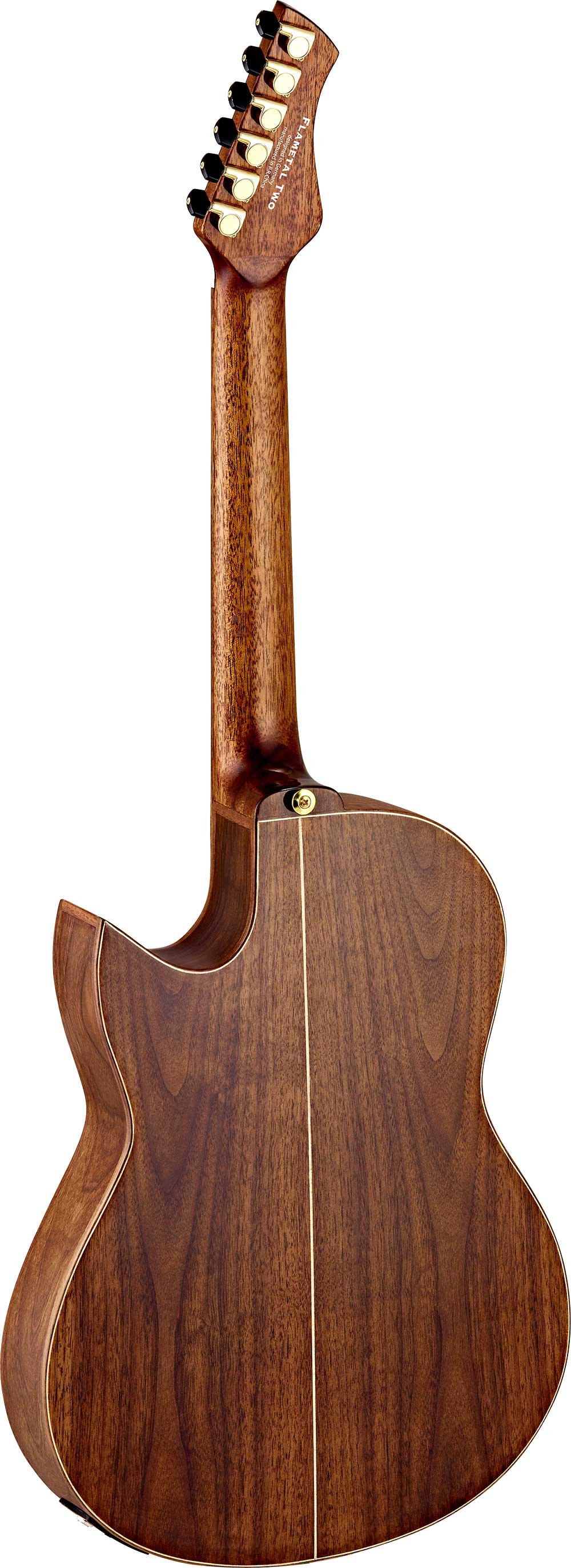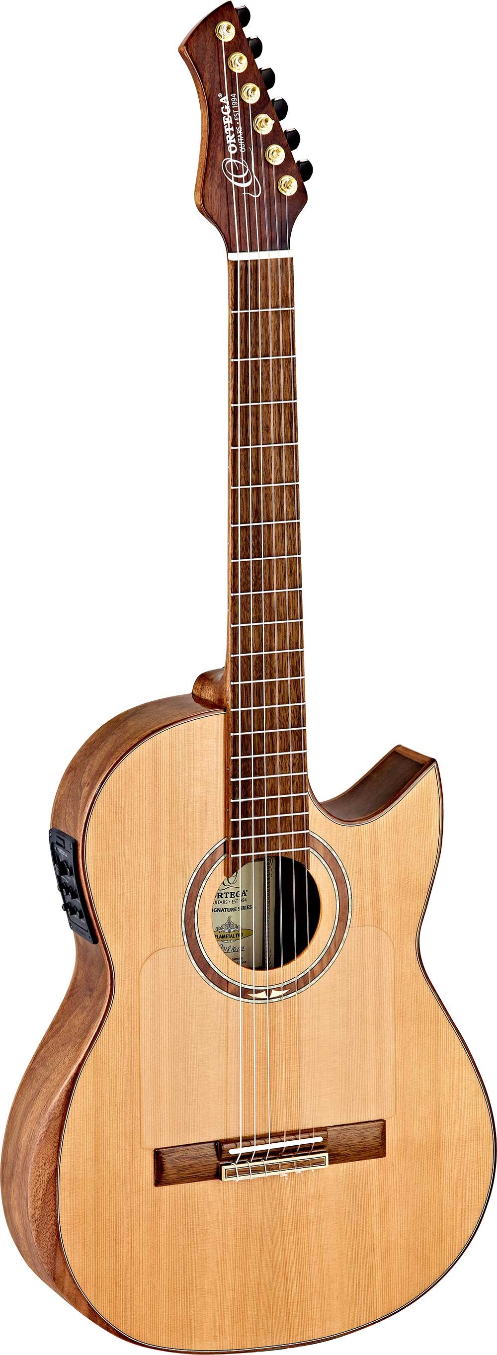FLAMETAL ONE, Ben Woods signature 6-string electrified classical guitar. Slim body (72/75mm) in walnut with laser-engraved image of the 'snake and eagle', without hole, mahogany handle with double truss rod, solid spruce top, fingerboard and wooden bridge. Natural glossy finish Inverted 'metal' style headstock and 'Florentine' cutaway style. Mount Savarez 510CJ strings. Golden mechanics. Classic blend Fishman/Ortega electronics with XLR and jack outputs. Includes double pickguard and signature bag.Dimensions in cm: 110 x 38 x 71. Weight 19.32 kg