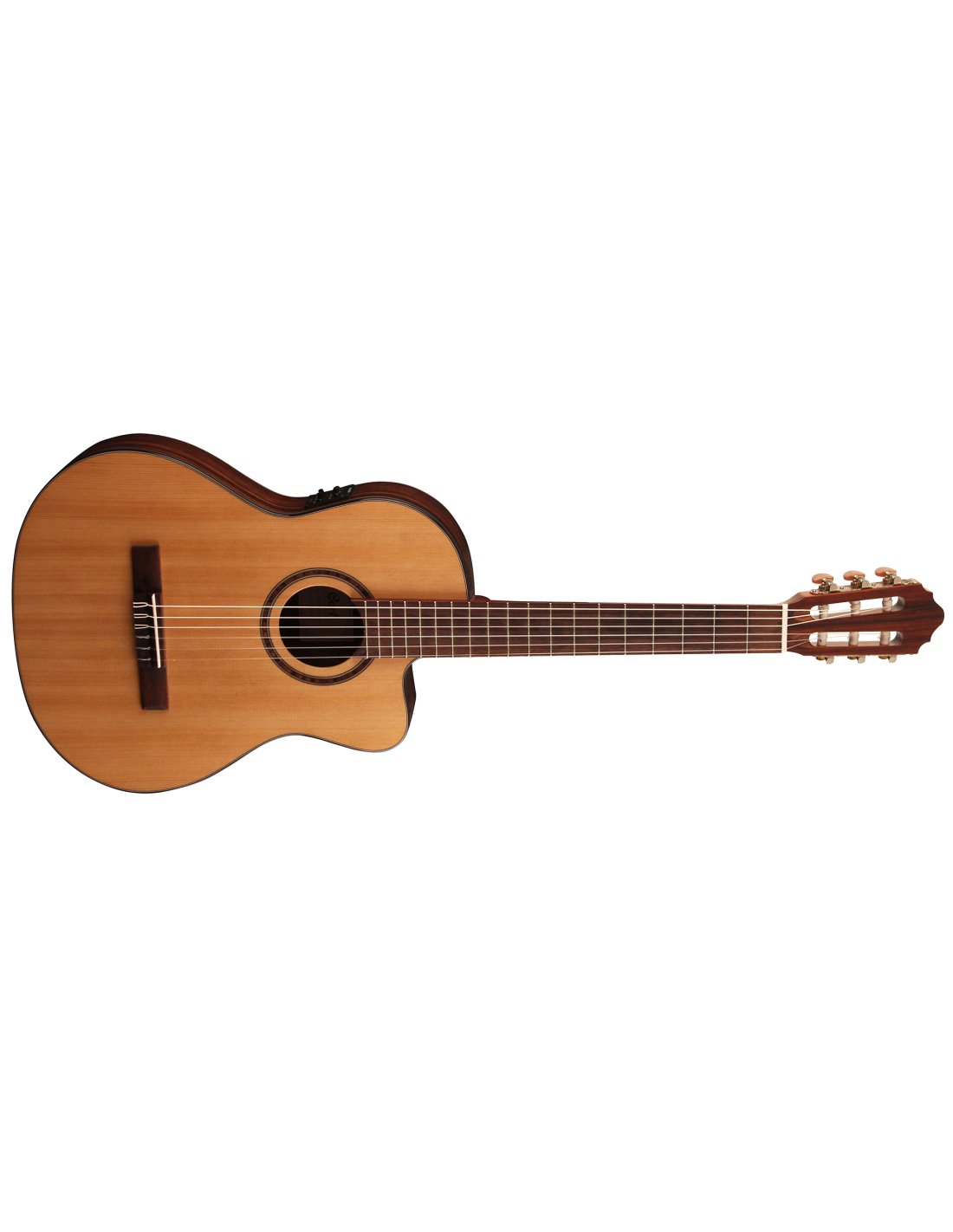 Cort AC160CFTL Classical Guitar color NATURAL. The Cort AC160CFTL is a 6-string electrified classical guitar. Technical features include Macassar ebony back and sides, spruce top, mahogany neck, merbau fingerboard, missing shoulder, Fishman Isys Plus amplification. Bag included.