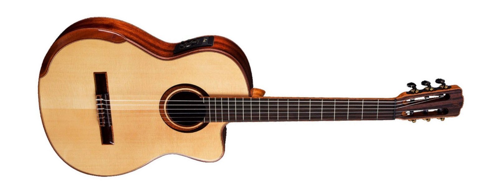 Merida T35CJCES Classical Guitar color NATURAL. The Merida T35CJCES is a 6-string electrified classical guitar. Technical features include solid mahogany back and sides, solid spruce top, mahogany neck, rosewood fingerboard, missing shoulder, Merida/Fishman Isys preamp