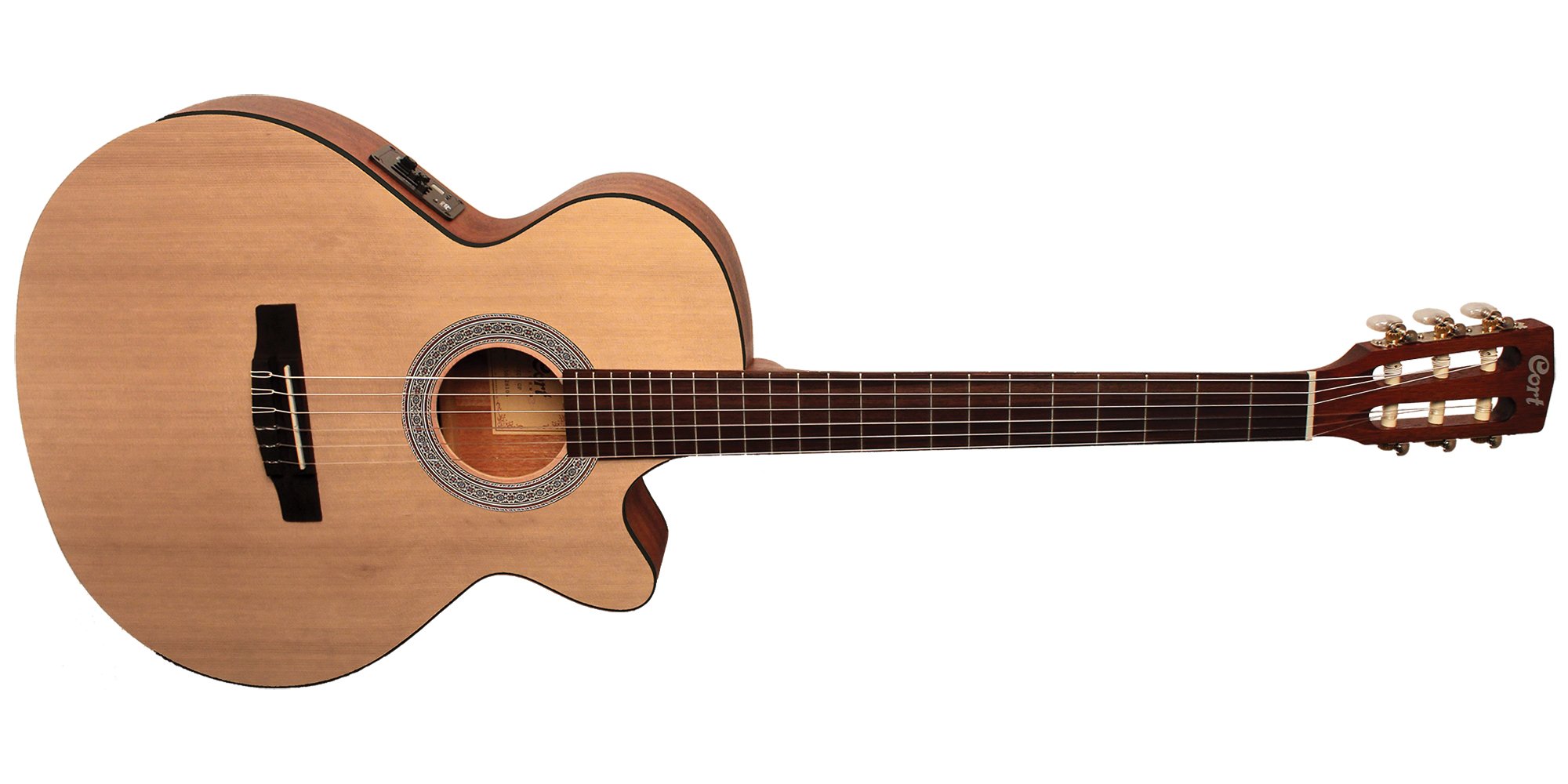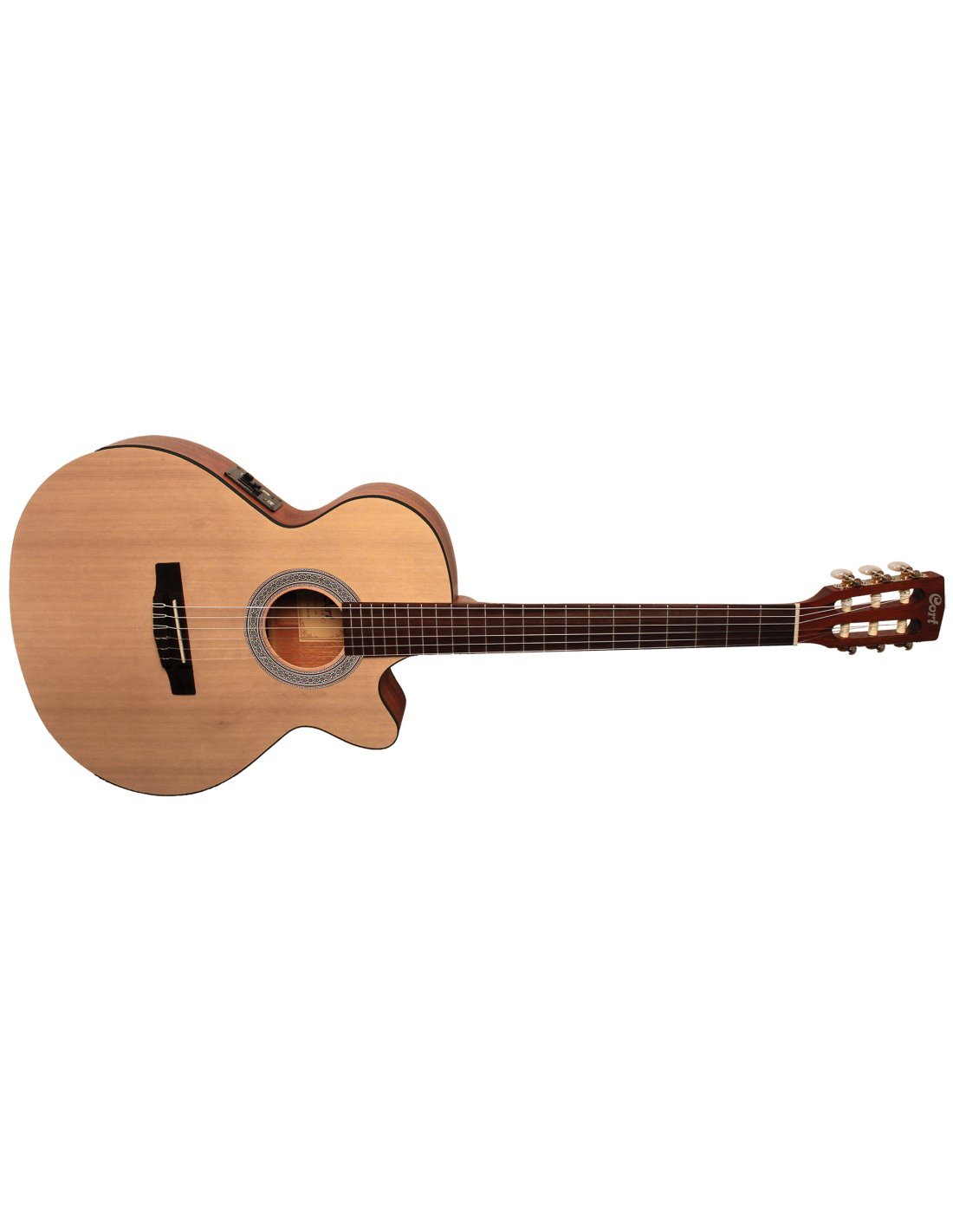 Slim Body Electric Cutaway Classical Guitar. Scale: 25.3 (643mm). Handle-Body Interlock: Dovetail - 14th button. Nut: 45mm (1 3/4). Back and Sides: African Mahogany (Okume). Bracing: Traditional Fan Bracing. Top: Spruce. Handle: Mahogany (Palaquium). Nut: 45mm. Keyboard: Merbau. Mechanics: Cort Classic. Bridge: Merbau. Electronics: Cort CE304T - Ceramic pickup. Strings: D'Addario EXP46N. Color: OP - Open Pore