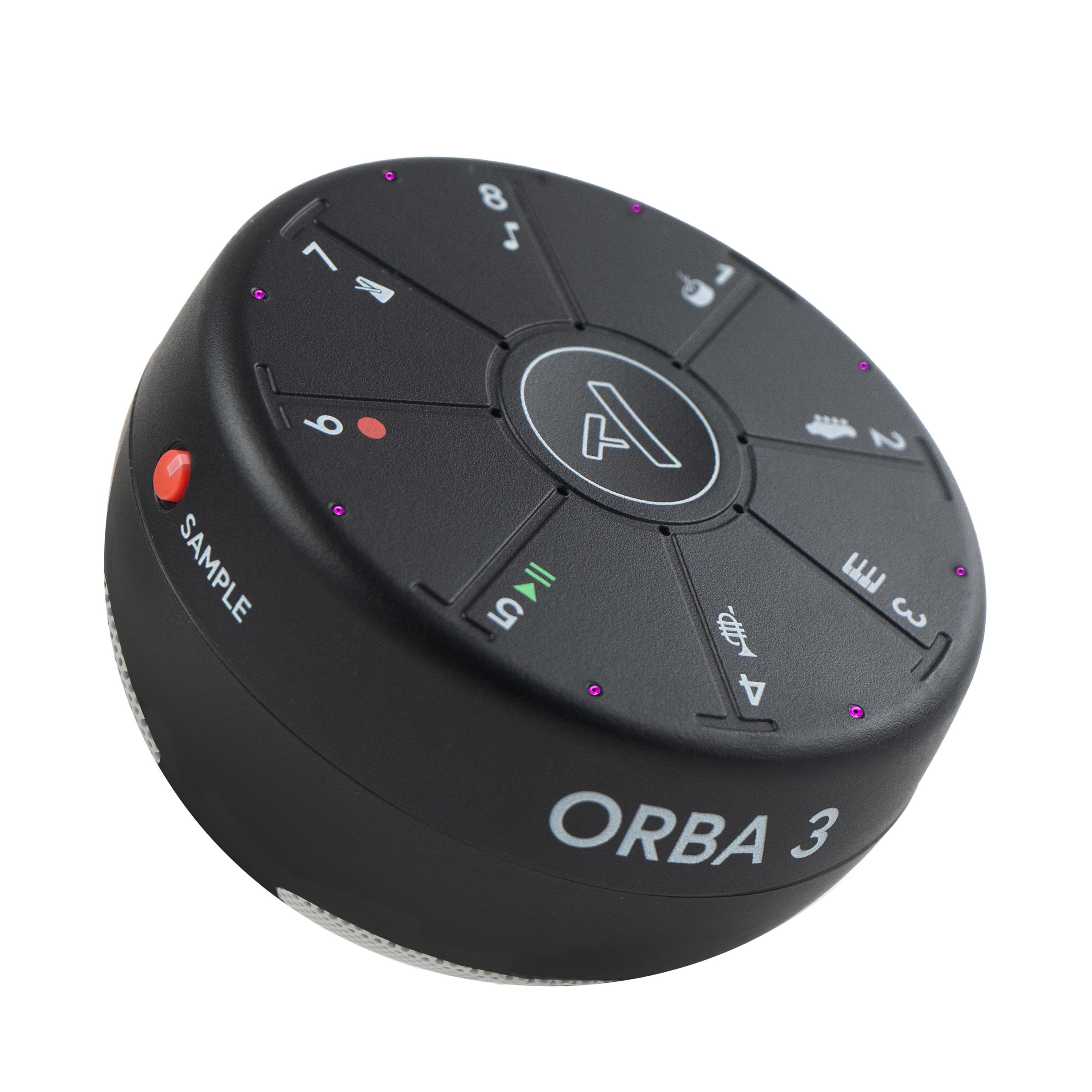 Portable Synth, Looper and MIDI Controller - Enhanced version with Orba 3 microphone makes it easy to turn your musical ideas into reality, wherever you are. The built-in microphone allows you to sample any sound and instantly transform it into a playable instrument. With more than 300 sample-based sounds and a built-in looper, you can create, layer, and perfect your music effortlessly. In addition, MPE MIDI over USB-C and Bluetooth ensure seamless integration with your favorite music creation software, while the built-in speaker, rechargeable battery, and portability make it perfect for creating music anywhere, anytime. New in Orba 3: Integrated microphoneThe new built-in microphone in Orba 3 allows you to sample any sound and instantly transform it into a musical instrument. Without the need for cables or additional devices, you can transform the environment around you into a true symphony: the kitchen drawer becomes an original drum set, while the whistle of the kettle can become a flute. A unique feature of Orba 3 is the ability to use the sampler on one of the four parts. Its intelligent sampling technology analyzes the audio and automatically selects the best part of it, immediately tuning it. In Drums mode, you can sample up to eight different sounds and reproduce them exactly as you recorded them. The bass sample will be tuned to a lower range, perfect for creating the foundation of the track, while the Lead sample will be tuned to higher notes, ideal for melodies. In Chords mode, the sound will be automatically tuned into a harmonious combination of three or four voices. Sounds (real) GoodOrba 3 offers more than 300 high-quality sample-based sounds. From classic instruments such as guitars, pianos and organs, to experimental sounds created with Artiphon's unique synthesizer, the possibilities for inspiration are endless. With the Artiphon Connect app, you can choose from dozens of “Sound Packs” — collections of predefined sounds, ideal for rapidly developing new ideas — or take the time to select the perfect sound for your next masterpiece. Although sampling directly with the new integrated microphone is extremely simple, you can use the Artiphon Connect app to upload your samples and create customized parts for Drum, Bass, Chord and Lead. On LoopoRba 3 has an integrated looper that allows you to easily compose your songs. Thanks to the 'A' button, which acts as a menu, you can immediately start recording directly on the device, without wires or additional screens. You can play by following an intuitive 'click track' as you layer the various parts of your composition. Orba 3 also includes a quantization function that automatically corrects the timing of the notes, aligning them perfectly with the rhythm. If during the performance or recording some notes are slightly out of time, Orba will fix them automatically, always guaranteeing a precise result. Model your soundOrba 3 offers you nine responsive gestures, such as Tap, Tilt, Shake and others, that allow you to further customize your playing style. Even a simple press on Orba is more expressive than traditional electronic instruments: it is sensitive to speed and pressure, allowing you to change the sound even after playing the first chord. By swiping your finger across the surface of Orba (Radiate), you can control the volume of the sound. By tilting it, you can transform the sound with additional effects. In Drum mode, you can shake Orba to make a realistic shaker sound, or hit its side to get a clap or tambourine sound. Thanks to its capacitive sensor interface, Orba detects even the smallest micromovements, making each performance unique and unrepeatable. MIDI connectivity Thanks to the polyphonic MIDI expression (MPE) on USB-C and Bluetooth, Orba 3 takes your musical production to a higher level, ensuring almost non-existent latency for a smooth and seamless experience. Whether in the studio or on the go, Orba integrates seamlessly with software like Ableton Live, GarageBand, and Logic Pro X. You can even map Orba's pads and gestures to your digital audio workstation (DAW), giving you practical and intuitive control over your creations. Overcome the limits set by knobs, keys and buttons and expand the way you play.Music in MotionOrba 3 has been designed to be extremely portable. Its built-in speaker has a power comparable to that of an acoustic guitar, ideal for jam sessions with friends, while the 1/8-inch headphone jack allows you to create music in total privacy. The battery lasts more than five hours with regular use, but Orba 3 can also be used while charging, thanks to the included USB-C cable. The new integrated microphone further expands the potential of Orba 3, allowing you to capture sounds from the surrounding environment, whether at home, in the studio or on the go. Orba 3 has everything you need to bring your creativity to life spontaneously, wherever you are.Main featuresLoop and song builder: create complete tracks by superimposing sounds on four distinct tracks.Instant sampling: capture and play any sound in real time.Portable music creator: take it anywhere thanks to its five-hour battery life and built-in speaker.Smart connectivity: connect it to the Artiphon Connect app via USB or Bluetooth for updates, save samples and share your tracks. Studio MIDI: Use it as a polyphonic MIDI controller (MPE) in your DAW or music production software, via USB or Bluetooth.Technical specificationsWhat does the package contain? Orba 3 Quick Guide USB-C CableDimensions 3.14” (diameter) x 2” (height) I/USB-C (USB 2.0 Class Compliant Audio/MIDI) Stereo output for 3.5 mm (1/8”) TRS analog headphone features8 capacitive sensing padsIntegrated accelerometer and gyroscopeBuilt-in haptic feedback Menu button (A), power button and volume rechargeable battery (+5 hours) Bluetooth LE MIDI (MIDI only) Speaker: Integrated active speaker system 3W omnidirectional MEME microphone high efficiency for samplingCompatibility 