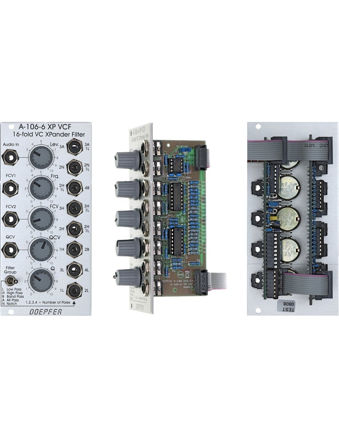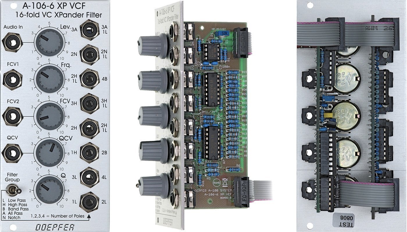 The DOEPFER A-106-6 XP FILTER is a Eurorack module with the Multimode-Filter function with an electronic circuit identical to that of the XPANDER OBERHEIM. The module has 15 filters and it is possible to use a maximum of 8 filters simultaneously. Module width 12 hp.