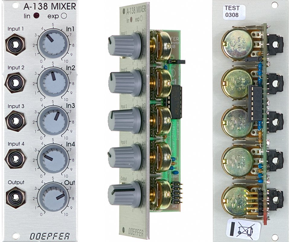 The DOEPFER A-138A LINEAR MIXER is a Eurorack module with the function of a 4-channel mixer ideal for mixing control voltages (CV). Attenuator on each individual input and output channel. Module width 8 hp.