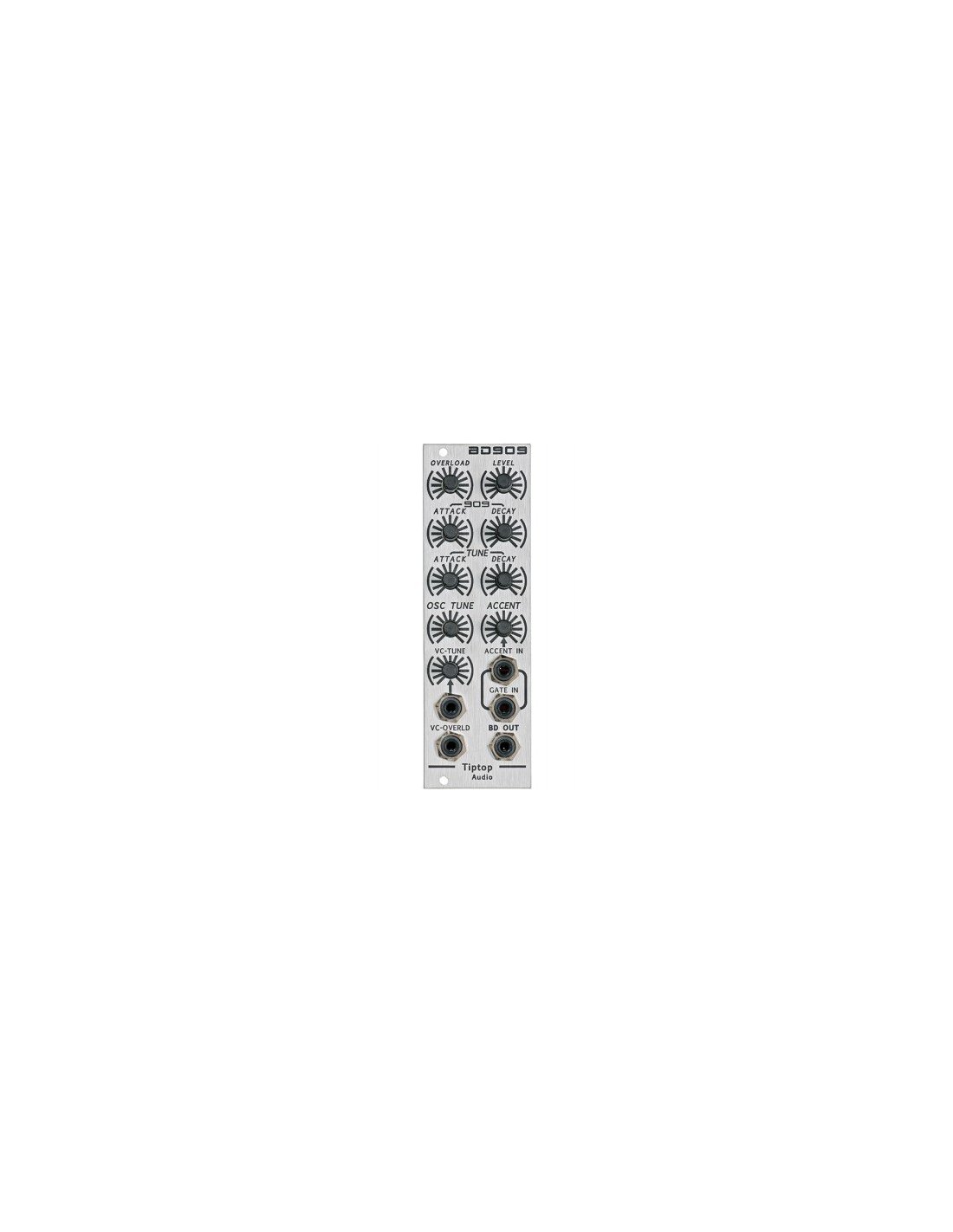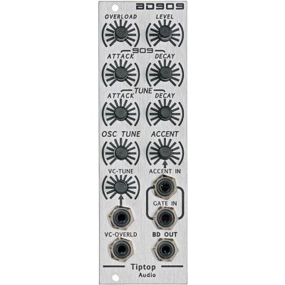 The BD909 TR909 Bass Generator is an 8 HP Eurorack module from Tip Top Audio that replicates the bass drum sound of the famous TR909 drum machine. It is equipped with controls for Attack, Decay, Tune Decay, Accent and Level and additional controls for oscillator tuning with CV input and attenuator, tune attack, extended decay tuning