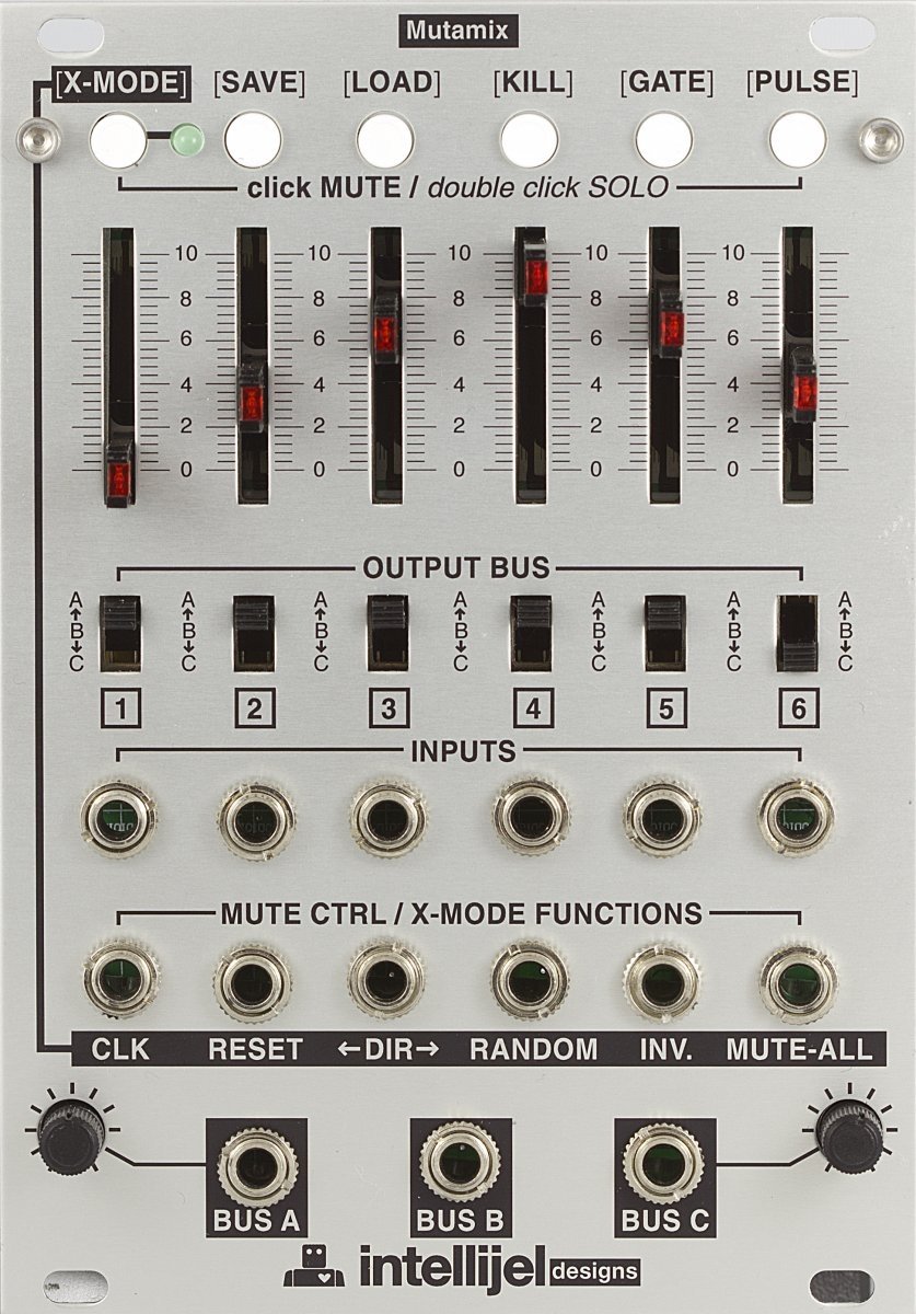 The Mutamix 6 channel CV7Audio Mixer Module is an 18HP Eurorack module from Intellijel. It is equipped with a mixer for audio and CV signals with 6 channels, 3 selectable bus outputs, 6 MUTE CTRL inputs for mute control and an X-MODE mode that allows you to recall six stored mute presets and control them via CV or gate