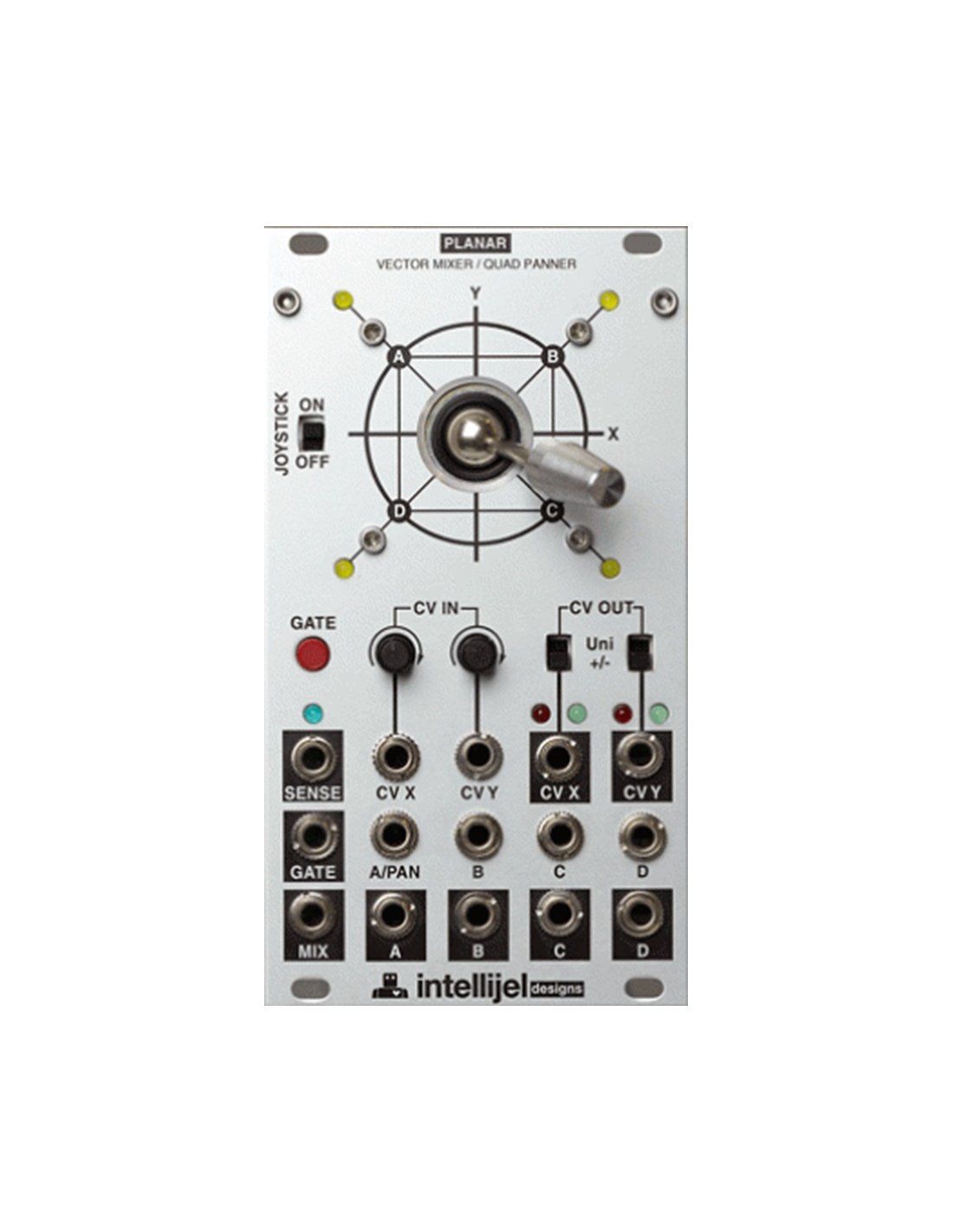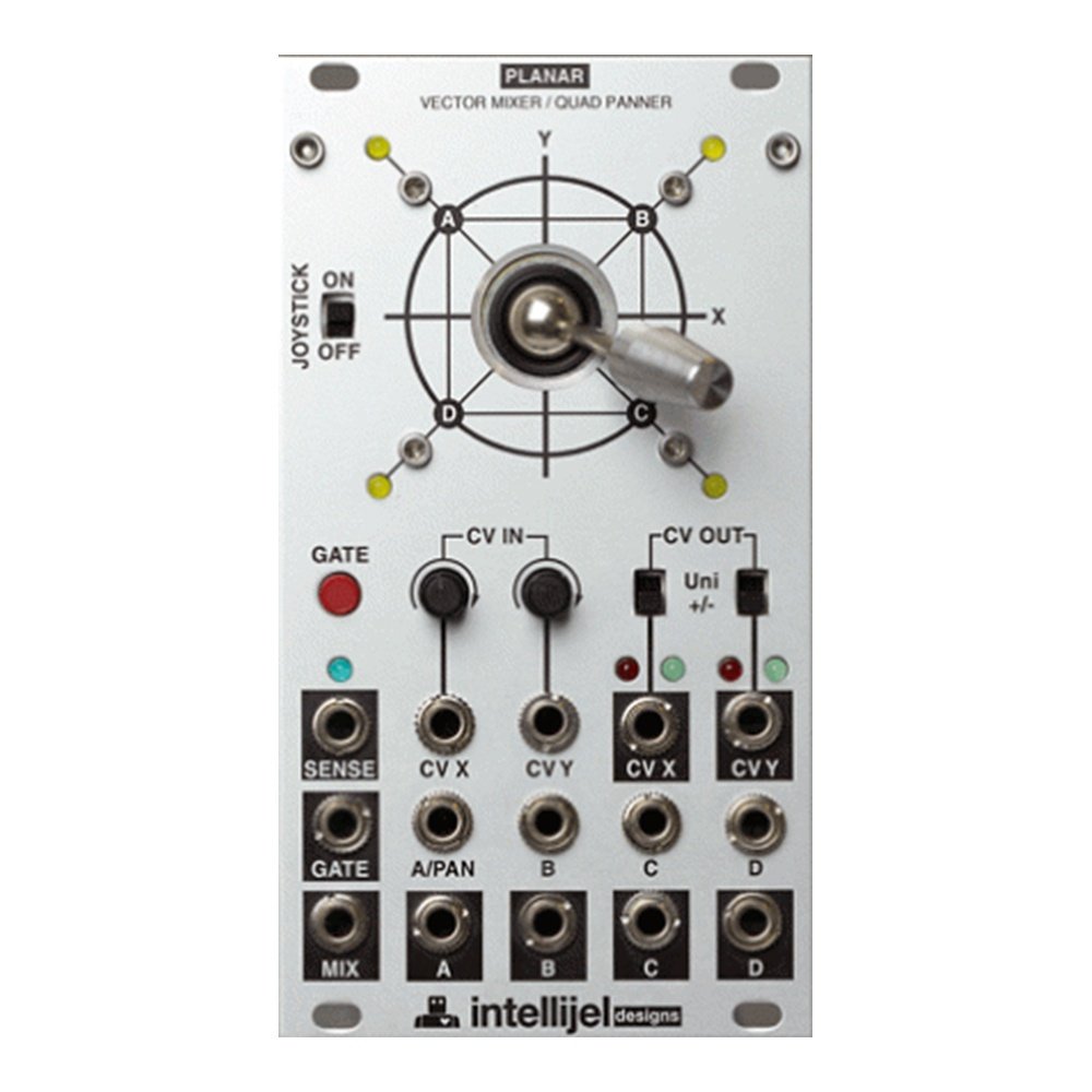 The Planar Joystick Vector Mixer Module is a 14HP Eurorack module from Intellijel. It is equipped with a vector joystick, a quadripanner mixer for audio and CV signals with 4 inputs and 4 outputs, a button to record the joystick movements, reproduce them in a loop and create complex and organic modulations and a mode that allows the joystick to be used as a 4-step
