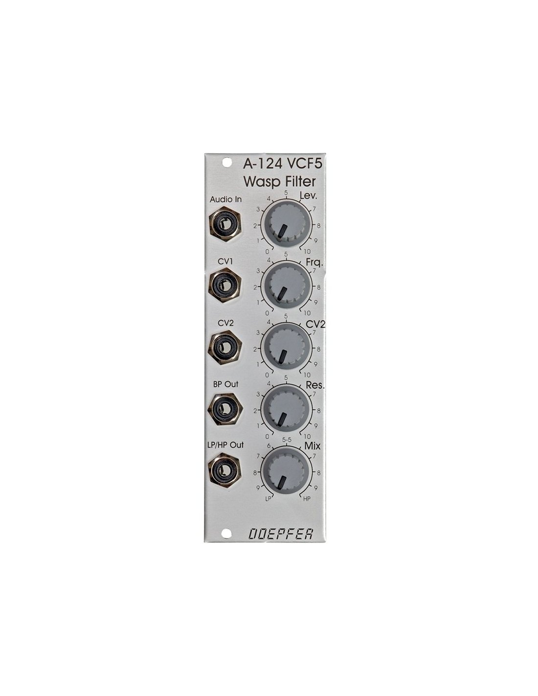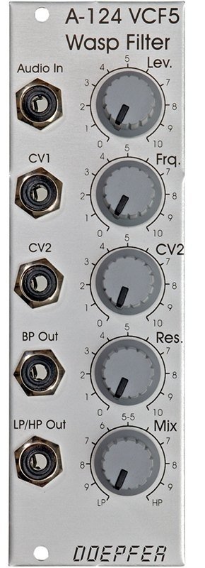 DOEPFER A-124 WASP FILTER MODULAR SYSTEM is a special 12 dB multimode filter that uses the 'strange' filter circuit of the 'EDP Wasp' (an analog synthesizer with black/yellow housing produced by the British company 'Electronic Dream Plant' in the late seventies). In this way, digital inverters would be “misused” as analog operational amplifiers, leading to distortions and other “dirty” effects that generate the specific sound of this filter. The filter has a bandpass output and a combined low-pass/notch/high-pass output. For this output, a control knob controls the relationship between the low pass signal and the high pass signal. If both signals appear at the same level (i.e. the center position of the mix knob), a notch filter is obtained. Otherwise, the low pass or high pass signal predominates
