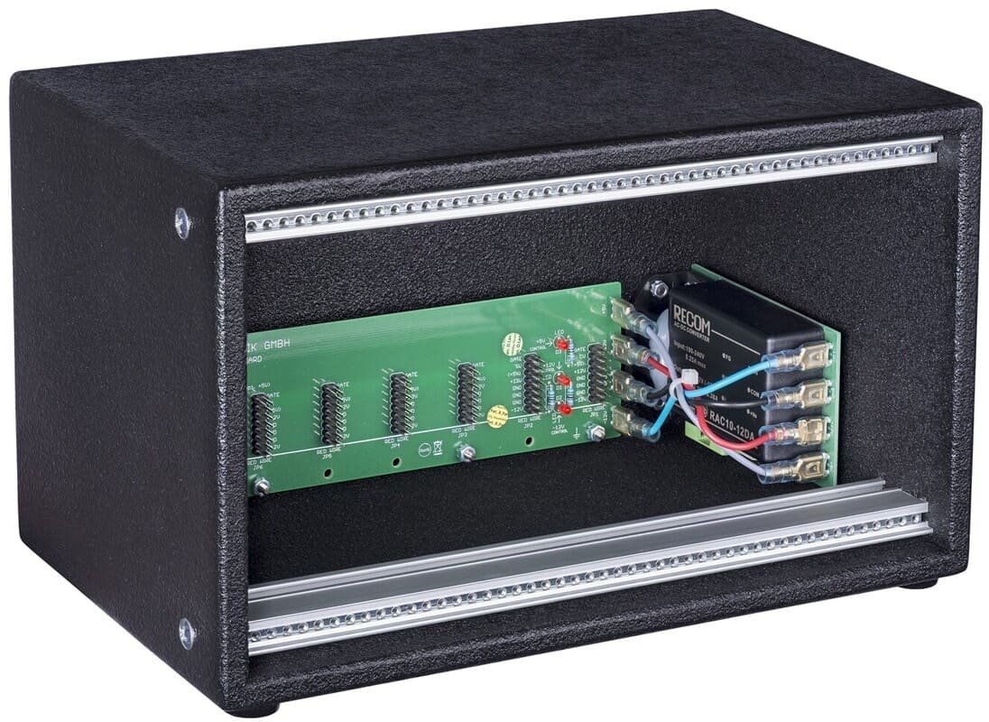 The A-100LC1 48HP Vintage Low Cost Frame is a wooden case for Doepfer Eurorack modules. It is equipped with an A-100SSB power supply with an 8-slot backplane. It has a useful width of 48HP and can accommodate modules up to a depth of about 100 mm