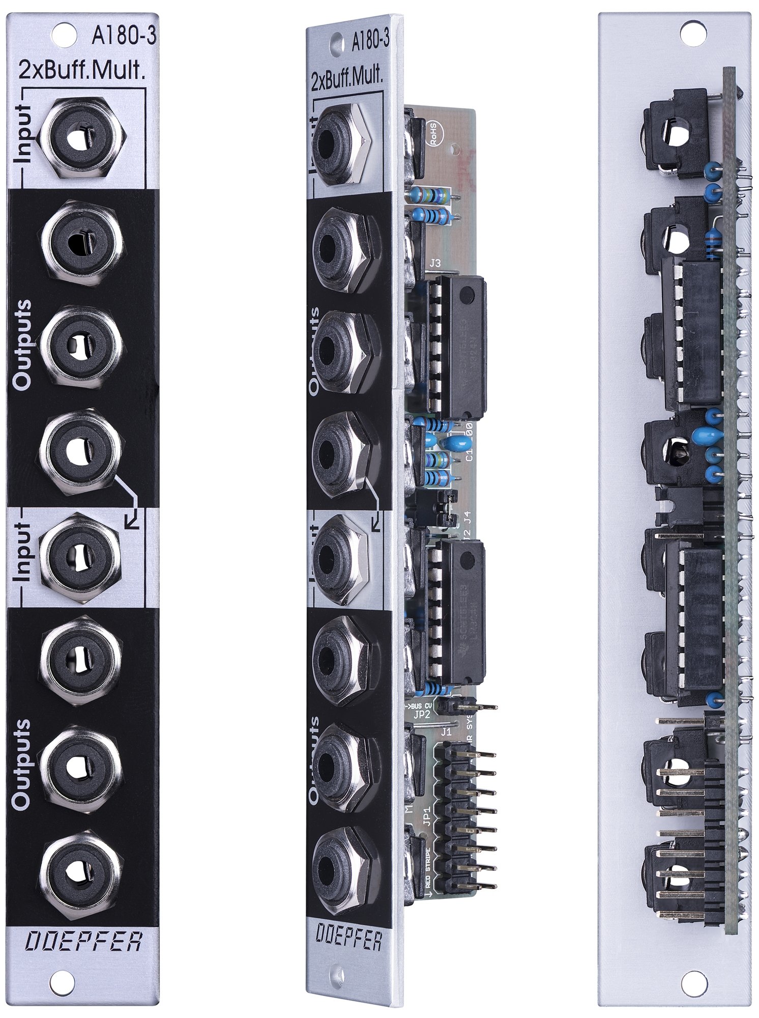 DOEPFER A-180-3 is a passive Eurorack module that allows you to duplicate an audio or control (CV) signal output on three separate sockets. It features a single input and 3 buffered outputs, preventing potential impedance problems and crosstalk