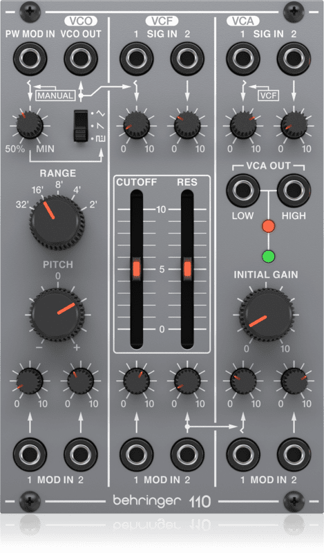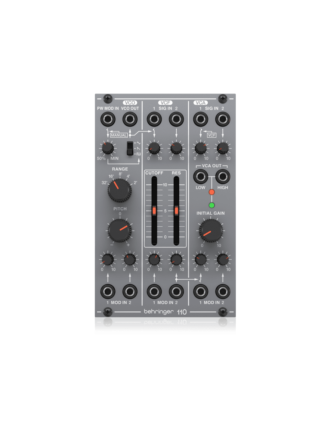 BEHRINGER 110 VCO/VCF/VCA is an analog VCO/VCF/VCA synthesizer module for Eurorack. It is a faithful reproduction of the '80s “System 100" circuit module and is divided into 3 sections: the VCO section has 3 selectable waveforms with level control, Pitch and Range knob controls. The VCA section has a dual Line/Hi-Z output, initial Gain control and volume controls on the 2 inputs. The VCF section has 2 faders for cutoff and resonance control with level controls on the