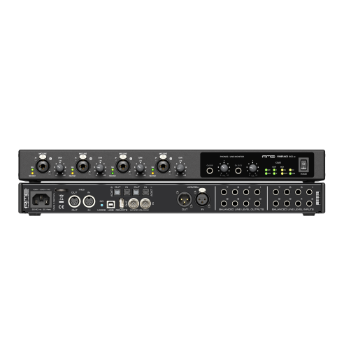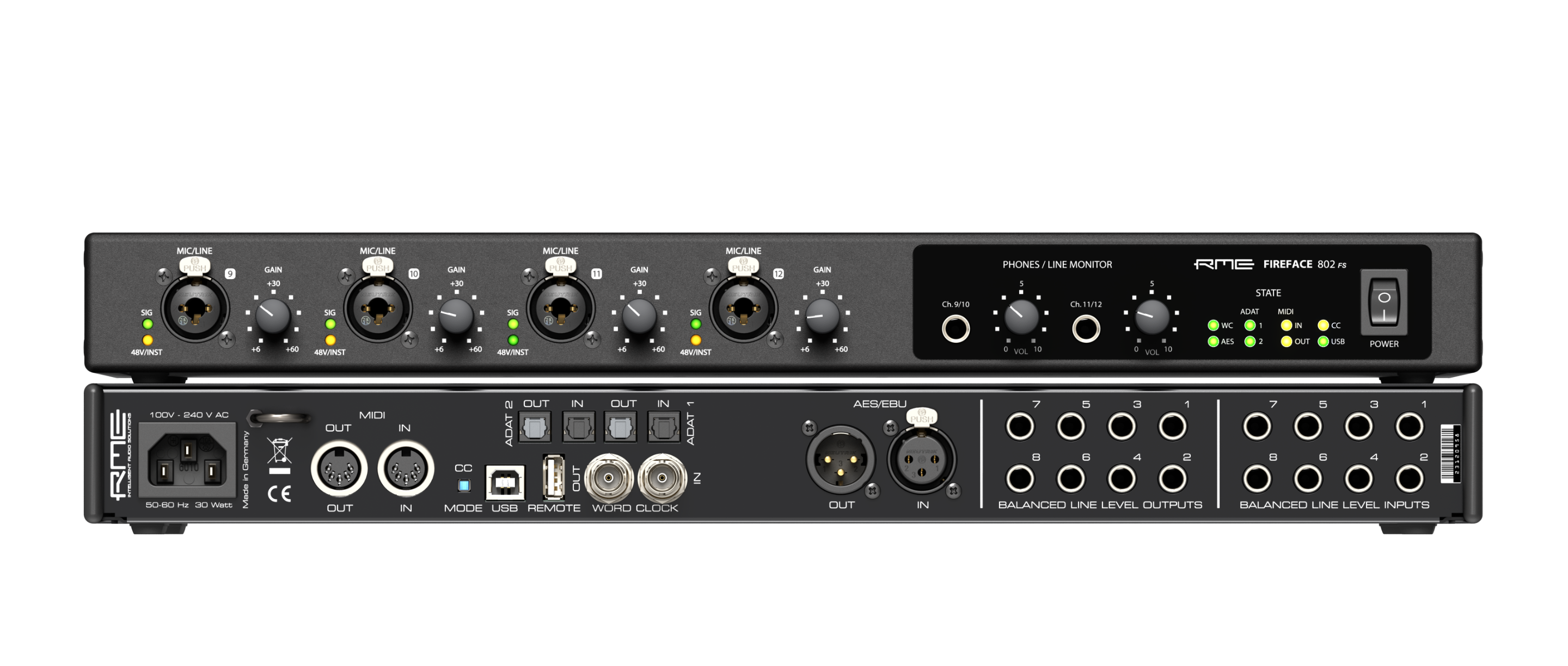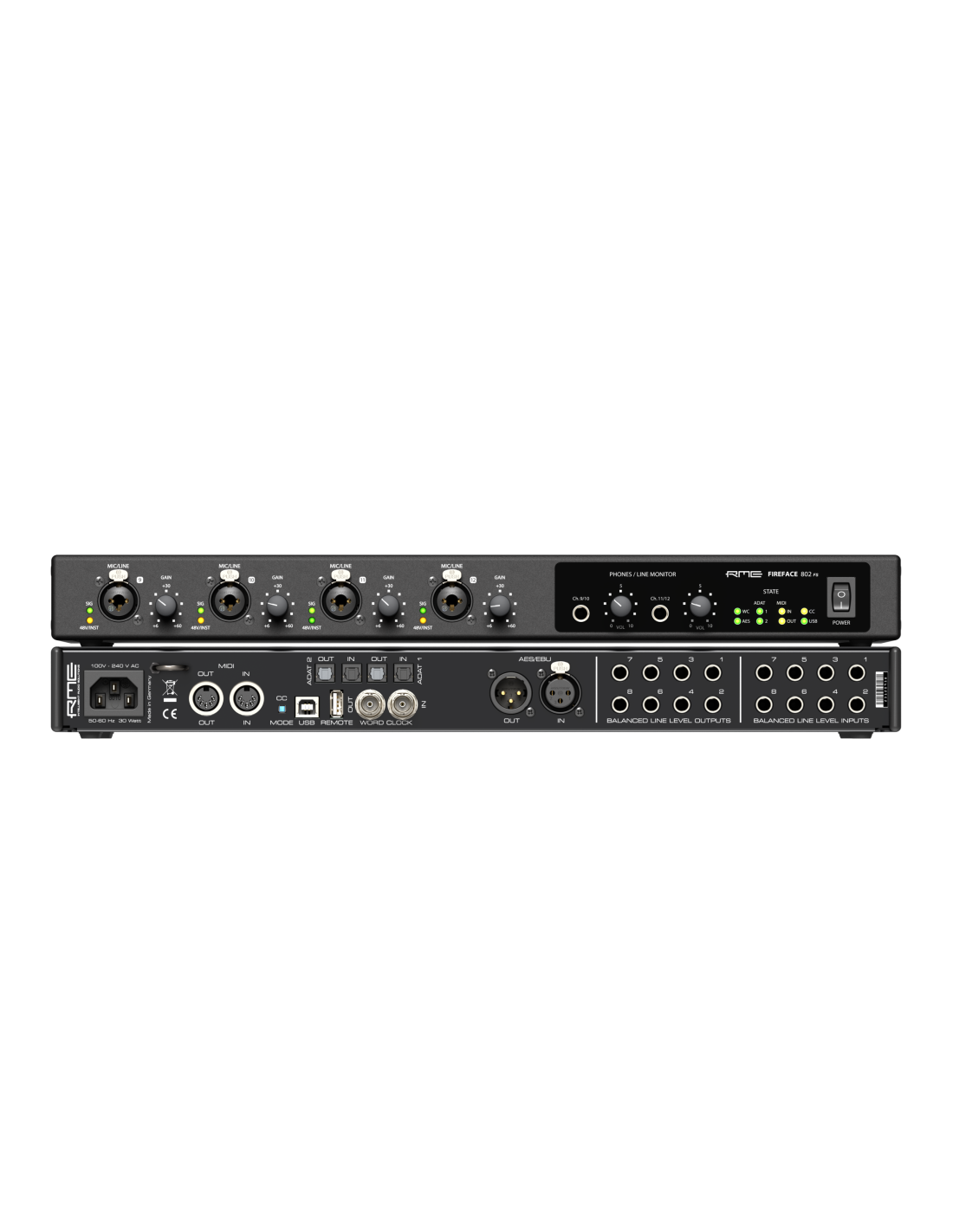 60-channel USB/FW Audio Interface - 192 kHz/24 bit Anniversary Edition The Fireface 802 FS AE is a highly integrated professional audio solution, ideal for both studio and live use, enclosed in a 19" rack unit. Designed for those looking for an uncompromising interface in terms of sound quality, stability, and ultra-low latency operability, and who want an unparalleled set of professional features. Once again, RME has set a new standard with an interface that includes the best of the best and also something more. 60 audio channels, high-quality microphone preamplifiers, reference class converters, a complete effects section and operation up to 192 kHz, are just the basis of many other features.Improve your recording setup with maximum flexibilityThe Fireface 802 FS AE offers ultra-low latency operation thanks to RME's USB 2 technology, combined with the legendary stability of the RME drivers. The SteadyClock FS technology for reducing jitter, TotalMix FX's latest Room EQ function, individually selectable reference levels for all inputs and outputs, full stand-alone functionality and identical operation on Windows PCs and Macs complete the package. Technically, the Fireface 802 FS AE is based on the proven Fireface 802 FS model, offering the same powerful features, including precise AD/DA conversion, flexible I/O options, and the same high audio quality enjoyed by professionals for over two decades. 20 Years of Fireface 800The Fireface 802 FS AE follows the RME tradition of providing flexible and expandable audio systems. On the front side there are four high-performance XLR/TRS combo inputs for microphones, instruments and line signals, as well as two stereo headphone jacks with an output level of +17 dBu, able to guarantee high volumes even with high impedance headphones. In the back you can discover the entire connectivity of the Fireface 802 FS AE: in addition to the MIDI and Word Clock I/Os, there are two ADAT optical I/Os, an AES/EBU I/O and eight balanced line-level analog inputs and outputs. With the new Multi-Mode mode, the two ADAT I/Os can be used as separate optical SPDIF inputs and outputs, in addition to the AES I/O. There is also a USB A port for directly connecting the optional USB ARC. Powerful applications for mixing, monitoring and measurement. The Fireface 802 FS AE includes the TotalMix FX DSP mixer, which offers comprehensive routing and monitoring options, as well as the DigiCheck Analyzer for accurately measuring and analyzing digital data in both directions. TotalMix FX can completely replace an external mixer, allowing the creation of multiple zero-latency monitor mixes with EQ, dynamics, reverb and delay on any output, including the main outputs and mixes for the musicians' headphones. The new Room EQ function optimizes the management of the existing 3-band parametric equalizer in TotalMix FX, adding a 9-band equalizer, volume calibration and the Crossfeed function, ideal for immersive and surround audio configurations. In addition, TotalMix Remote allows you to remotely control TotalMix FX on iPad and Windows/Mac computers, reflecting the current state of the host system, including mix, routing and FX settings, in real time. You can adjust all mixer settings and effects remotely via Ethernet or WiFi.Audio USB 2 Class CompliantThe Fireface 802 FS AE operates in two different modes: USB 2 with driver and Class Compliant mode. Class Compliant mode is a standard that is natively supported by operating systems such as Windows, Mac OS X and Linux. No proprietary drivers are needed, the device is recognized directly once the CC firmware is loaded. This mode can be activated through a button on the back of the interface. The Fireface 802 FS AE offers full USB 2.0 support in Class Compliant mode, making all channels available in driverless mode on Linux, Mac and iPadOS. An iPad Pro with a USB-C port can handle up to 60 channels for recording and playback in TotalMix FX for iPad and at the system level. DC-Coupled Outputs - CV/Gate voltage controlMost audio interfaces are traditionally designed with AC-coupled outputs, which use capacitors to filter very low frequencies. Although these frequencies are generally considered undesirable for audio, there is a case in which DC-coupling is preferable: in the world of modular synthesizers, where static or low frequency signals are used to control various parameters such as pitch or LFO. All Fireface 802 FS AE line outputs are fully DC-coupled, allowing control voltages (CV) or Gate signals to be sent to modular synthesizers (Eurorack, MOOG/MOTM formats and others) and other studio equipment. USB ARC Remote Control - Plug'n PlayThe optional ARC USB accessory connects to the computer via USB and integrates directly with TotalMix FX. It has 15 freely assignable and backlit keys, an encoder and a TS jack for connecting a pedal. The ARC USB is a MIDI remote control for the Fireface 802 FS AE and, being a UAC 1 device, it is natively compatible with Windows and Mac OS X. As soon as connected, TotalMix FX automatically detects the USB ARC and communicates with it through simple MIDI commands to control the Fireface 802 FS AEAnalogical AD, Line In 1-8, RearInput: 6.3 mm TRS, electronically balanced Signal-to-Noise Ratio (SNR) @ LogAin: 116 dB (AES17), 118 dBA Signal-to-Noise Ratio (SNR) SNR) @ +4 dBu: 115 dB (AES17), 117 dBA Frequency Response @ 44.1 kHz, -0.1 dB: 8.9 Hz — 20.4 kHz Frequency response @ 96 kHz, -0.5 dB: 4.3 Hz — 45.2 kHz frequency response @ 192 kHz, -1 dB: 3 Hz — 89 kHz THD @ -1 dBFS: < -120 dB, < 0.0001% THD+N @ -1 dBFS: < -110 dB, 110 dB Maximum input level: < 0.00032% Separazione dei canali: > +19 dBuMicrophone inputs 9-12, frontalInput: XLR, electronically balanced Input impedance: 3.4 kOhmS/N ratio (SNR) R): 113 dB unweighted RMS, 116 dBA Gain range: 54 dBMaximum input level, Gain +6 dB: +10 dBu Maximum input level, +60 dB gain: -44 dbuInstrument inputs 9-12, frontalInput: 6.3 mm TS, unbalancedInput impedanc