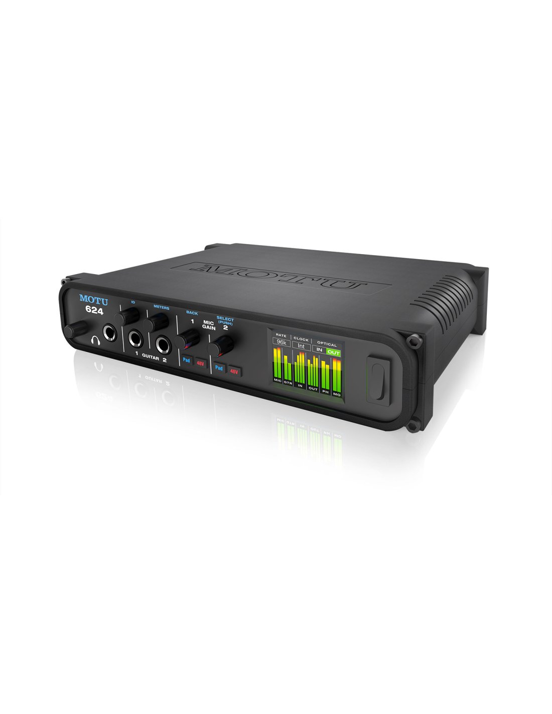 MOTU 624 is a 16x16 Thunderbolt/USB3 audio interface with DSP and networking that implements the renewed ESS SABre32 Ultra DAC technology. It offers 32 simultaneous audio channels, 2 microphone inputs, 2 instrument inputs, 4x6 balanced analog outputs, 8 ADAT optical channels and independent headphone output for 16 inputs and 16 outputs. The optical ports support Stereo TosLink (optical S/PDIF). The MOTU 624 technology is characterized by a dynamic range of 123dB, with the same quality as the 1248 flagship. The drivers have ultra-low latency: 1.6ms at 96kHz via Thunderbolt and 1.9ms via USB. The MOTU 624 mixer offers 48 digital inputs, 7 Stereo Aux buses, 3 groups, access to 64 input networks and 32-bit float DSP effects, including Reverb, 4-band EQ, Gate and Compression. The control software is a web app created by the hardware itself, therefore, through access to the same local Wi-Fi, you can control the mixer from any client (Mac, Windows, iOS, Android). MOTU 624 also includes the AudioDesk workstation (Mac and Windows) with 24-bit recording and 32-bit mixing/mastering