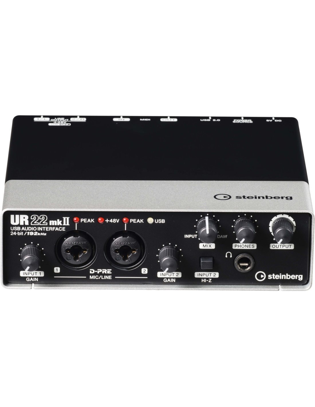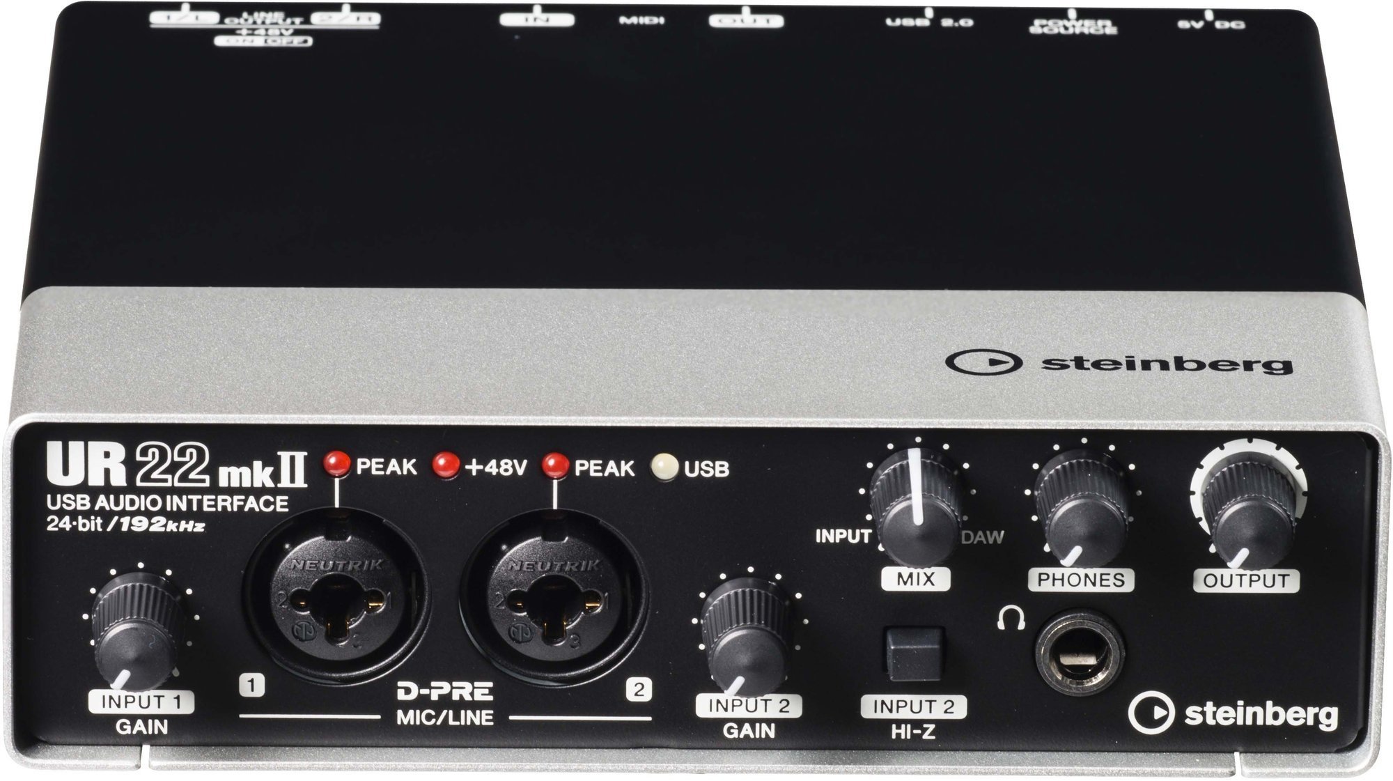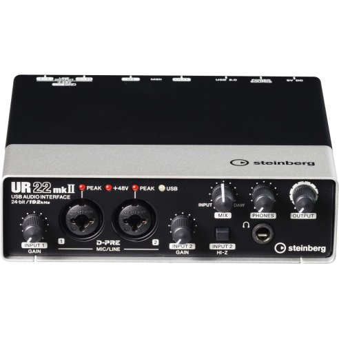 The UR22 MK II is a USB sound card from Steinberg. The UR22 MK II provides 2 inputs with D-Pre preamp, one of which is equipped with a Hi-Z switch to connect a guitar or bass, and 2 outputs, in addition to the MIDI IN/OUT outputs. This Steinberg sound card is capable of recording 24-bit/192kHz audio, it is compatible with