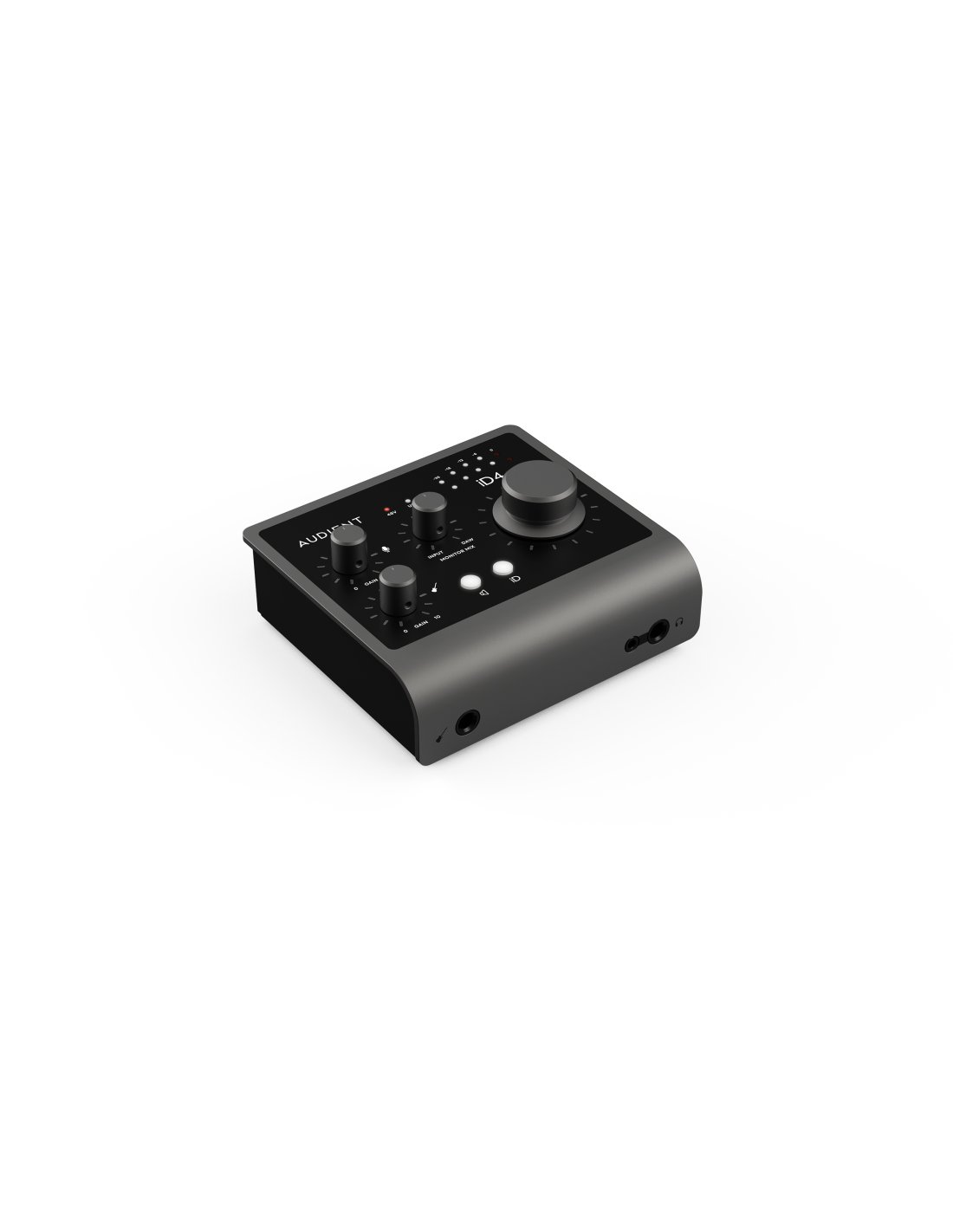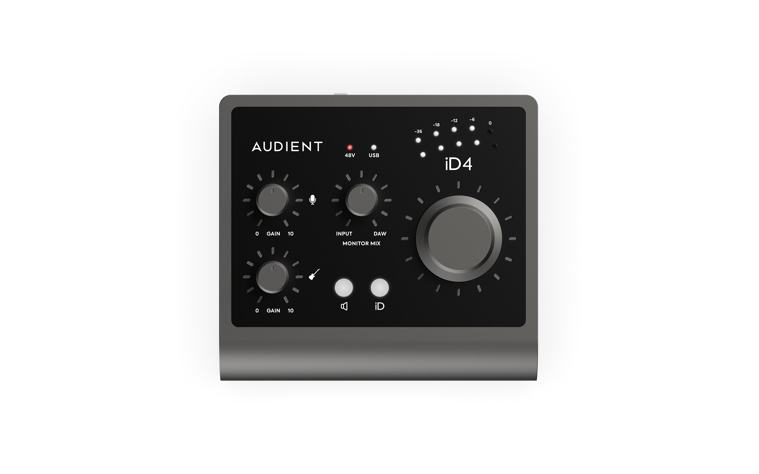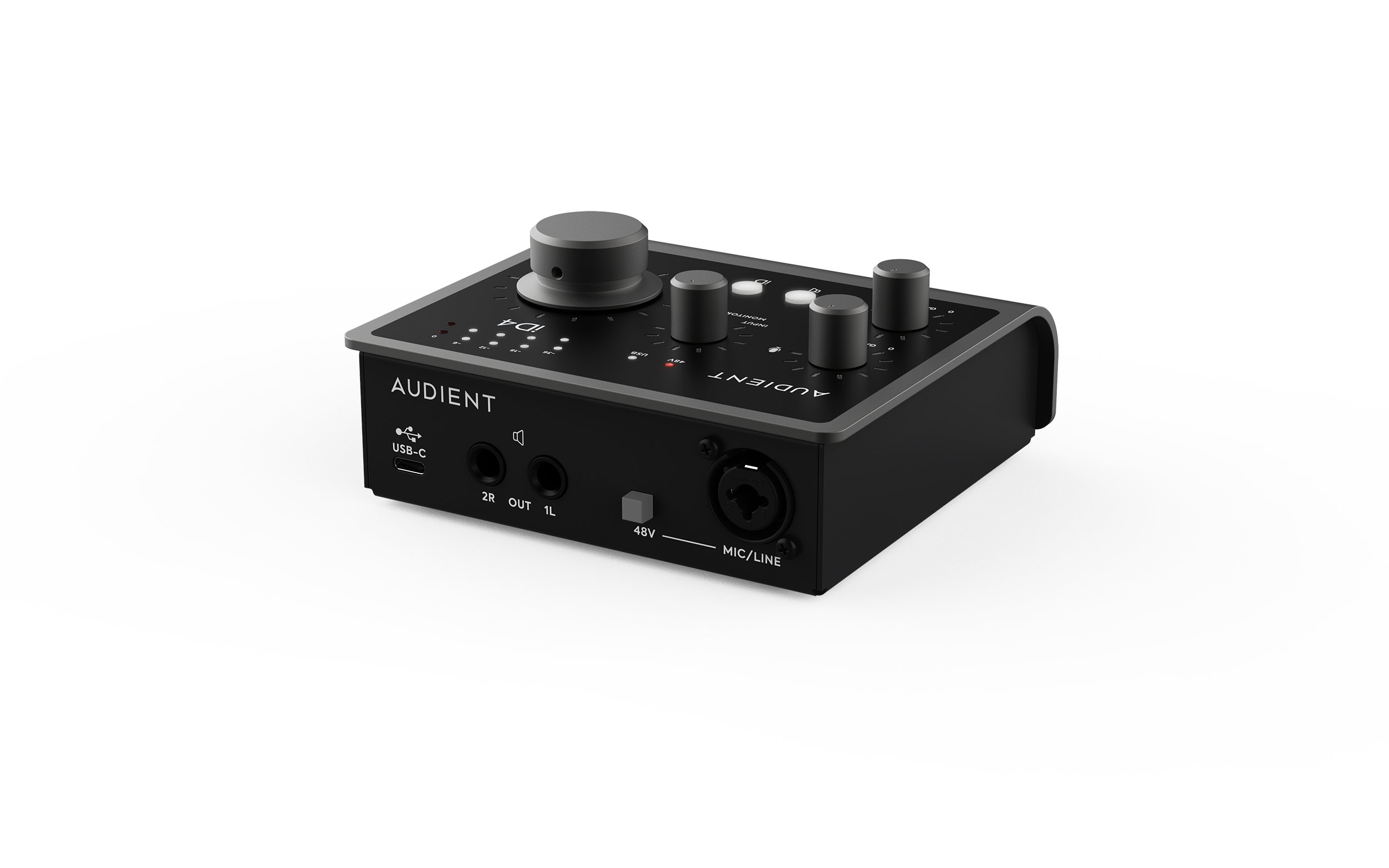 AUDIENT ID4 MKII. USB-C audio interface with 2 Inputs and 2 Outputs. Technical features include Class A microphone preamplifier with +48v phantom power, JFET instrument input, high-performance converters with 120dB of dynamic range, Zippy USB 3.0 data transmission, 2 headphone inputs, ARC software suite included with the DAW (virtual instruments, FX plug-ins), ScrollControl function that allows the large volume knob to change DAW/plug-in parameters. Compatible with macOS and Windows